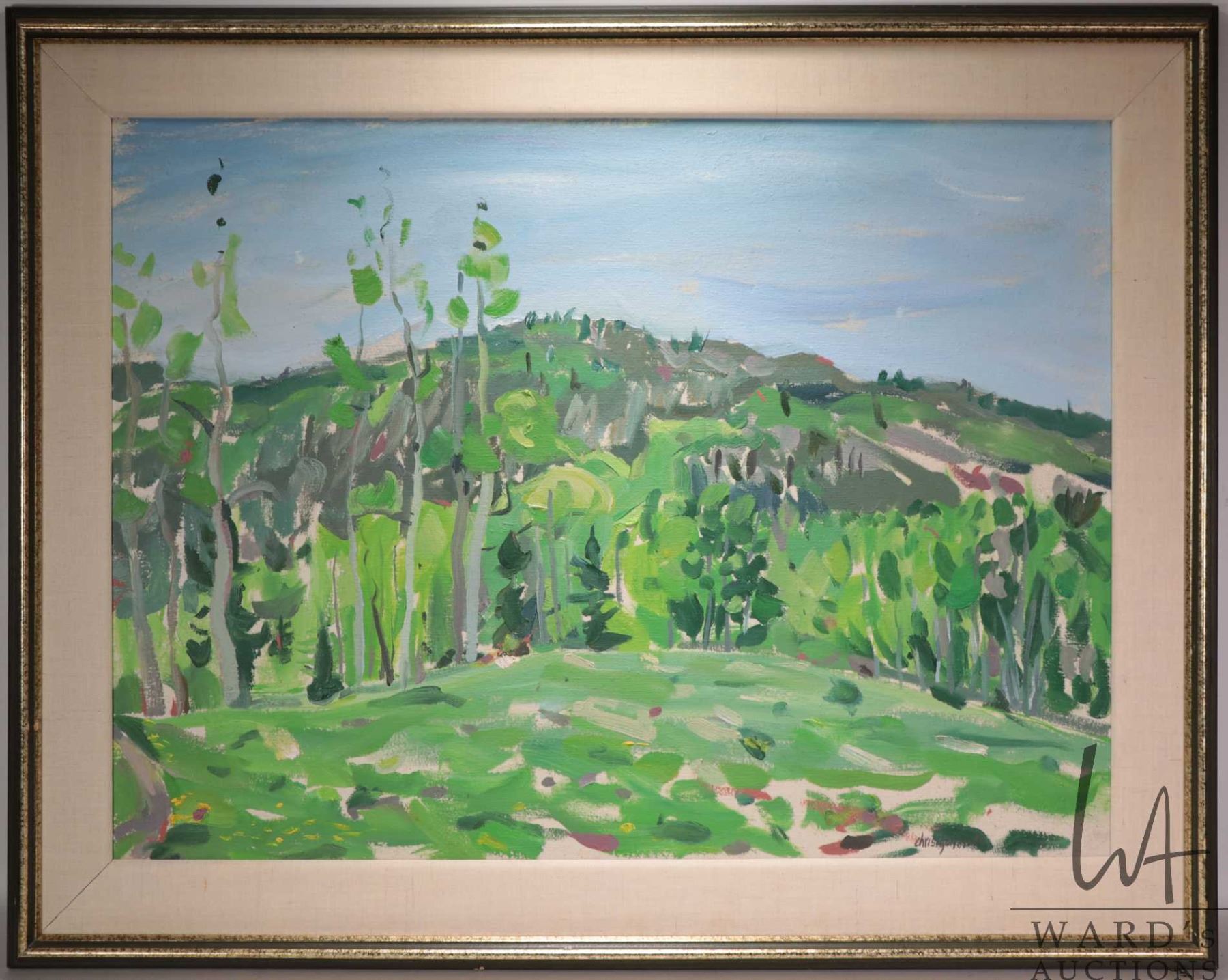 Framed acrylic on canvas painting, tittled on verso "Spring Green, Bow River Forest" signed by artis