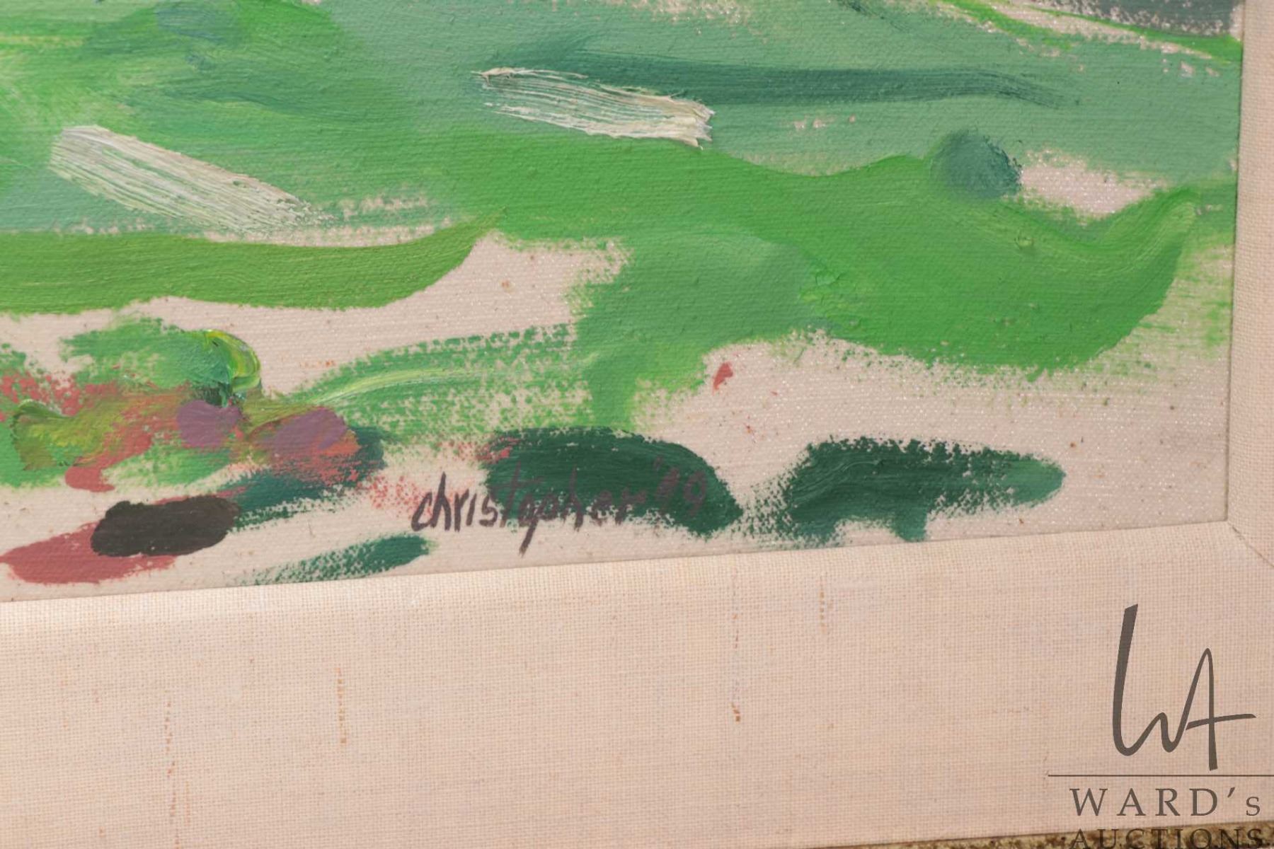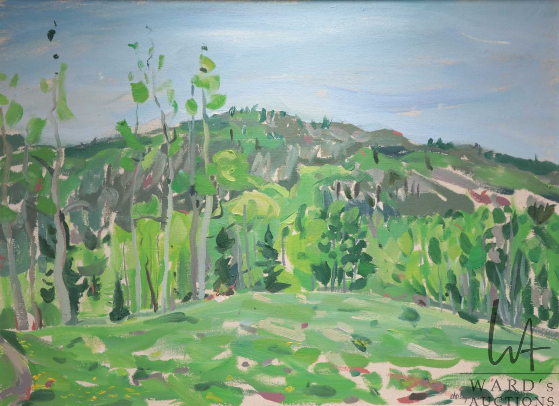 Framed acrylic on canvas painting, tittled on verso "Spring Green, Bow River Forest" signed by artist Christopher '90, 24" X 33". Note: Artwork cannot be insured and is often too large to ship. Local pickup.