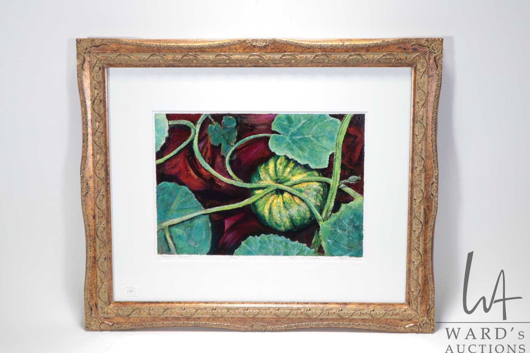 Framed acrylic on paper painting titled "Melons" by artist Dennis Yowney 2020, 10" X 14"