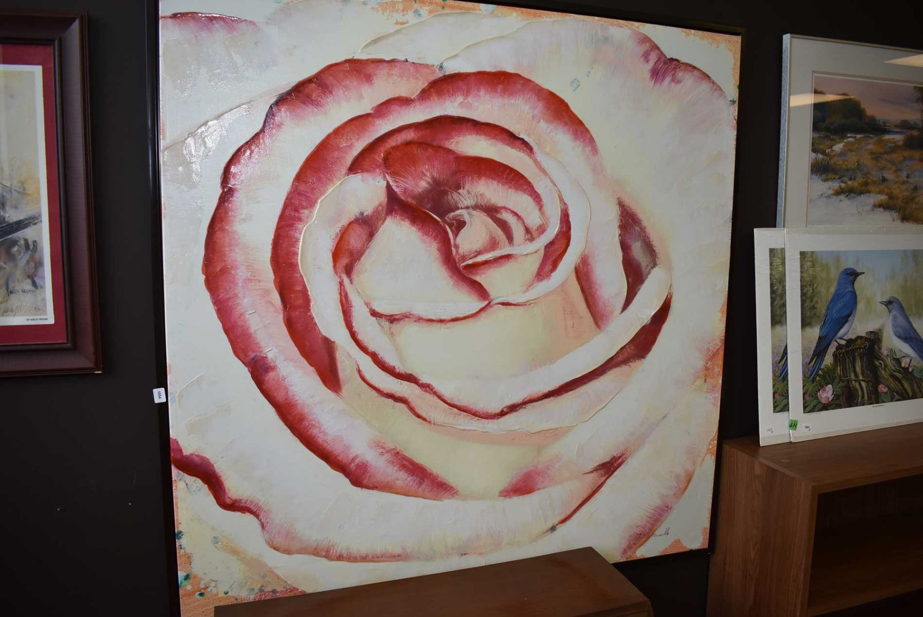 Framed artist signed acrylic on canvas painting of a rose, 45" X 45"