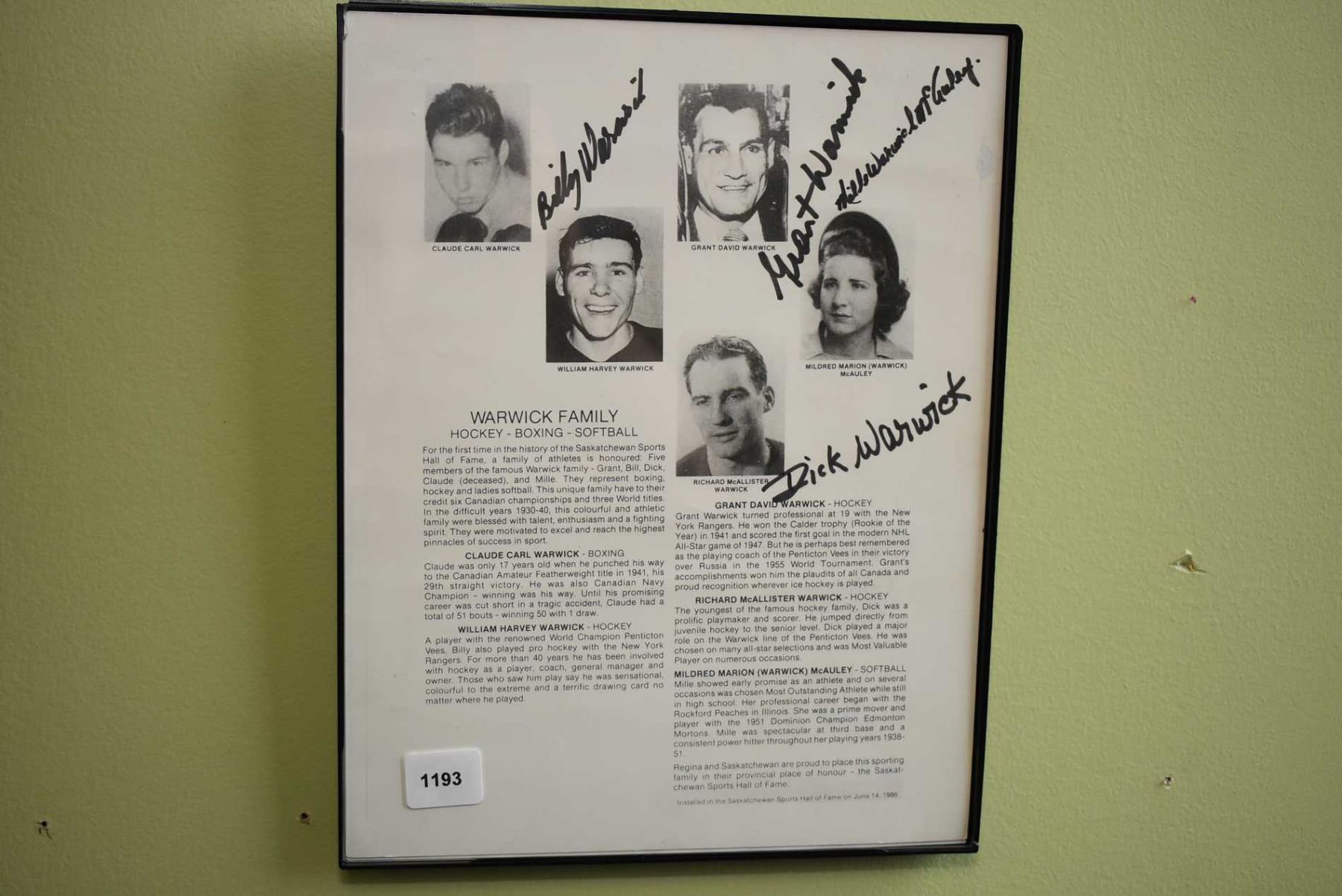 Framed autographed "Warwick Family" with unverified signatures from Billy, Grant, Richard and Mildred
