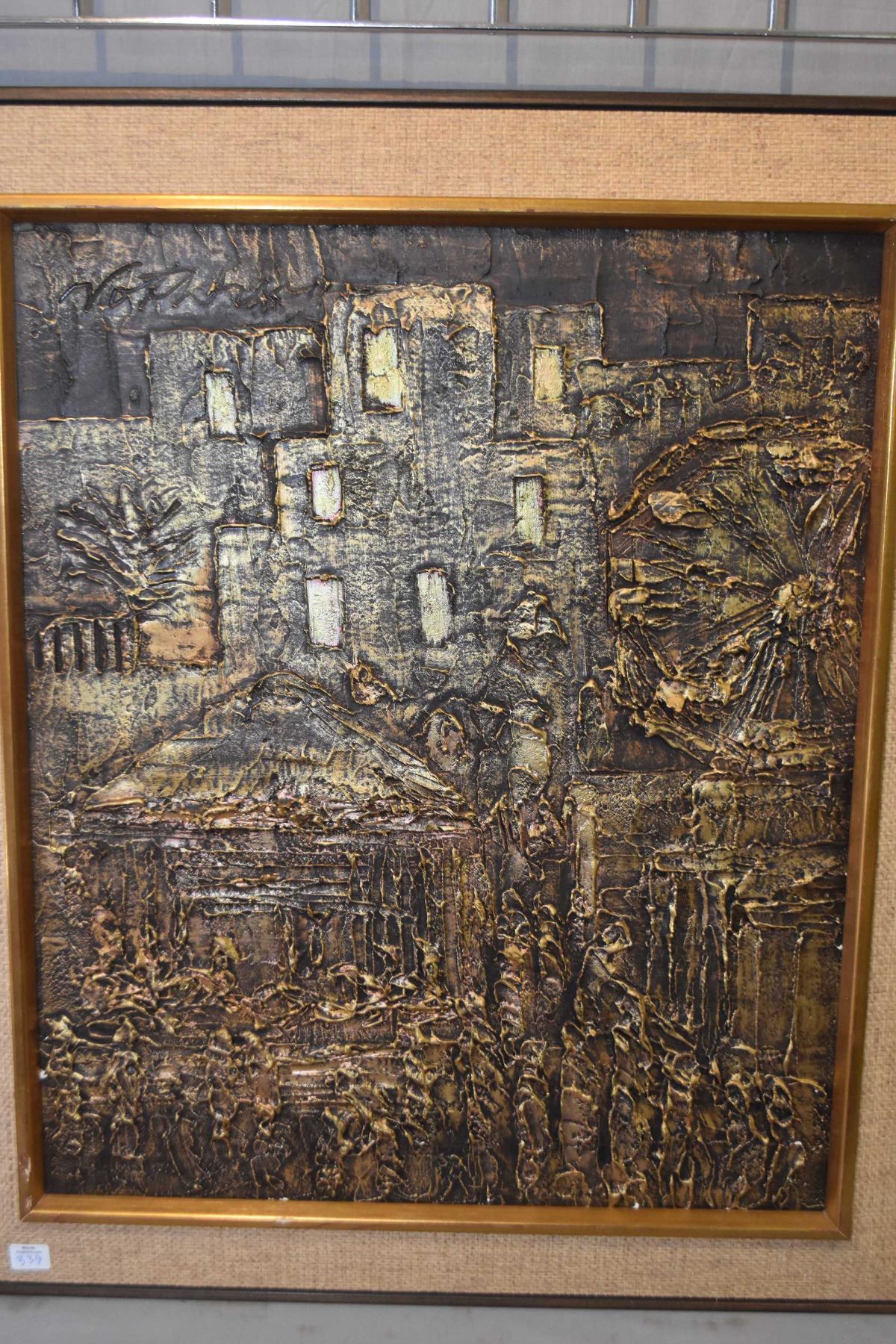 Framed bas relief copper toned abstract fair ground scene, 24" X 20"