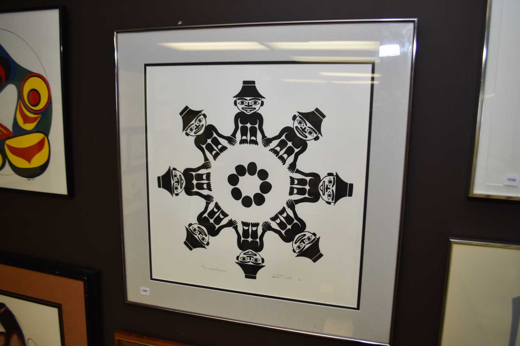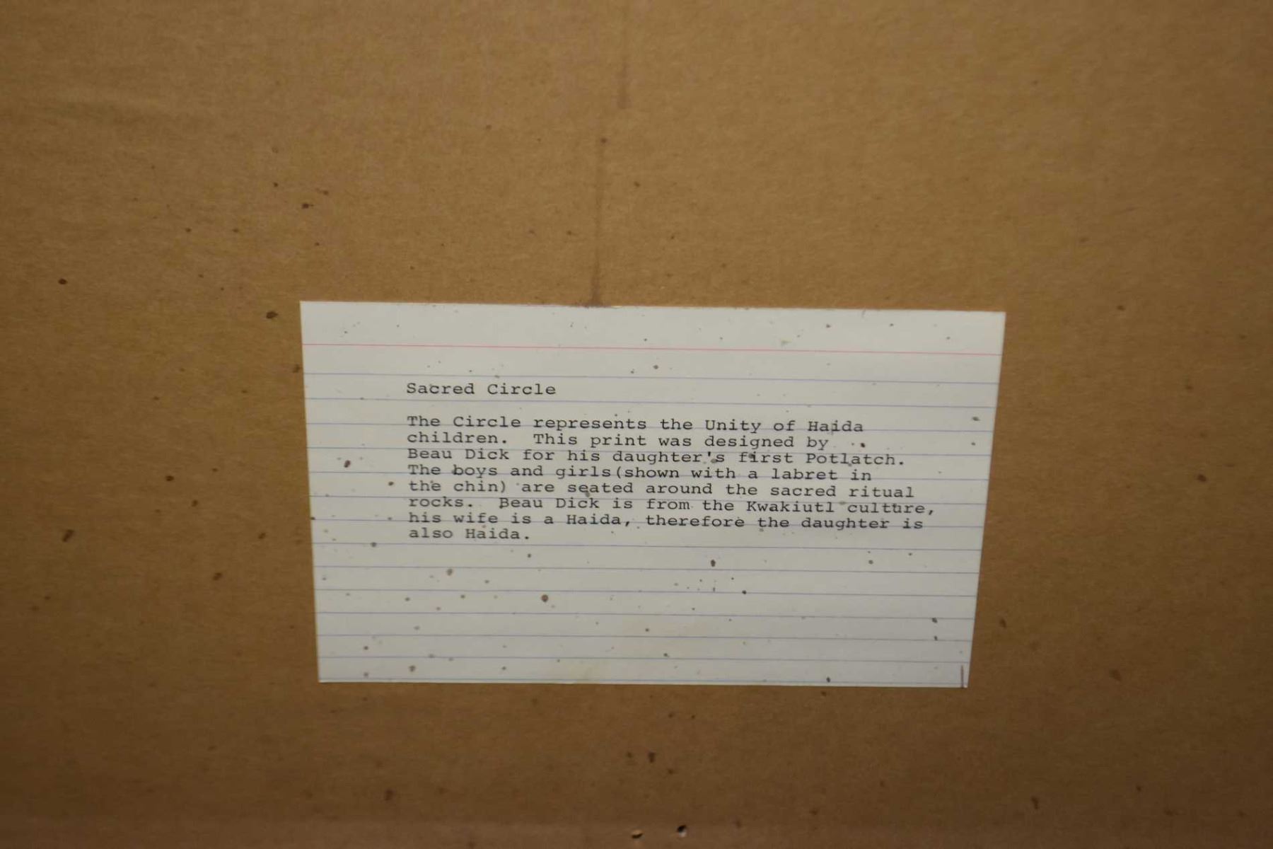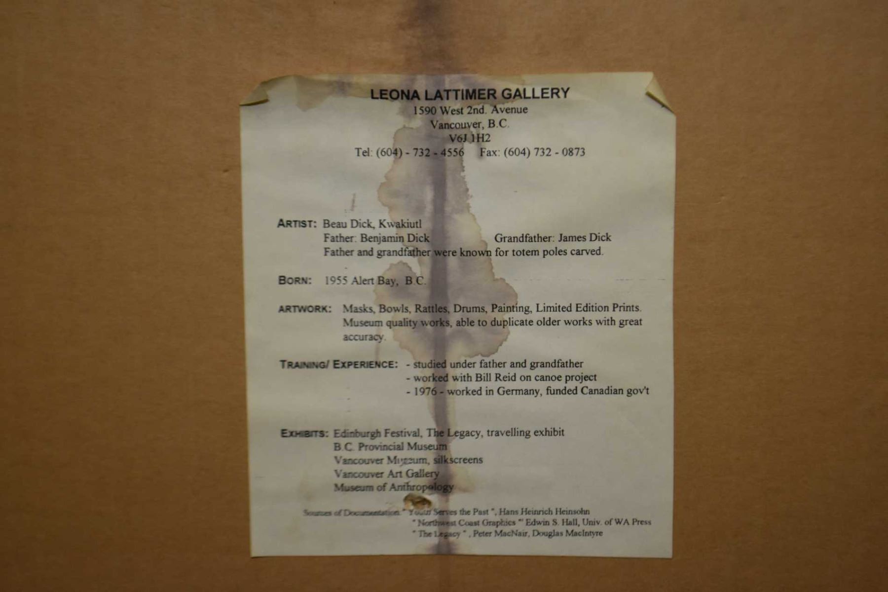 Framed black and white print titled "Secret Circles" pencil signed by artist Beau Dick '91, 69/155, see verso for bio