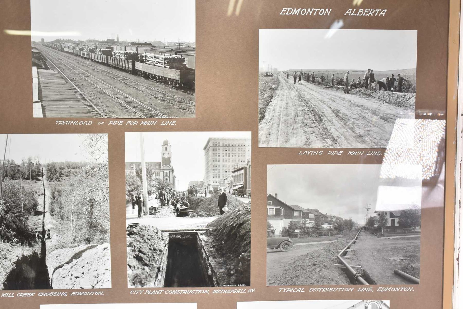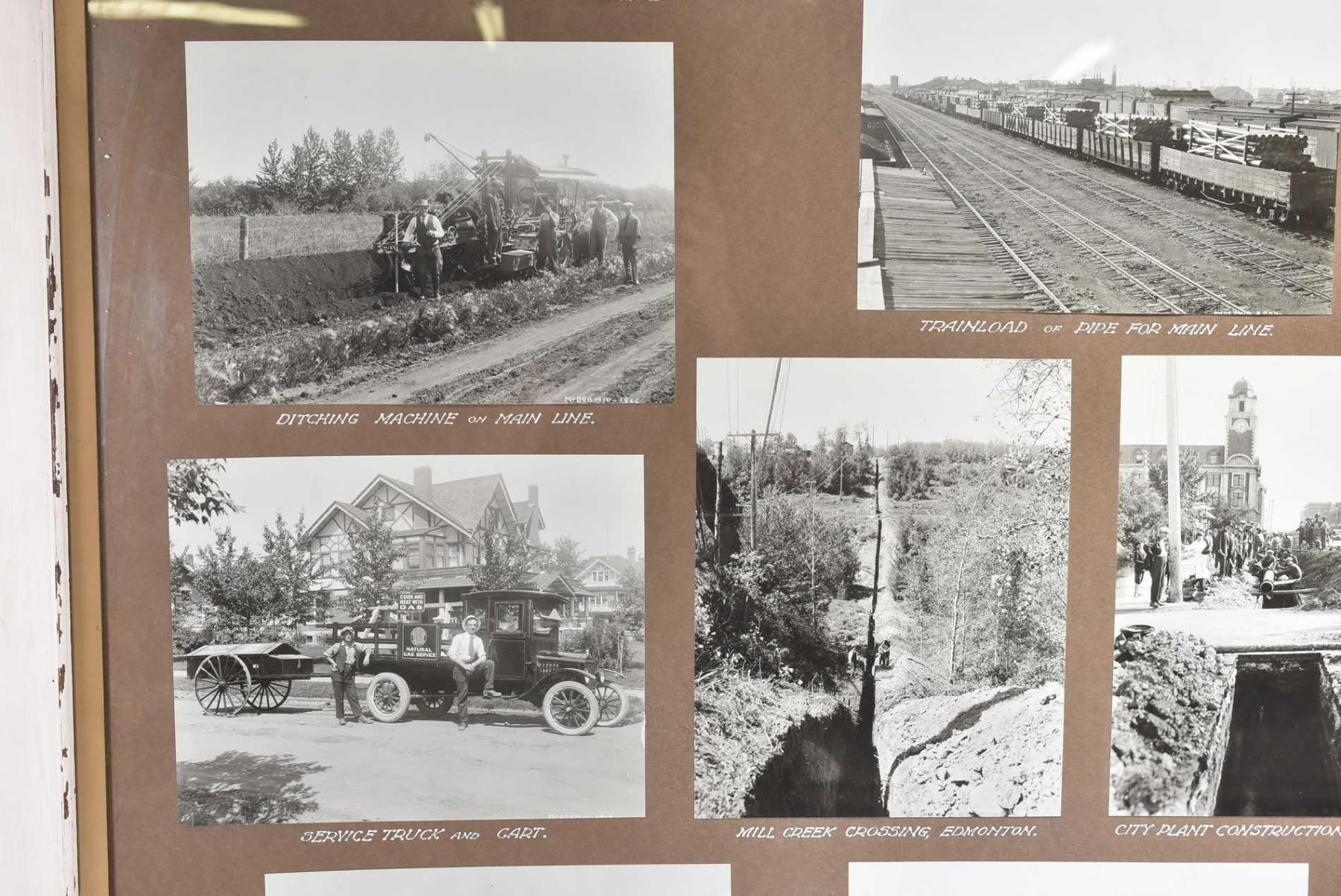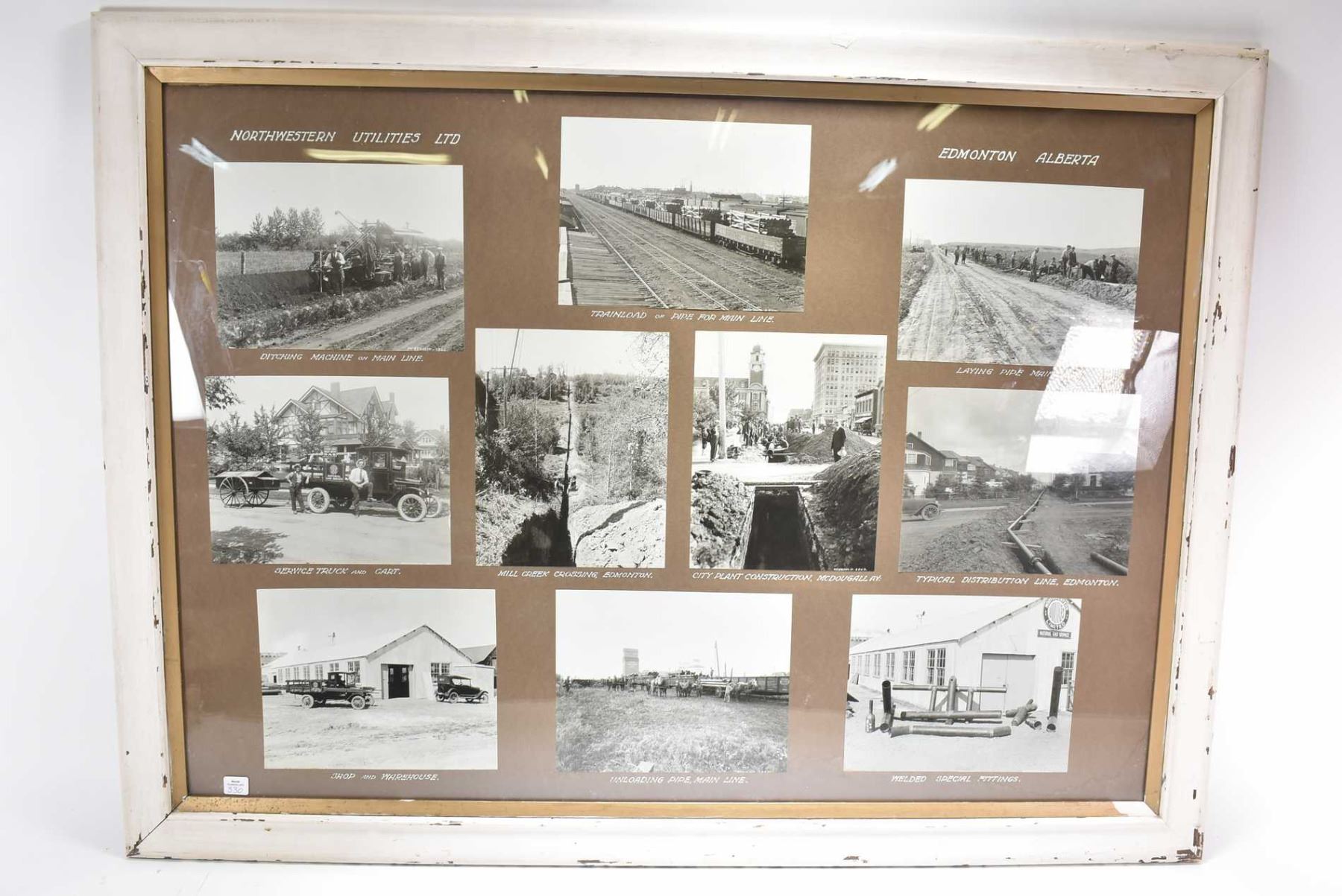 Framed collage of black and white photos labelled "North-western Utilities Ltd, Edmonton, Alberta" including service truck and cart, train load of pipe for mainline, all circa 1960's