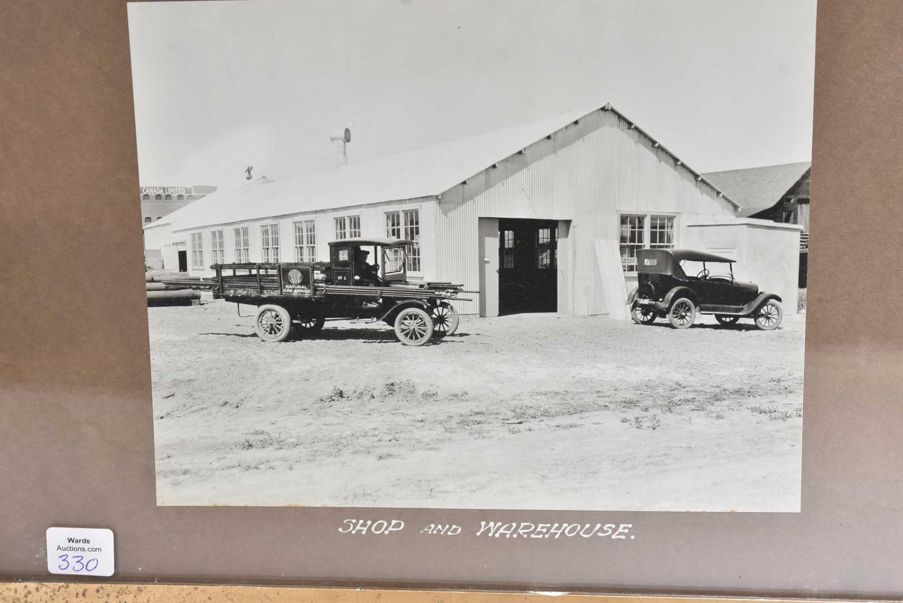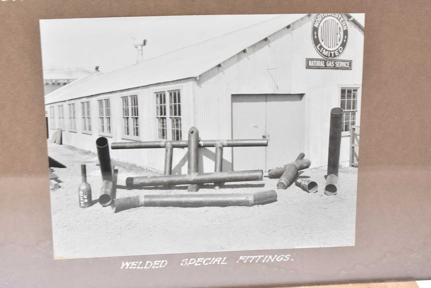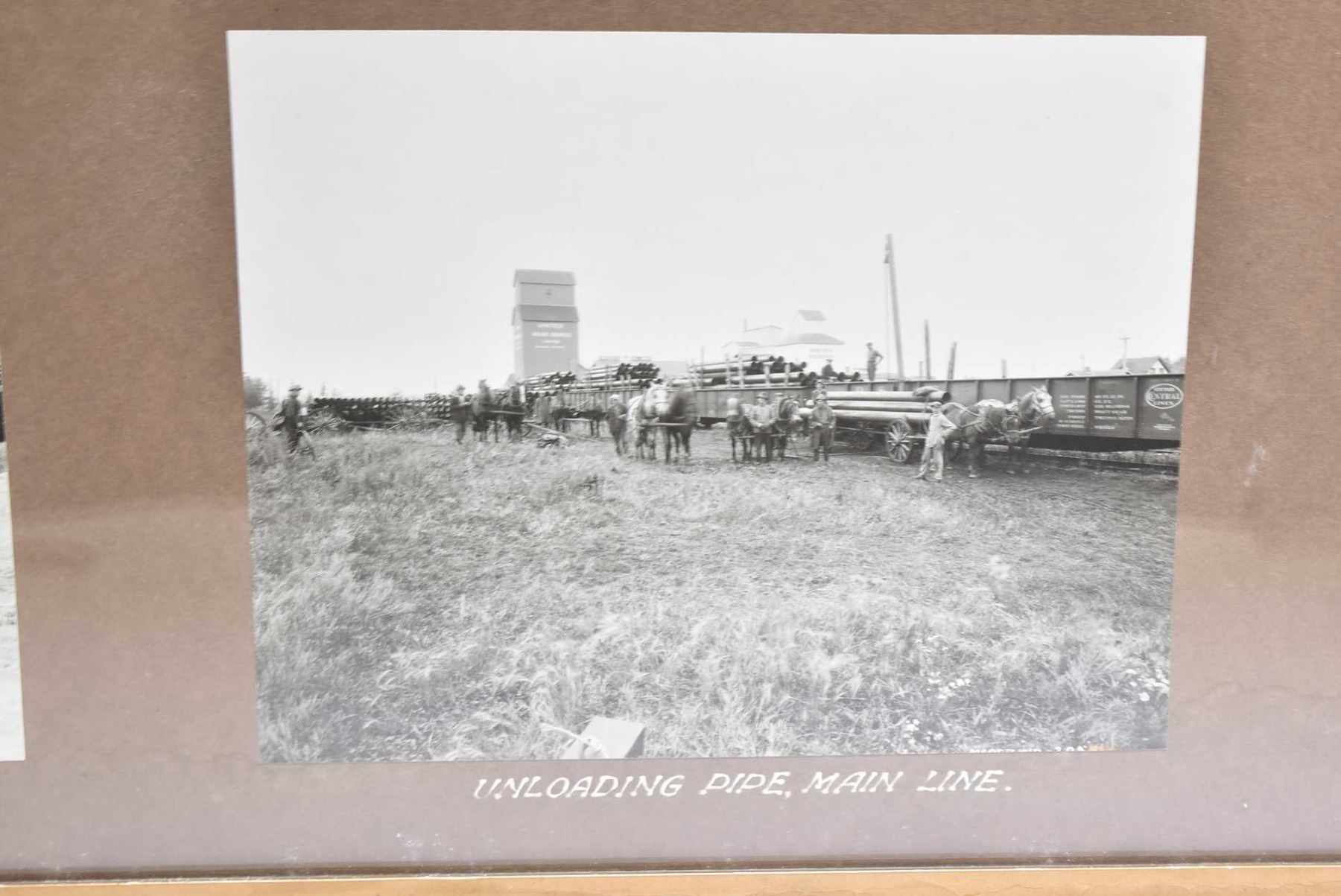 Framed collage of black and white photos labelled "North-western Utilities Ltd, Edmonton, Alberta" including service truck and cart, train load of pipe for mainline, all circa 1960's