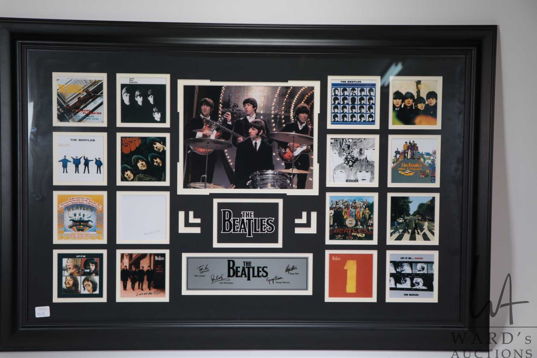 Framed collage of sixteen miniature Beatles album covers . Note: Not available for shipping. Local pickup only