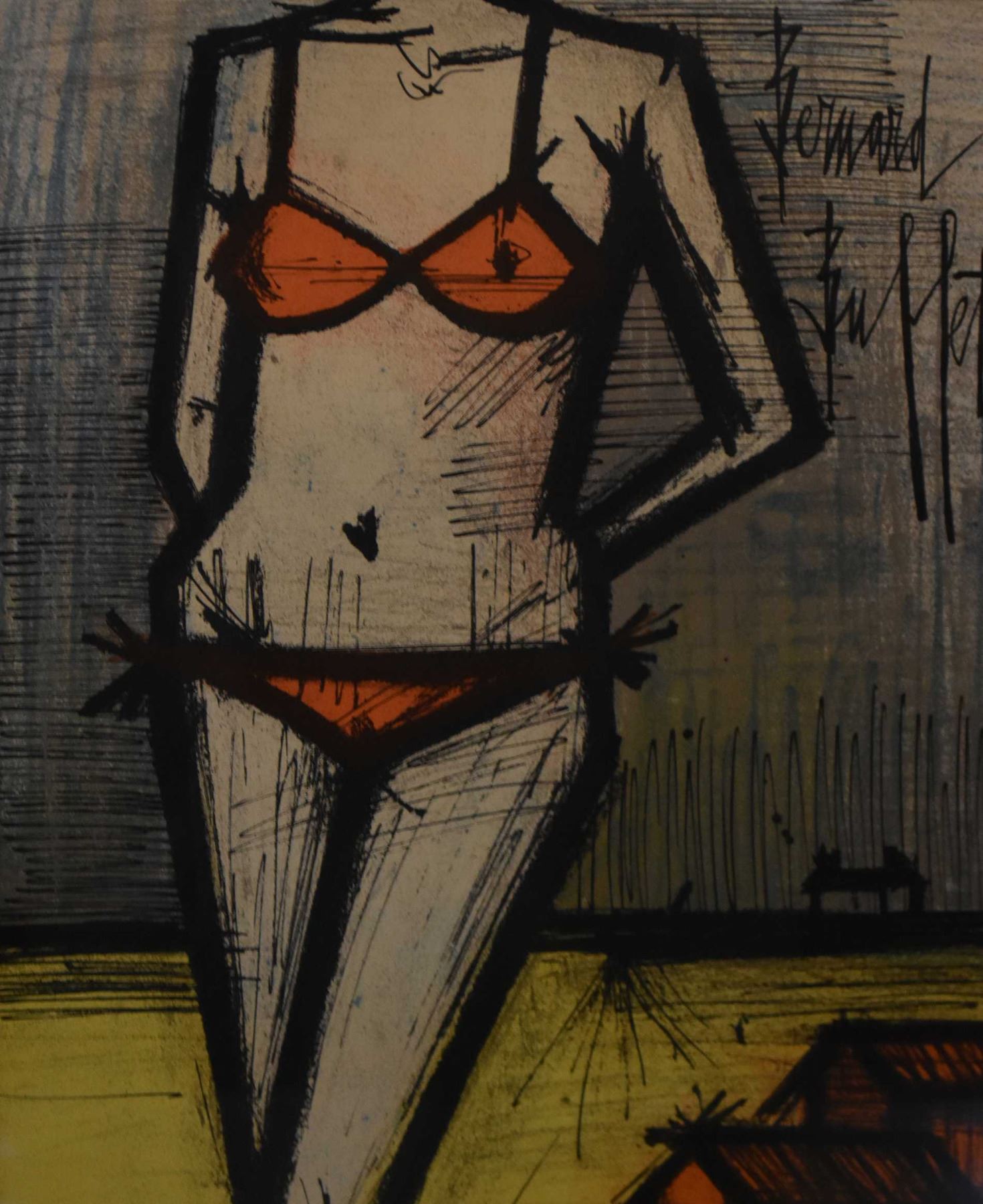 Framed coloured lithograph, labelled on verso "On the Beach, original lithograph" by artist Bernard Buffet, 12" X 9"
