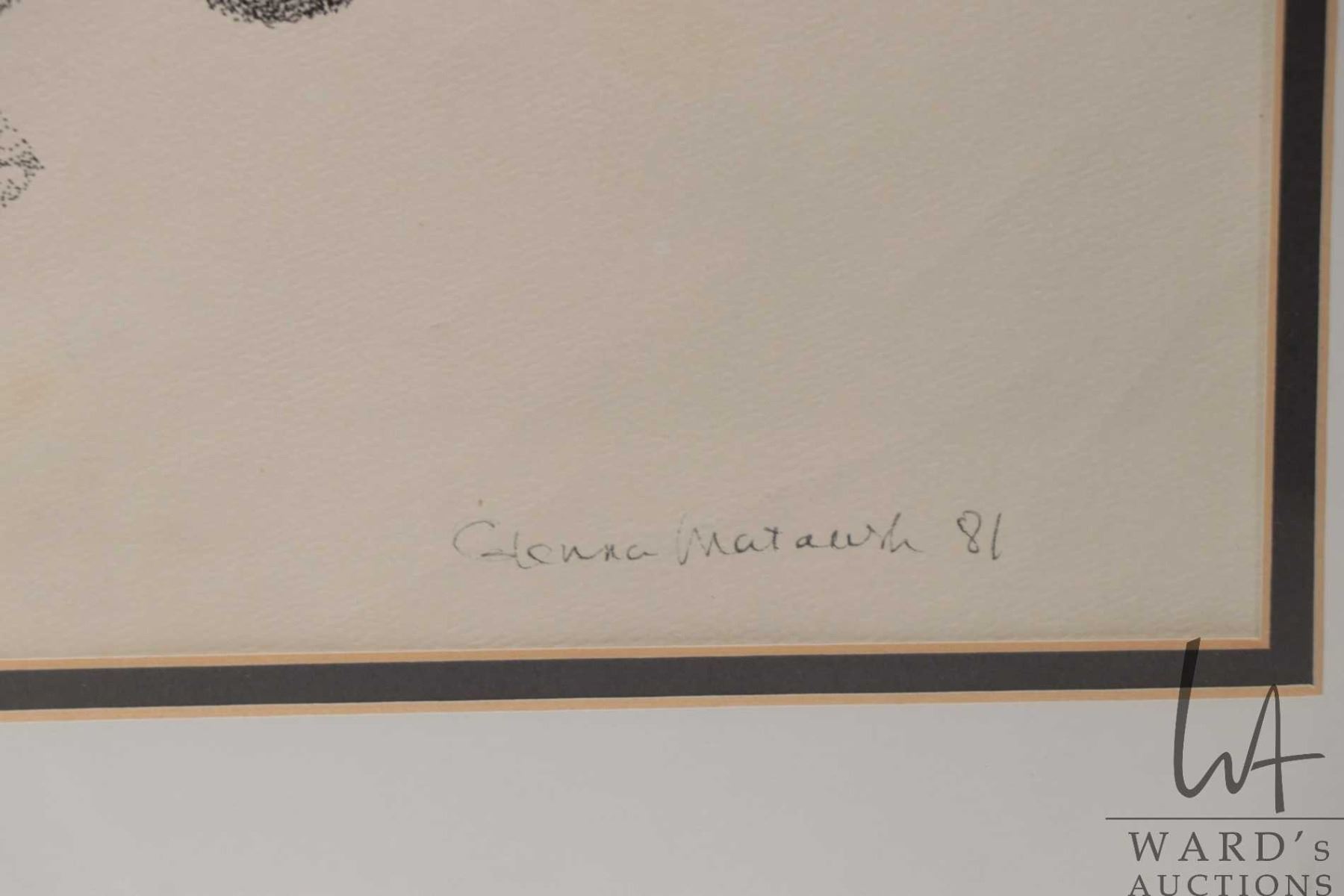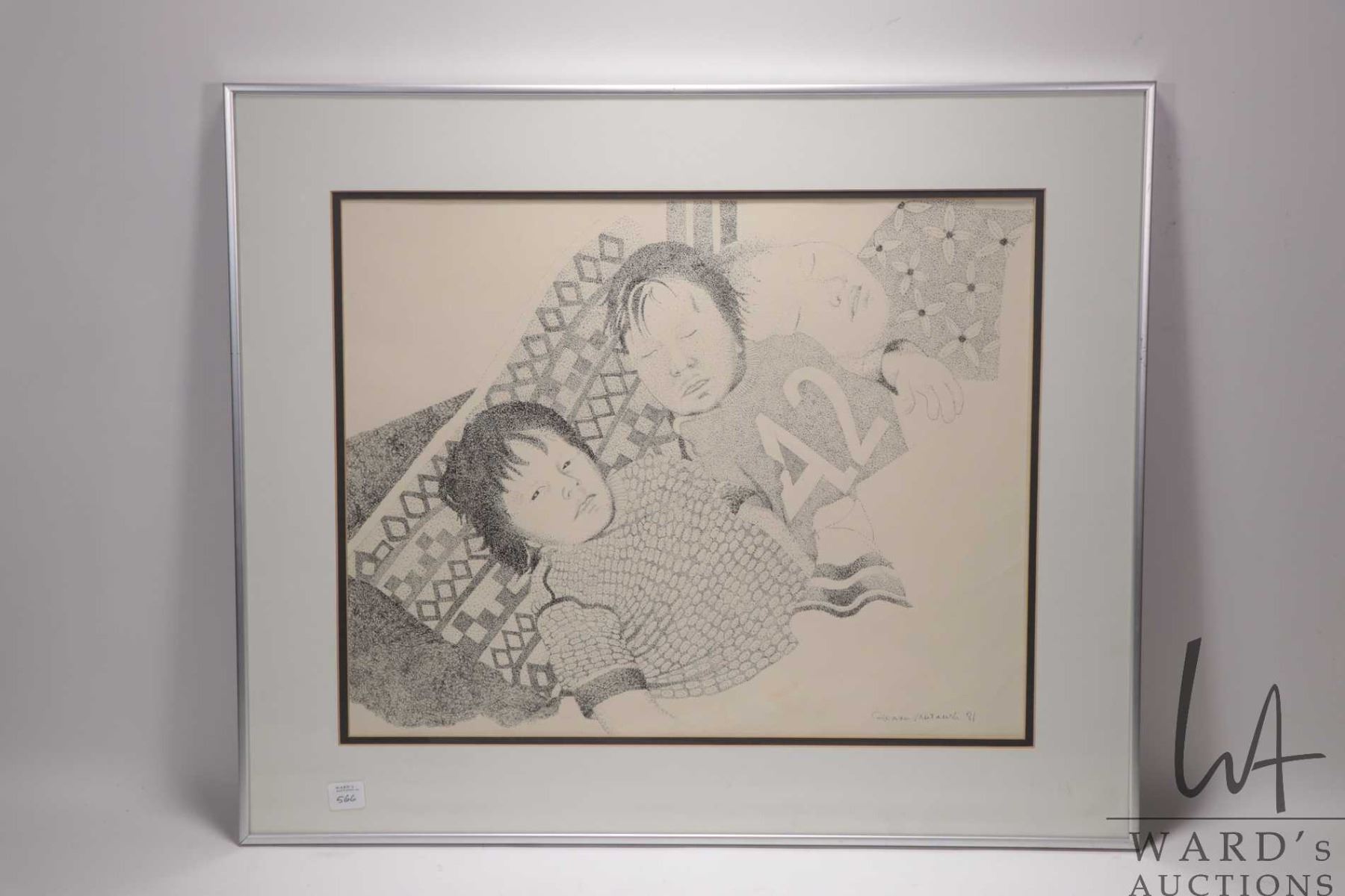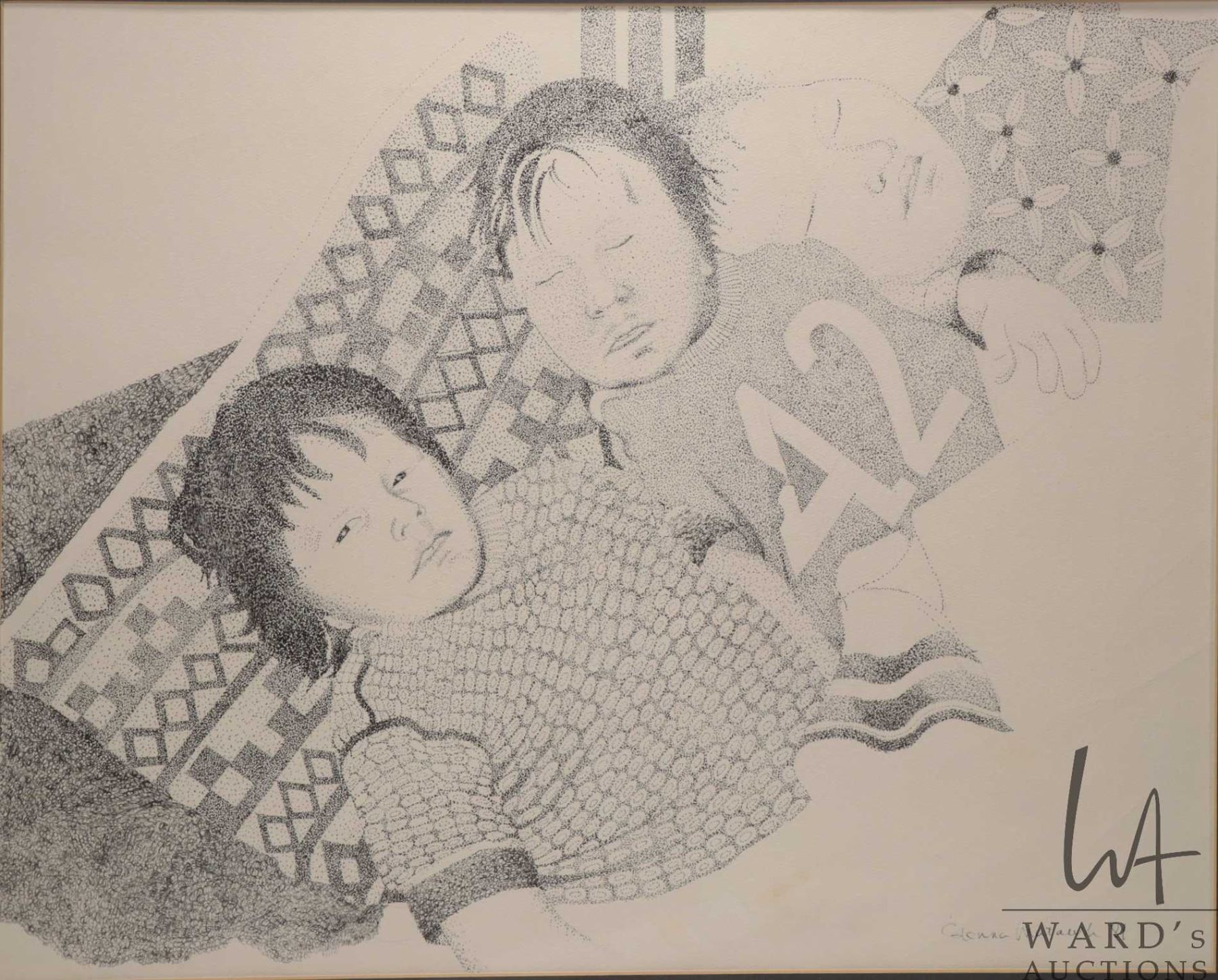 Framed etching titled "Children Sleeping by artist Glenna Matoush, 1981, 15" X 20"