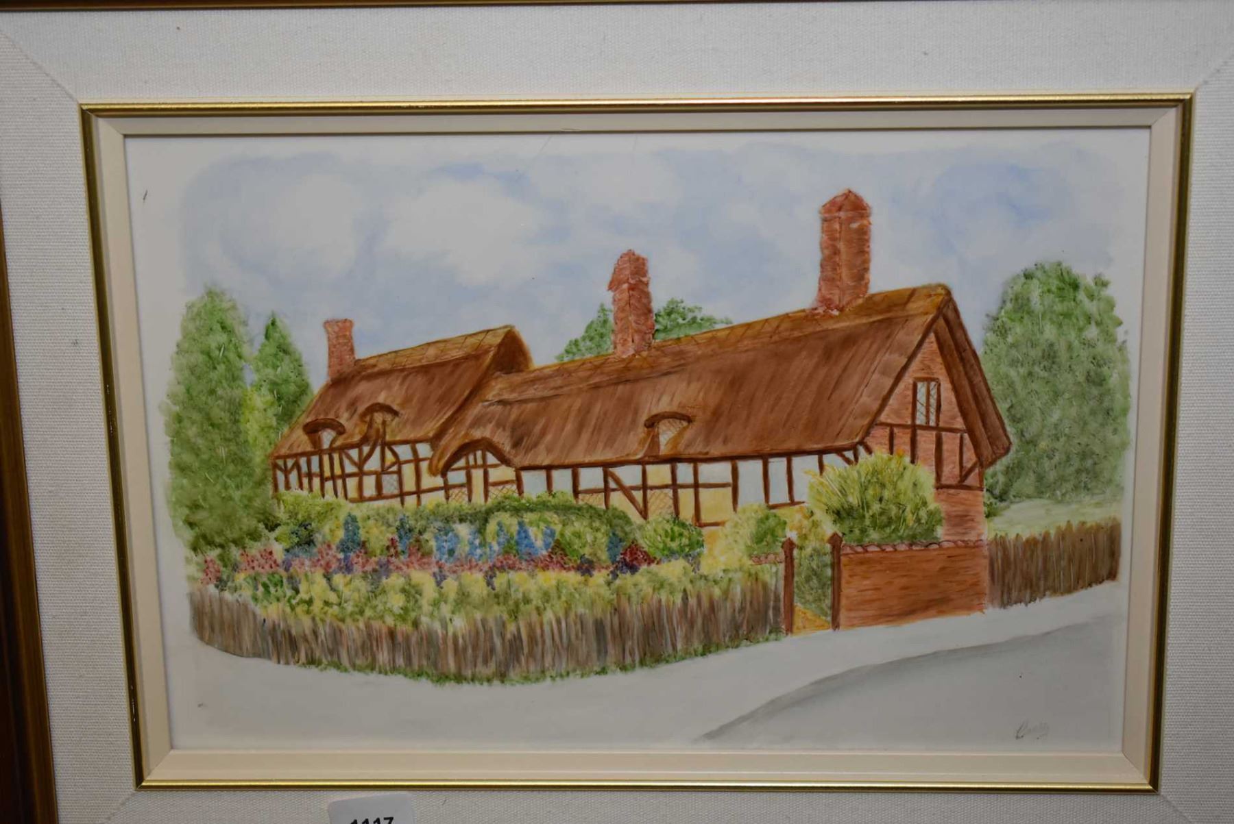 Framed hand painted tile of Anne Hathaway's Cottage signed by arist Betty, 8" X 12"