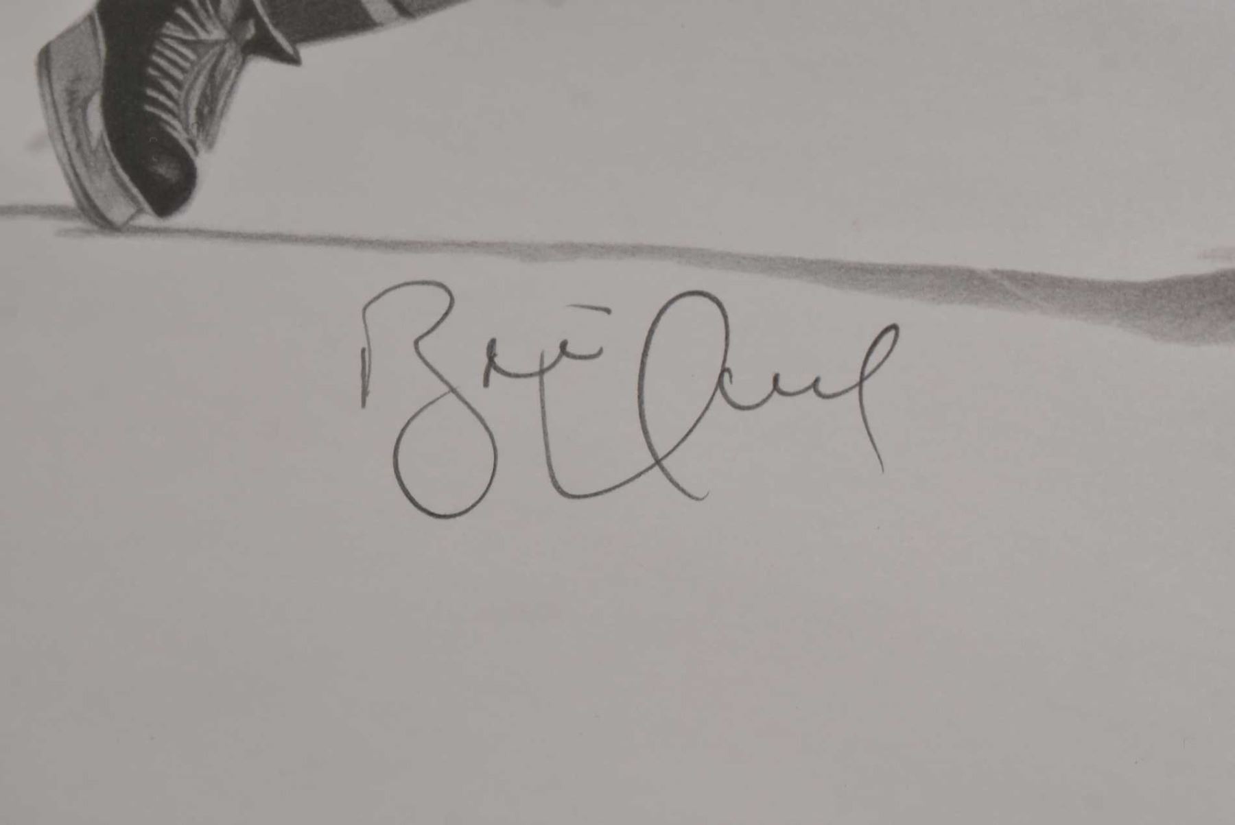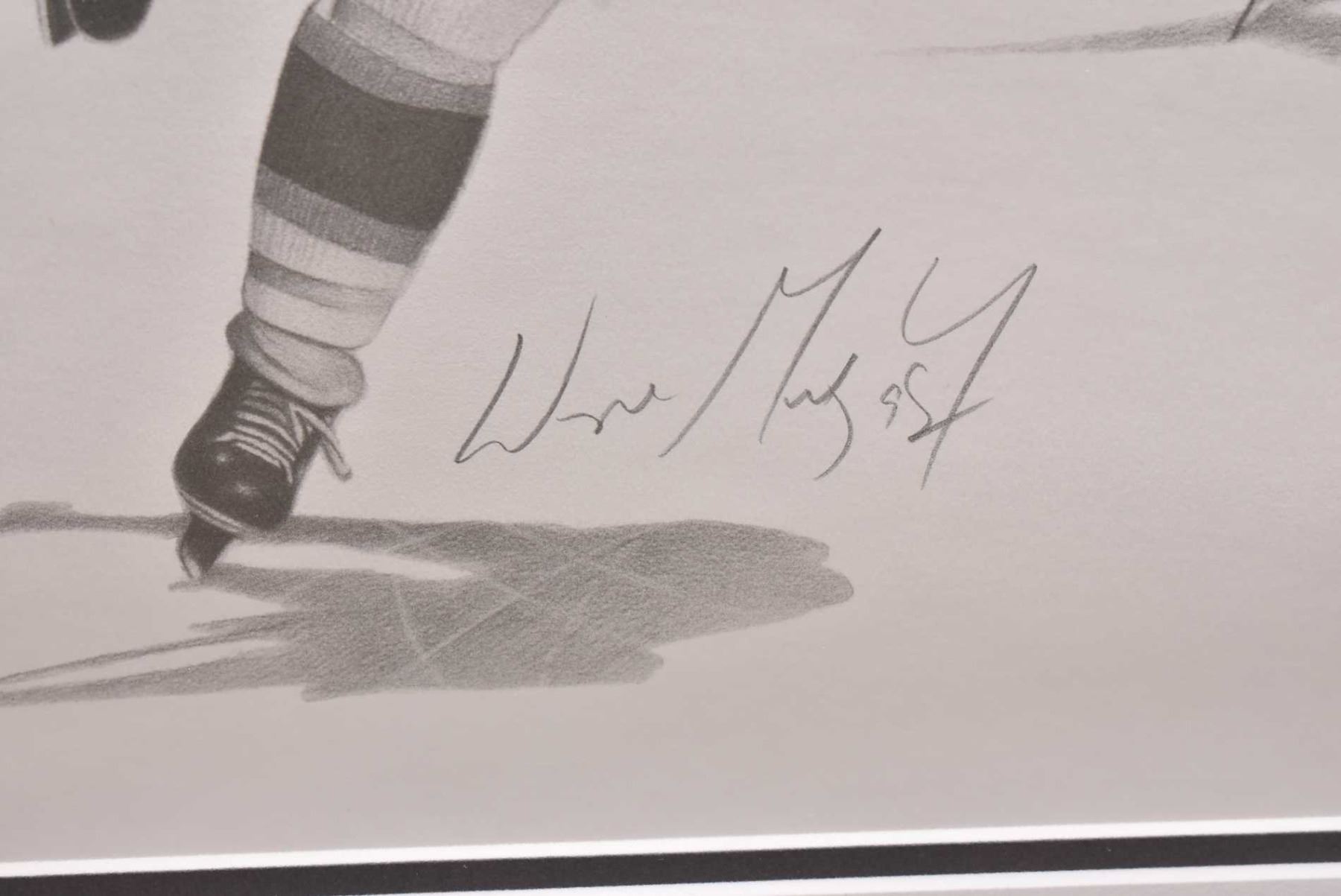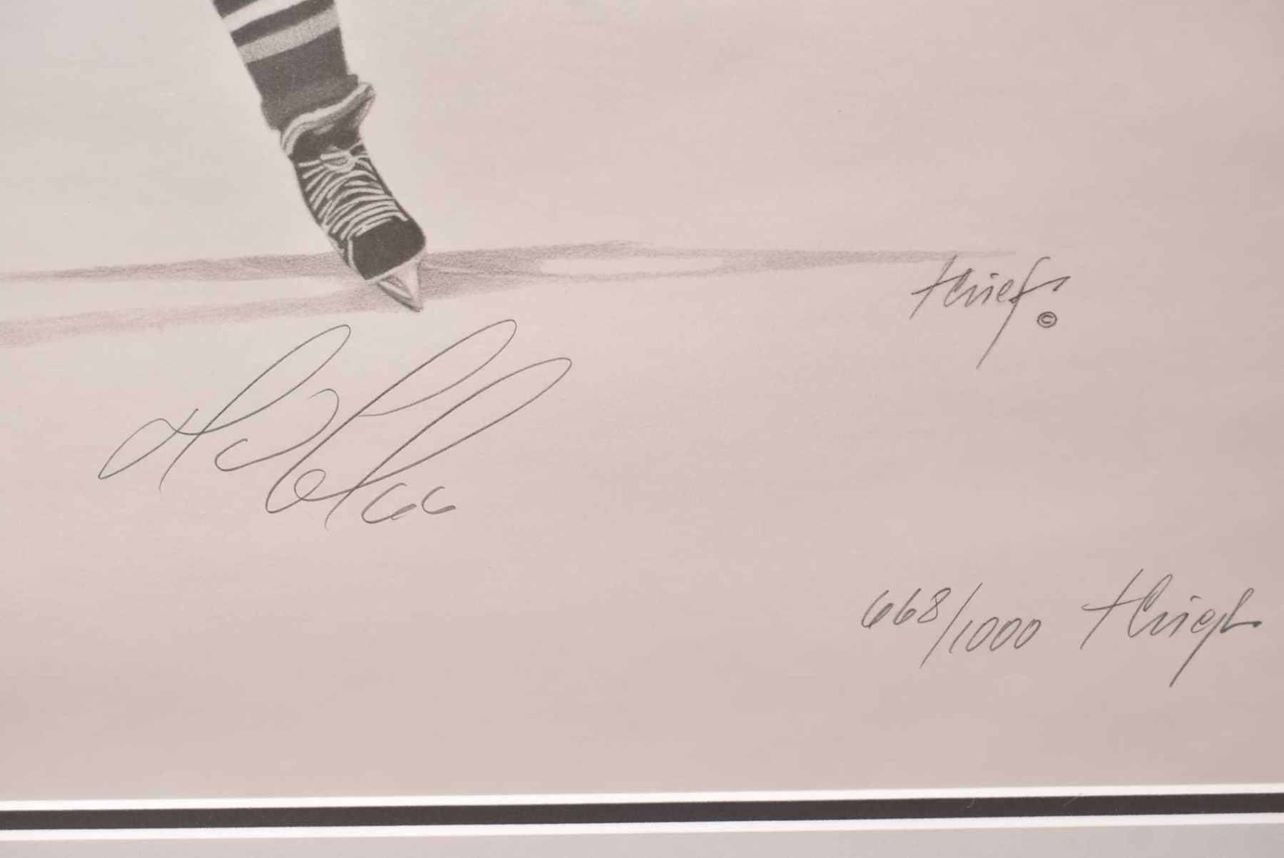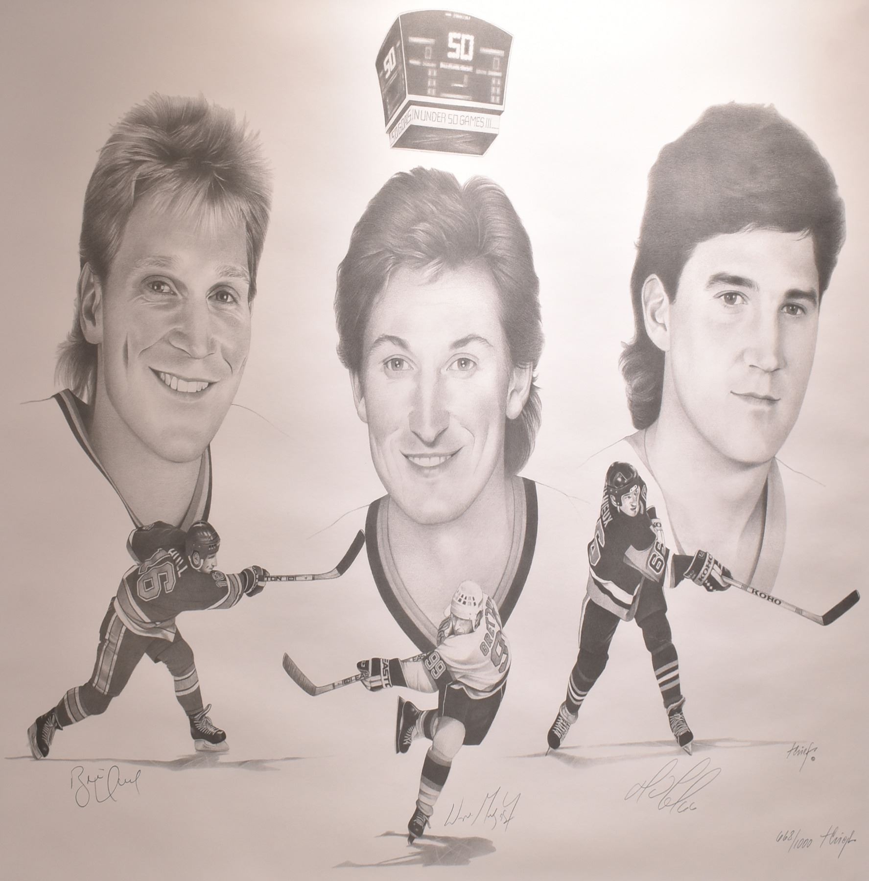 Framed limited edition print "Fifty Goals in Under Fifty Games" with COA insuring authentic signatures by Wayne Gretzky, Mario Lemieux and Brett Hull and pencil signed by artist Joe Thiess, 668/1000