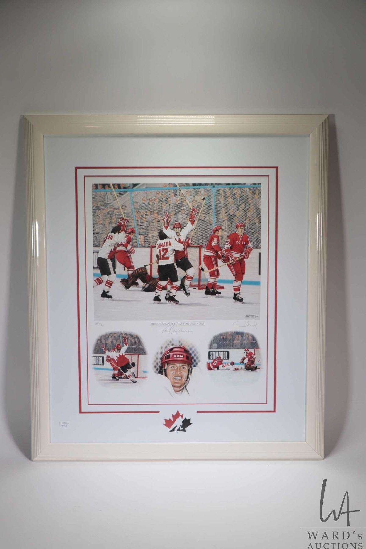 Framed limited edition print "Henderson Scores For Canada" pencil signed by Henderson and artist Daniel Parry, 1730/2500. Note: Not available for shipping. Local pickup only