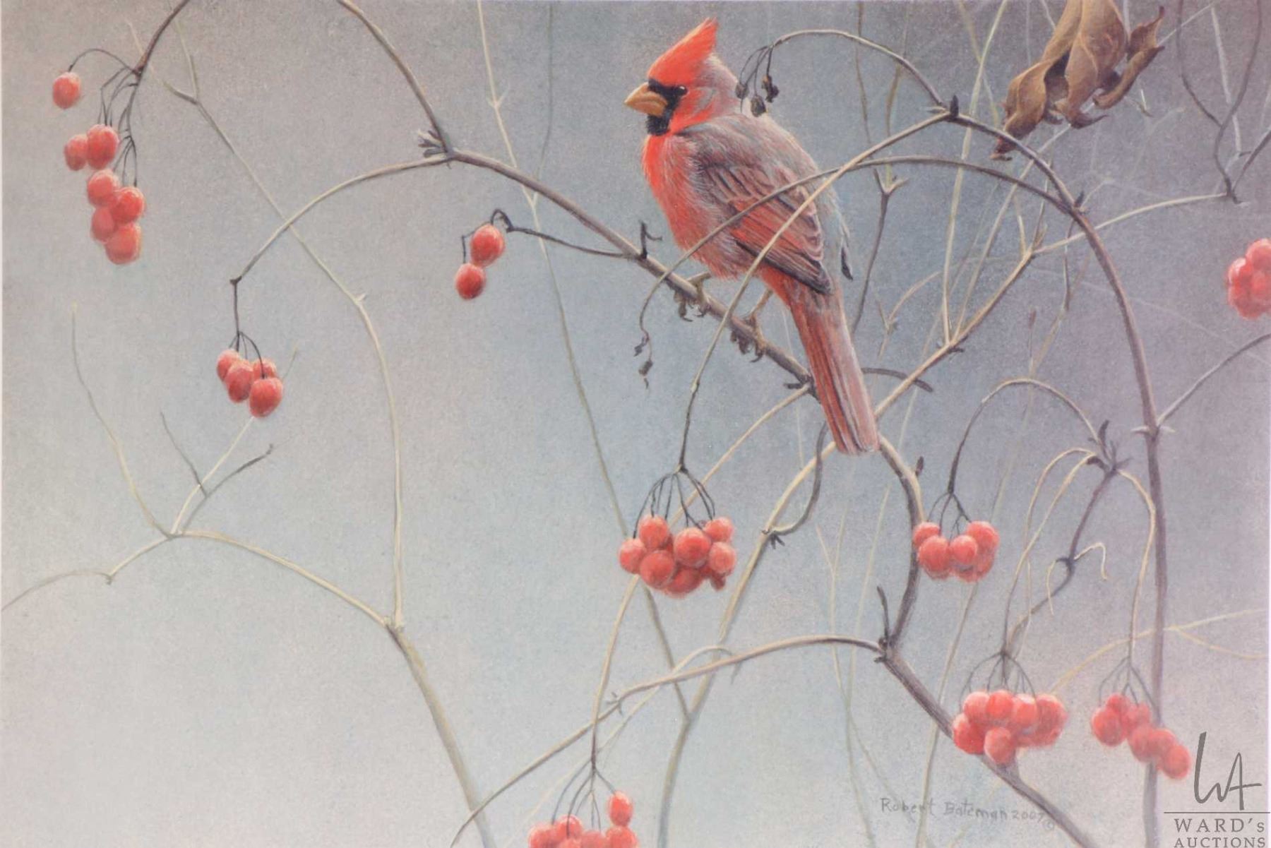 Framed limited edition print "Highbush Cranberries Cardinal" pencil signed by artist Robert Bateman 69/76 with attached COA