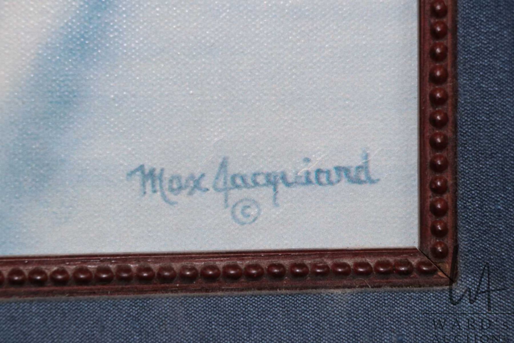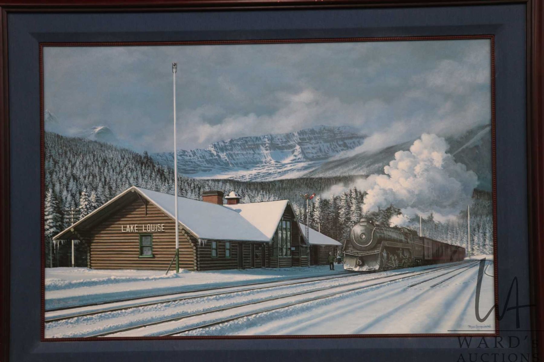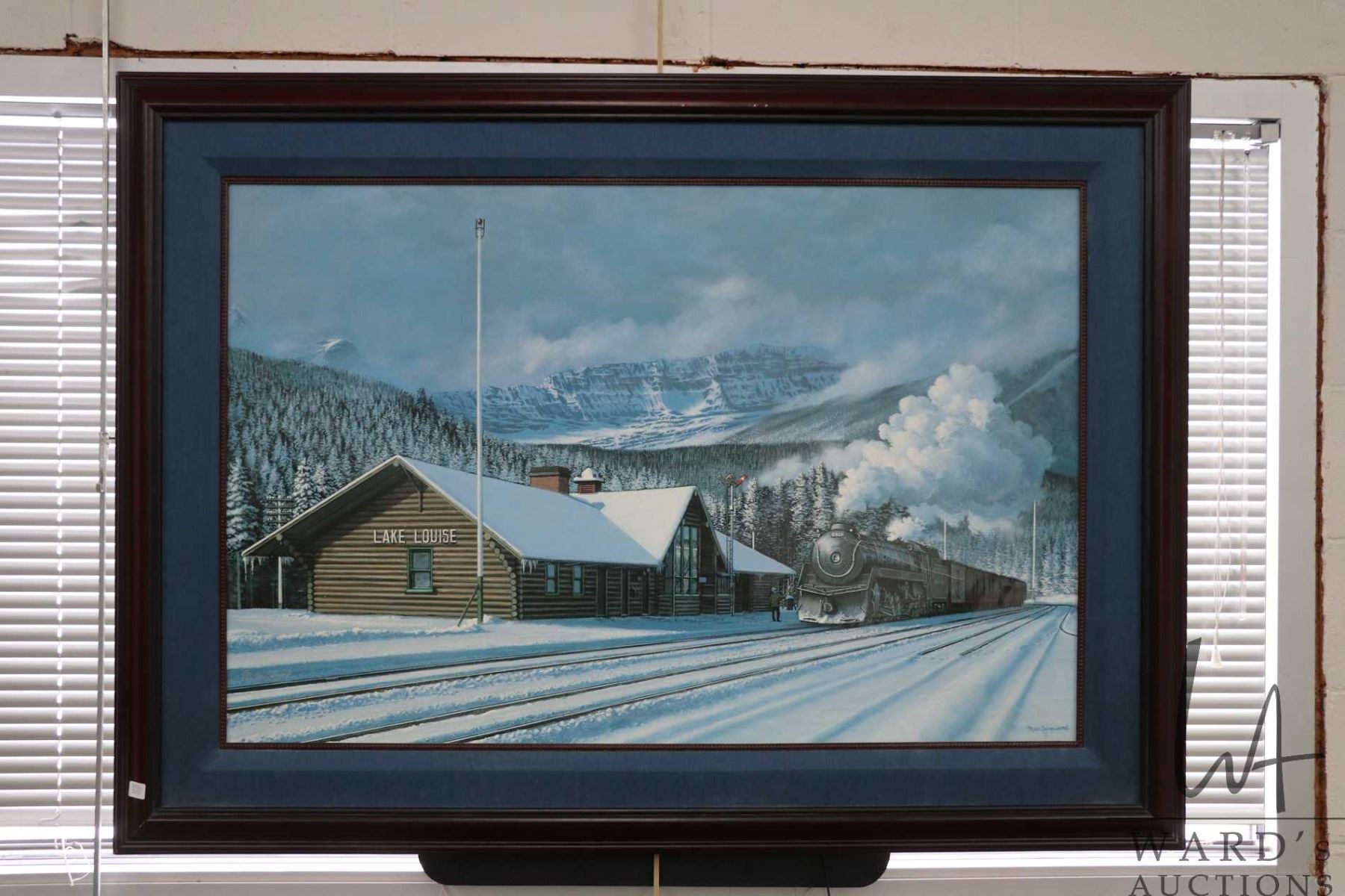 Framed limited edition print depicting Lake Louise Train Station, silver ink signed by artist Max Jacquiard, 152/195, outside dimensions including frame 39" X 53". Note: Artwork and framed pieces cannot be insured and many are too large to ship. Local pickup