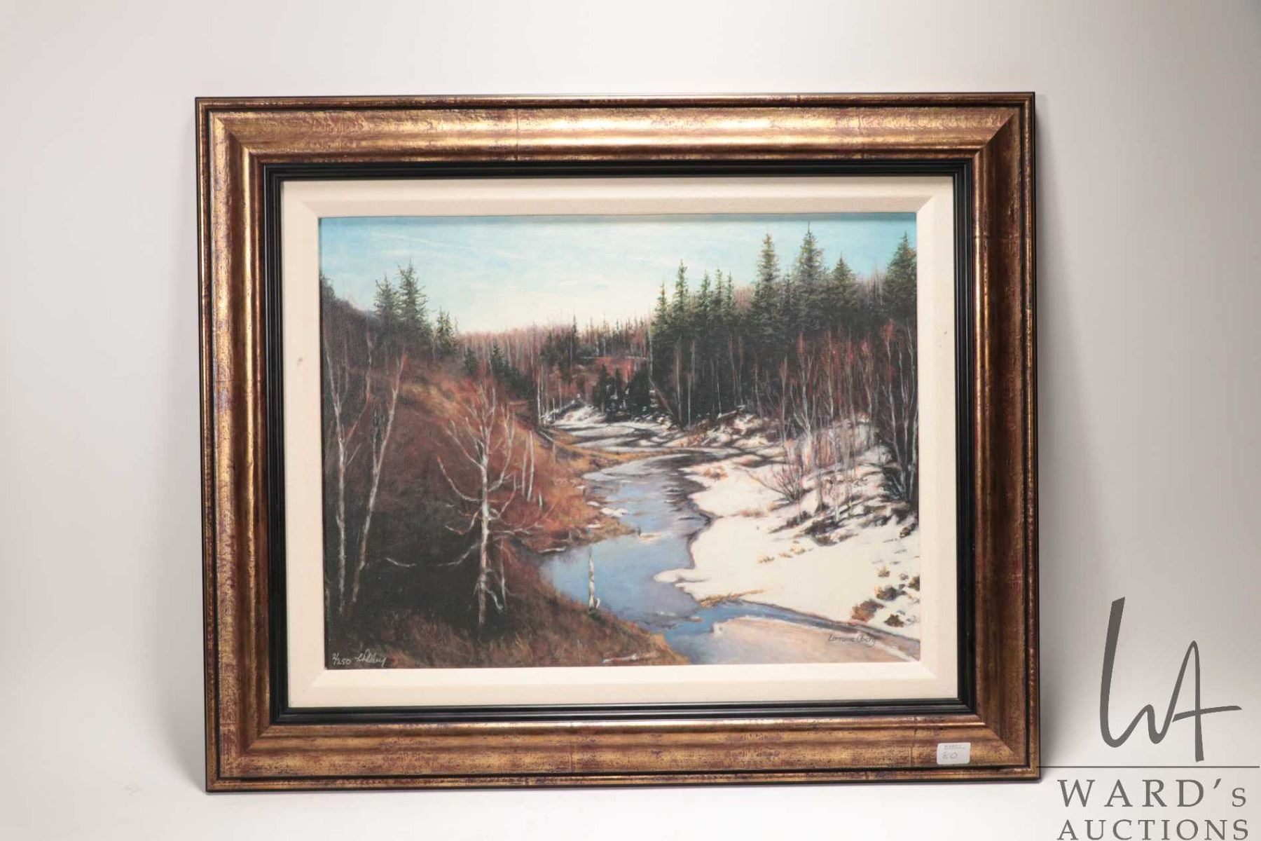 Framed limited edition print of a forested river in winter, 2/ 250, by artist Lorraine Oberg, overall dimensions including frame 20 3/4" X 25"