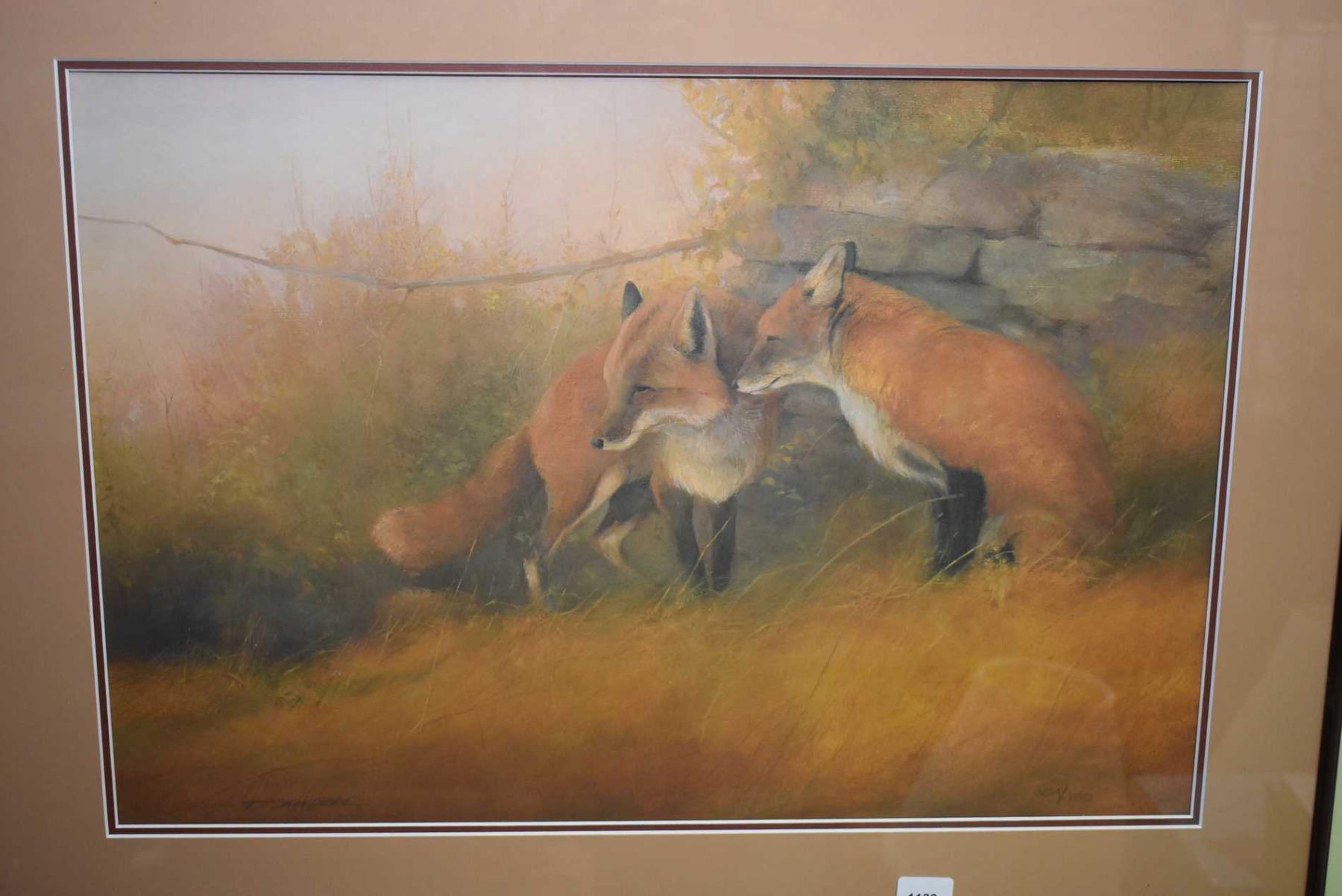 Framed limited edition print of two red foxes, pencil signed by artist T. Sawdell, 354/750