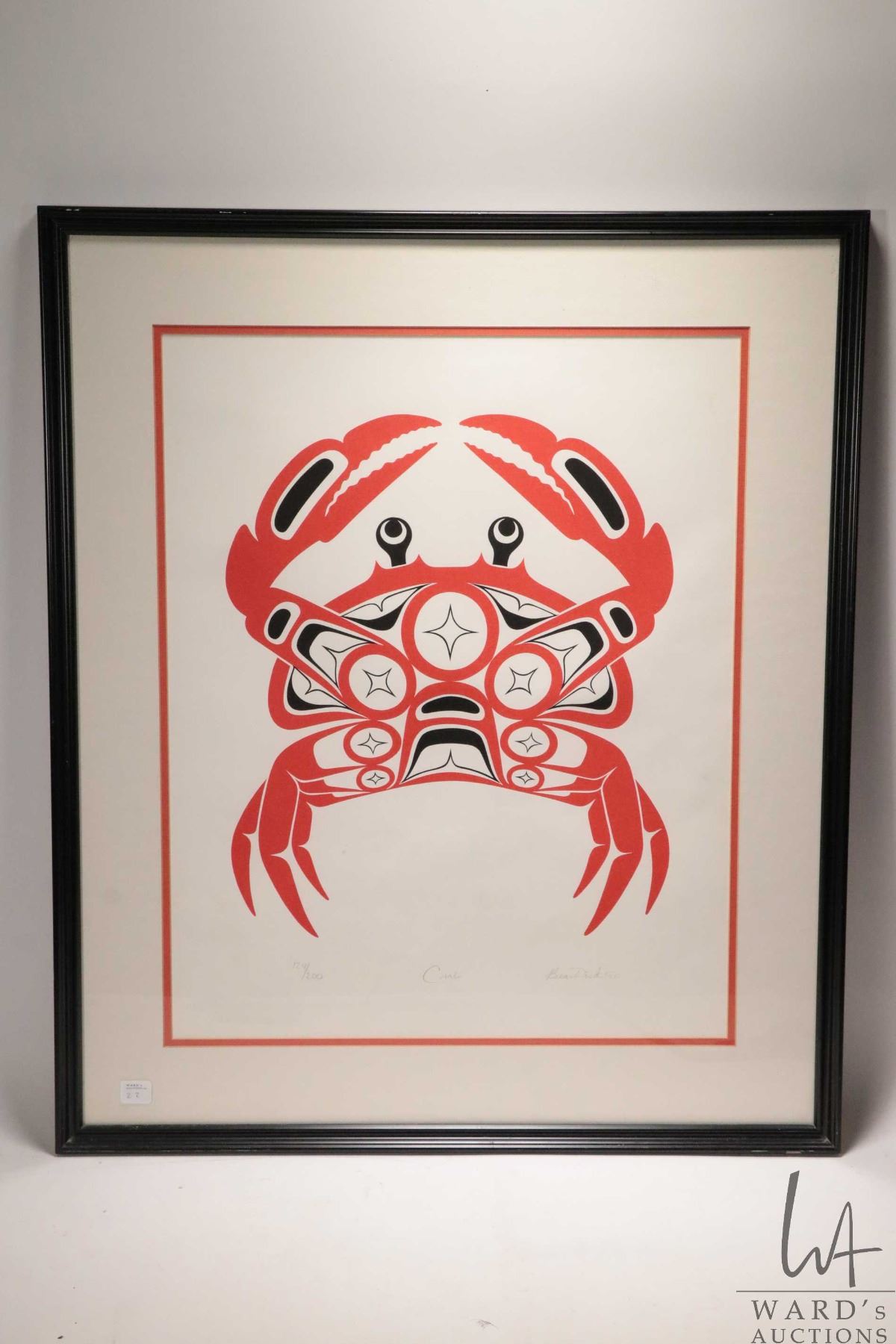 Framed limited edition print titled "Crab" 124/200 and pencil signed by artist Beau Dick, overall di