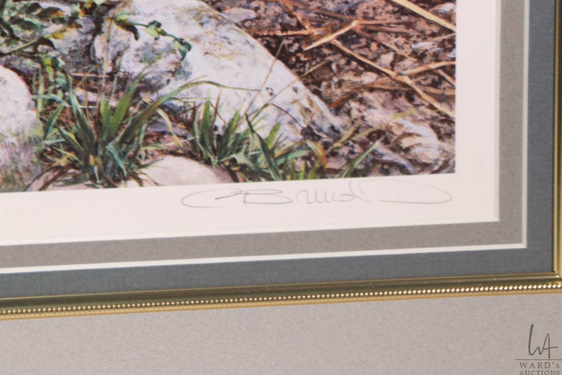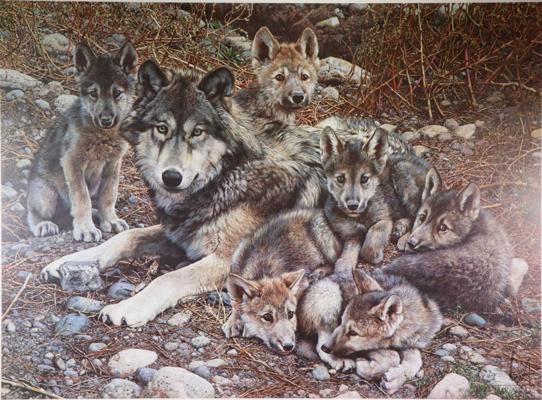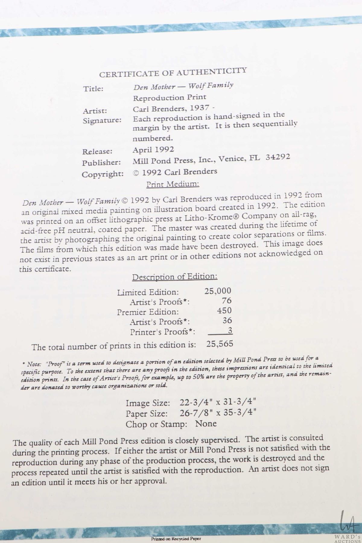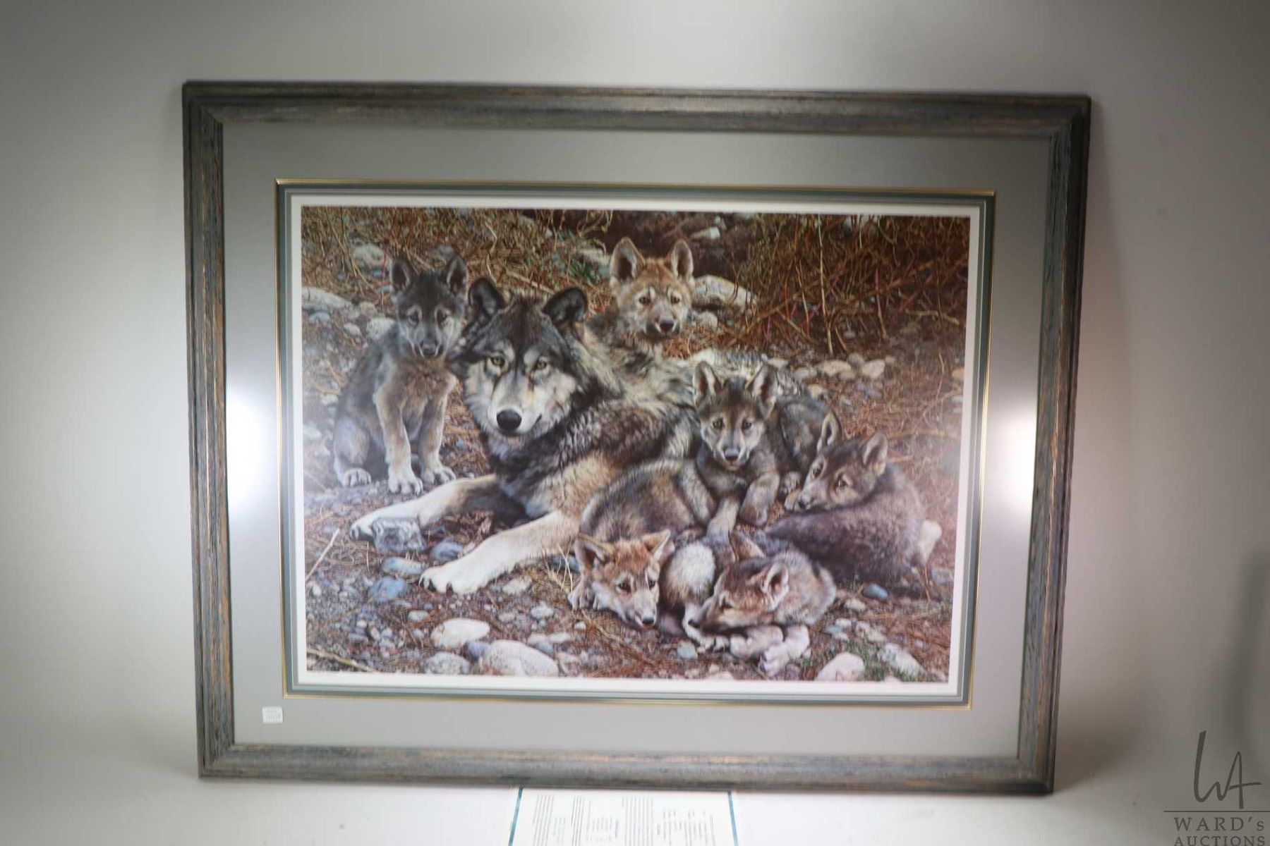 Framed limited edition print titled "Den Mother- Wolf Family" with COA and pencil signed by artist Carl Brenders18388/25000. Note: Not available for shipping. Local pickup only