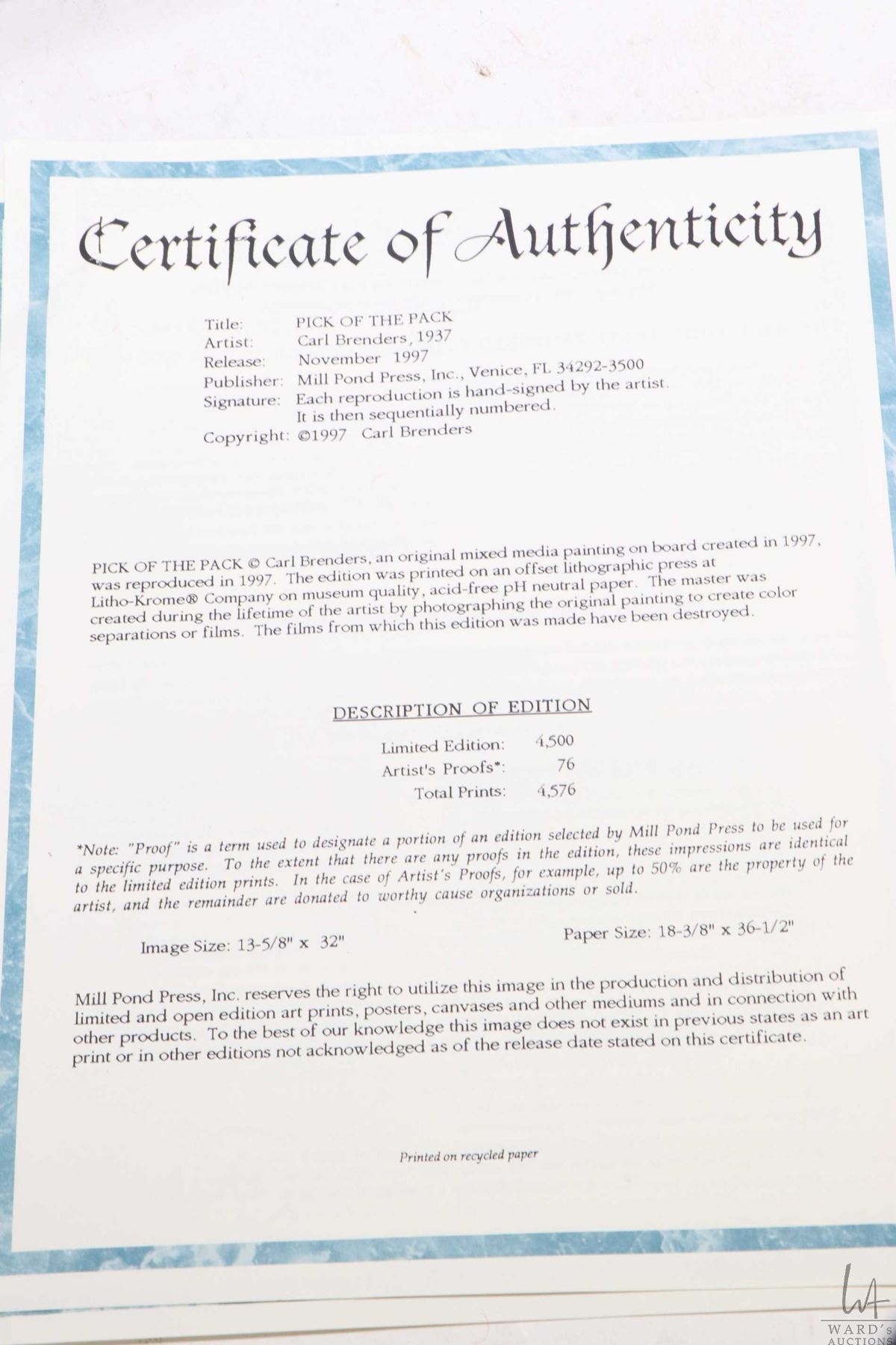 Framed limited edition print titled "Pick of the Pack" with COA and signed by artist Carl Brenders 2359/4500. Note: Not available for shipping. Local pickup only