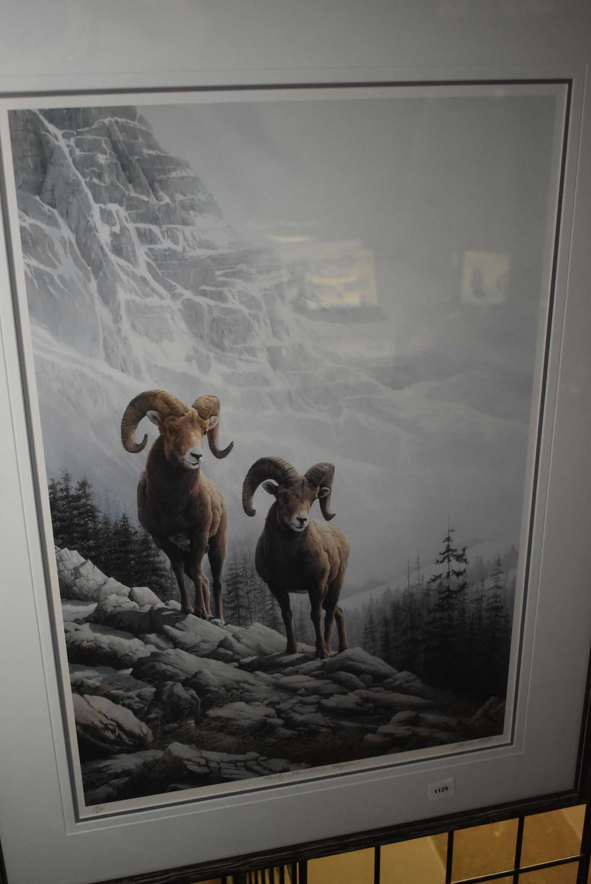 Framed limited edition print titled "Rocky Mountain Big Horn" pencil signed by artist Marla Wilson, 14/295
