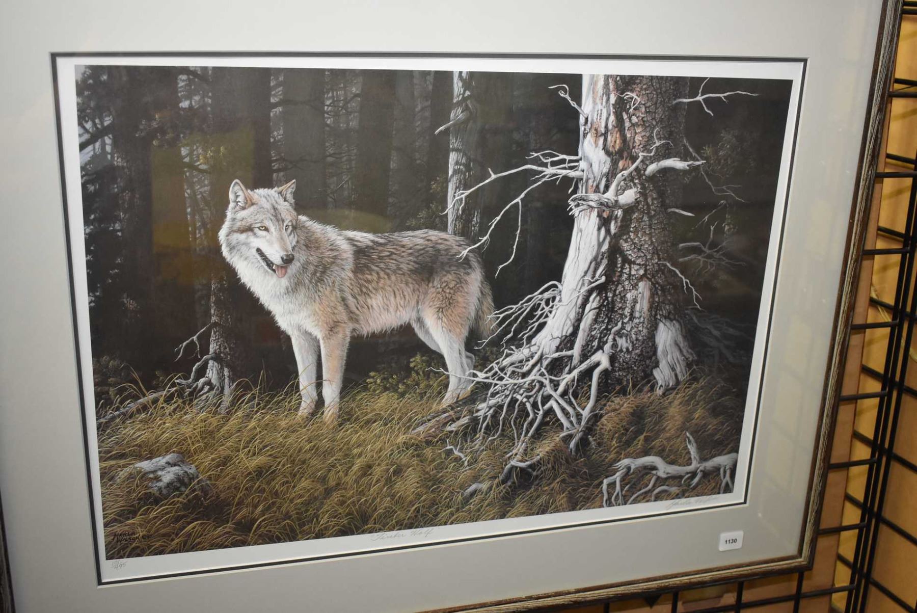 Framed limited edition print titled "Timber Wolf" pencil signed by artist Marla Wilson, 101/495
