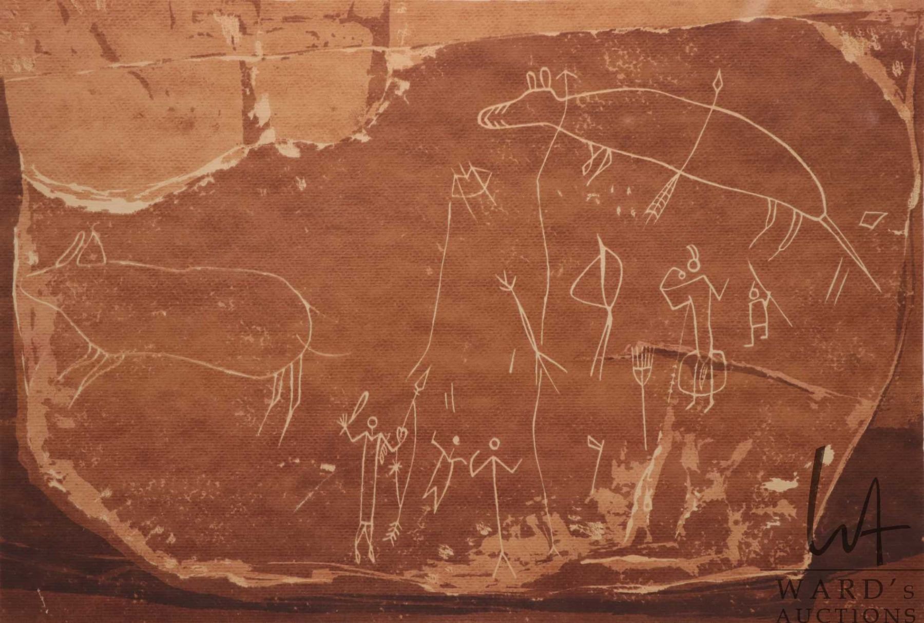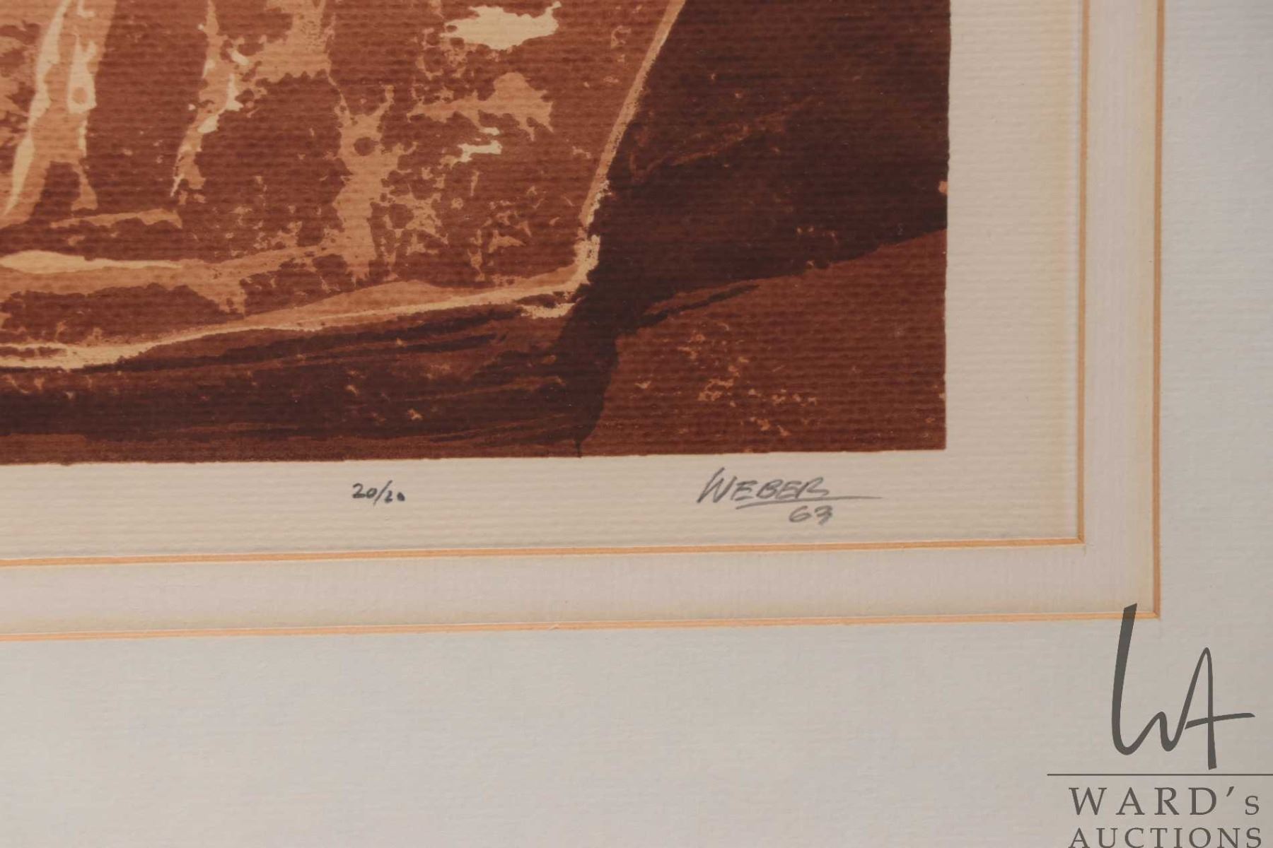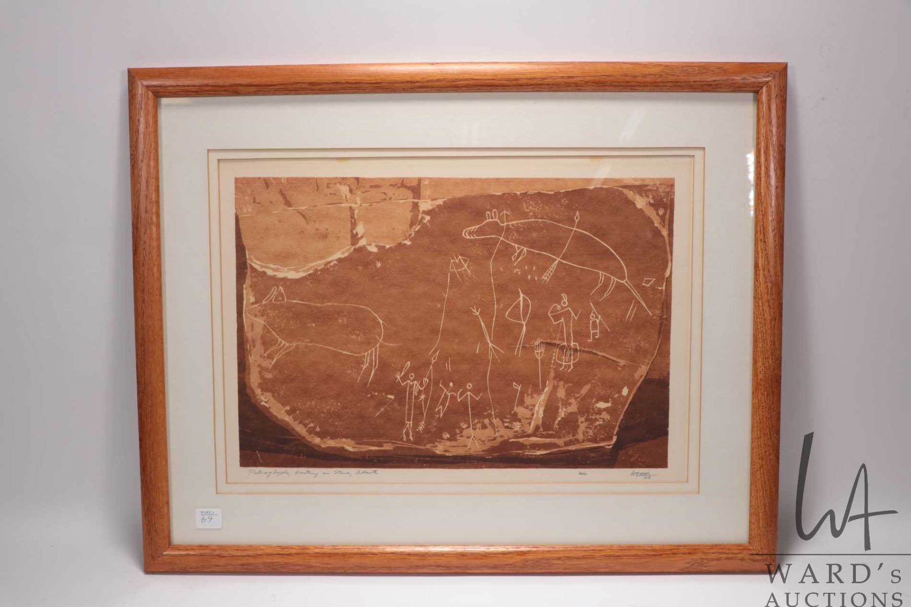 Framed limited edition silk screen print "Petroglyphs, writing on stone Alberta" 20/20, pencil signed by artist Weber '69, 12" X 17". Note: Artwork cannot be insured and is often too large to ship. Local pickup.