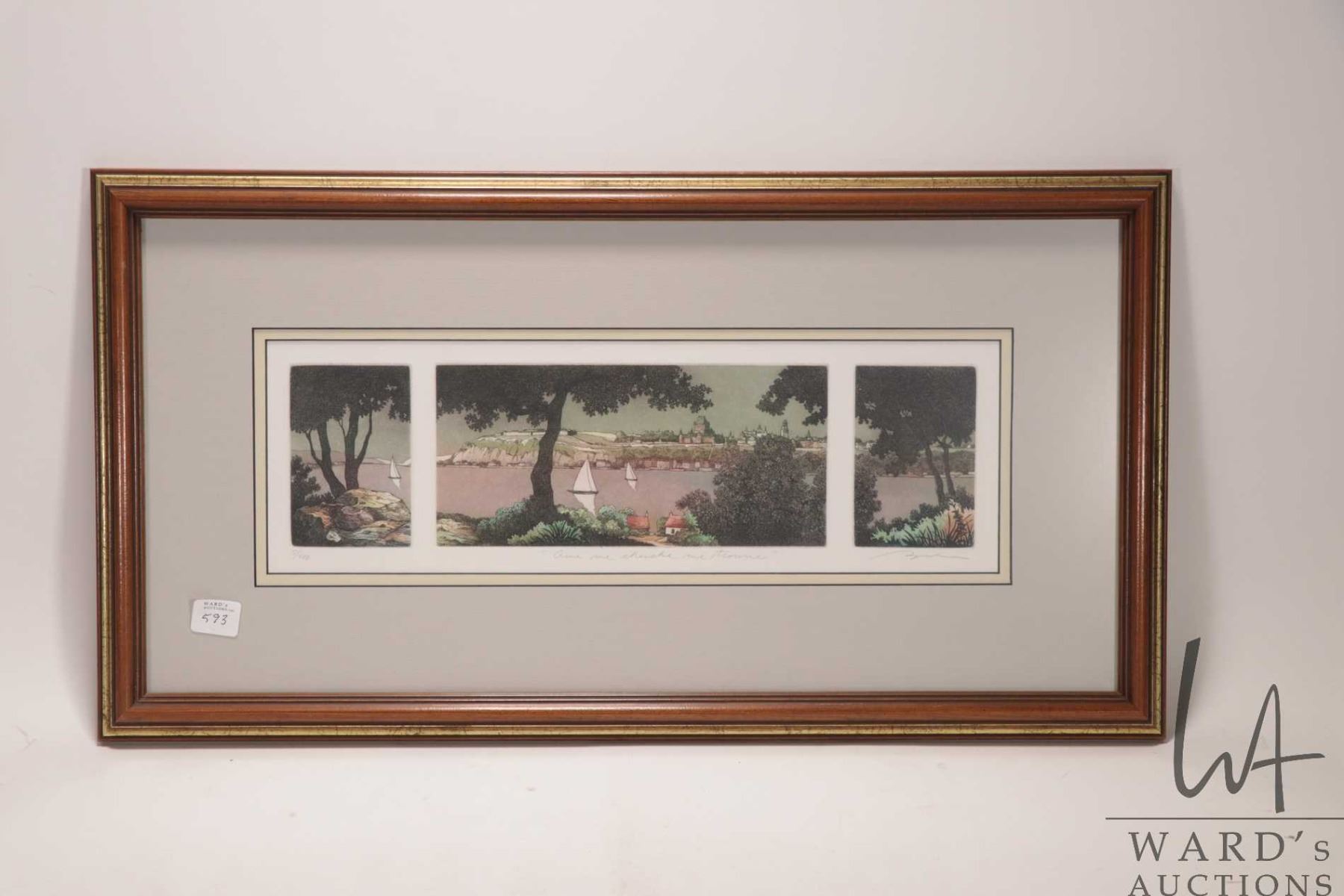Framed limited edition triptych print of a French coastal scene titled "Oui me cherche me trouve", pencil signed by artist and numbered 5/400, overall dimensions including frame 12 1/2" X 22 1/2"