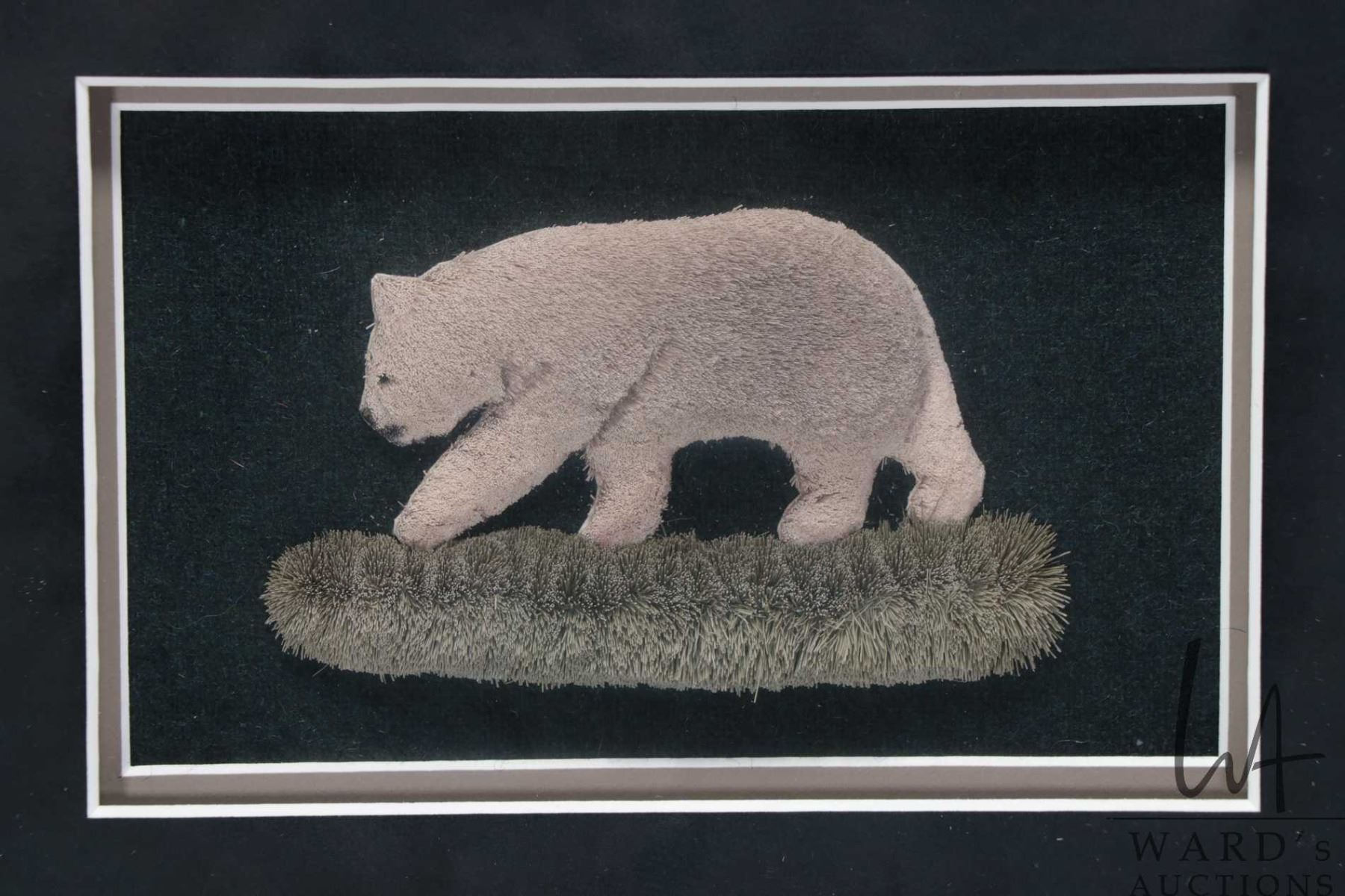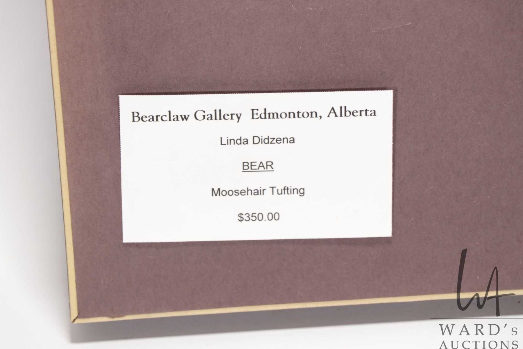 Framed moose hair tufted picture of a brown bear by artist Linda Didzena, overall dimensions including frame 11" X 13 1/2"