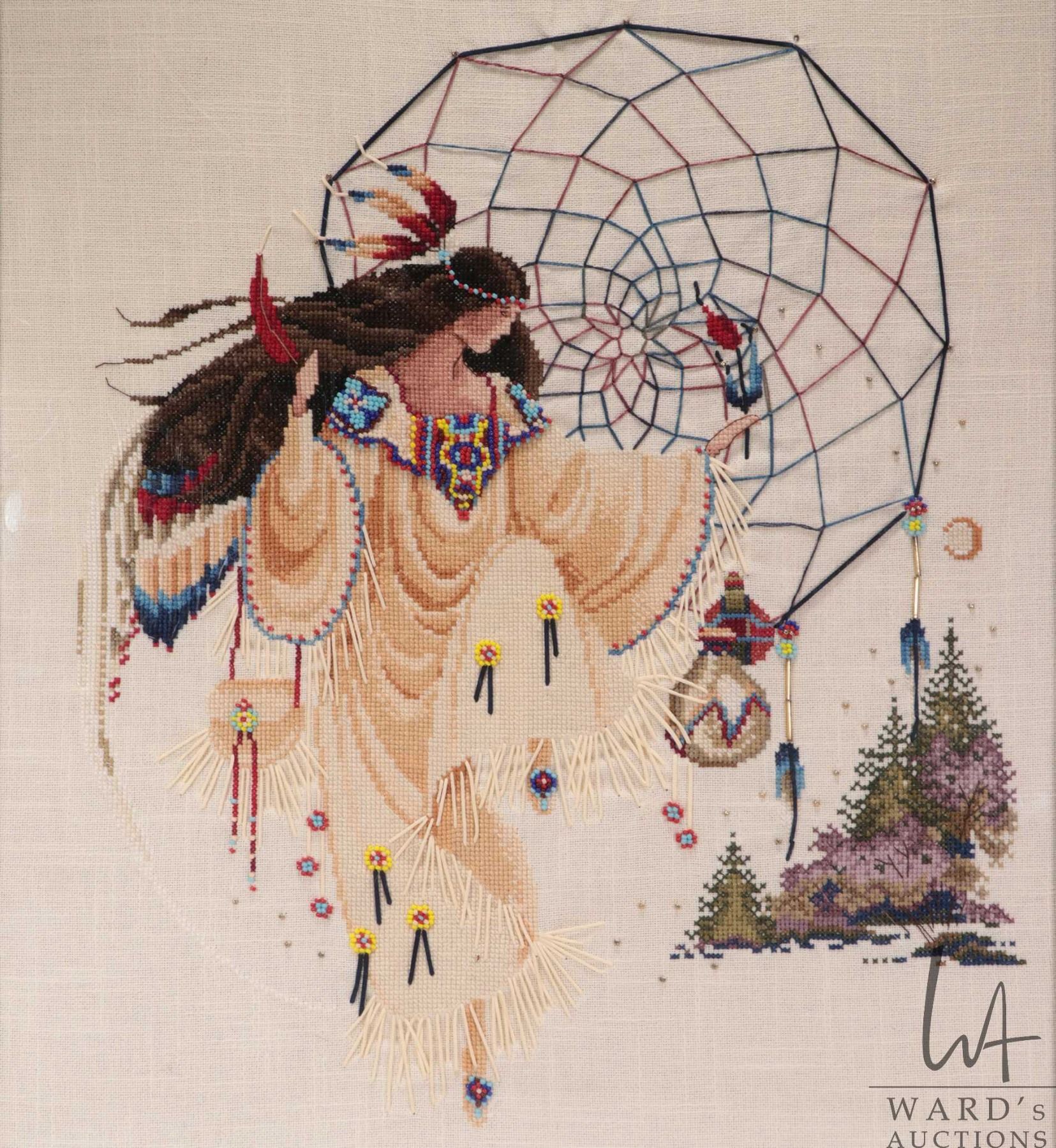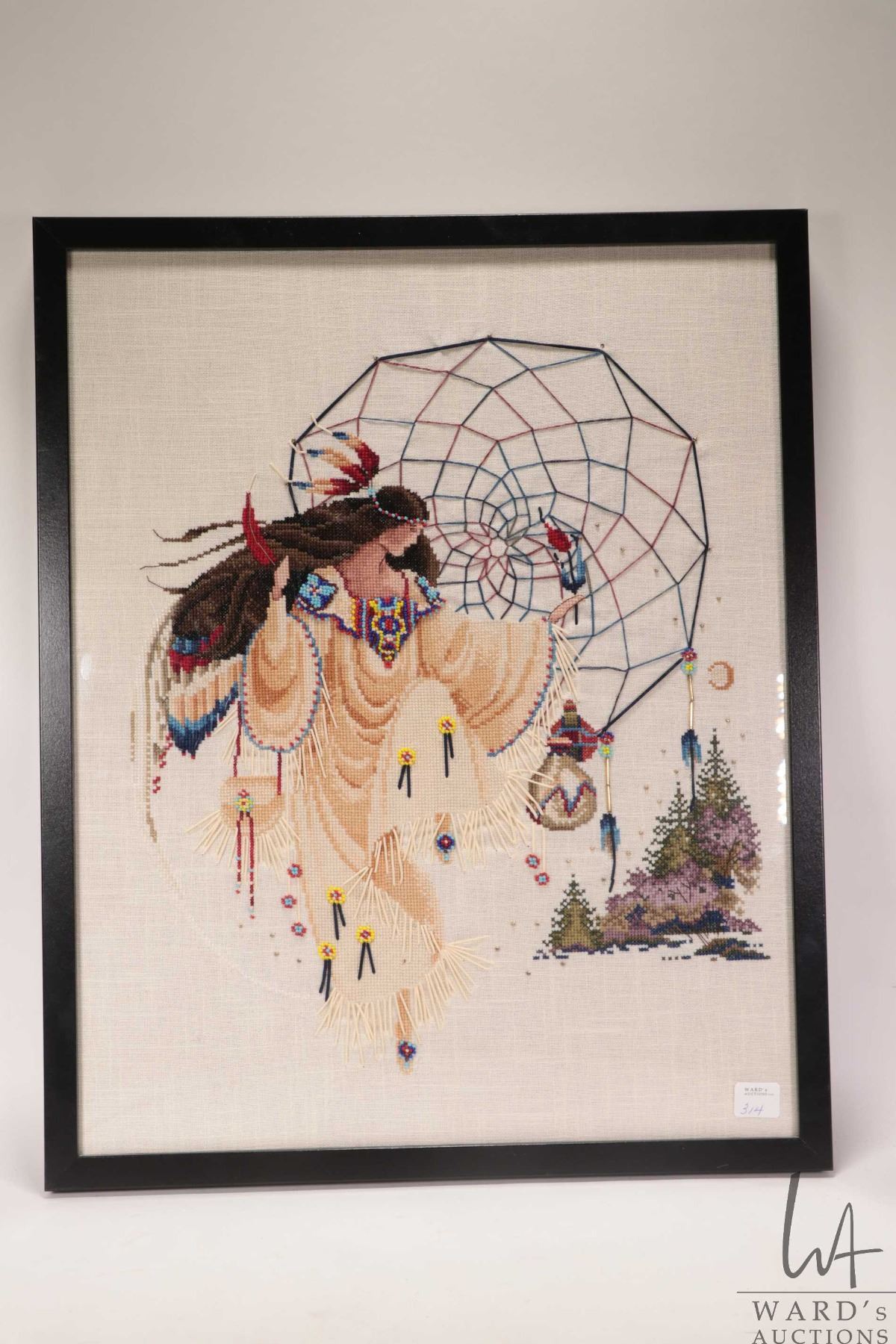 Framed needle and beadwork picture of a Indigenous woman and dream catcher, overall dimensions inclu