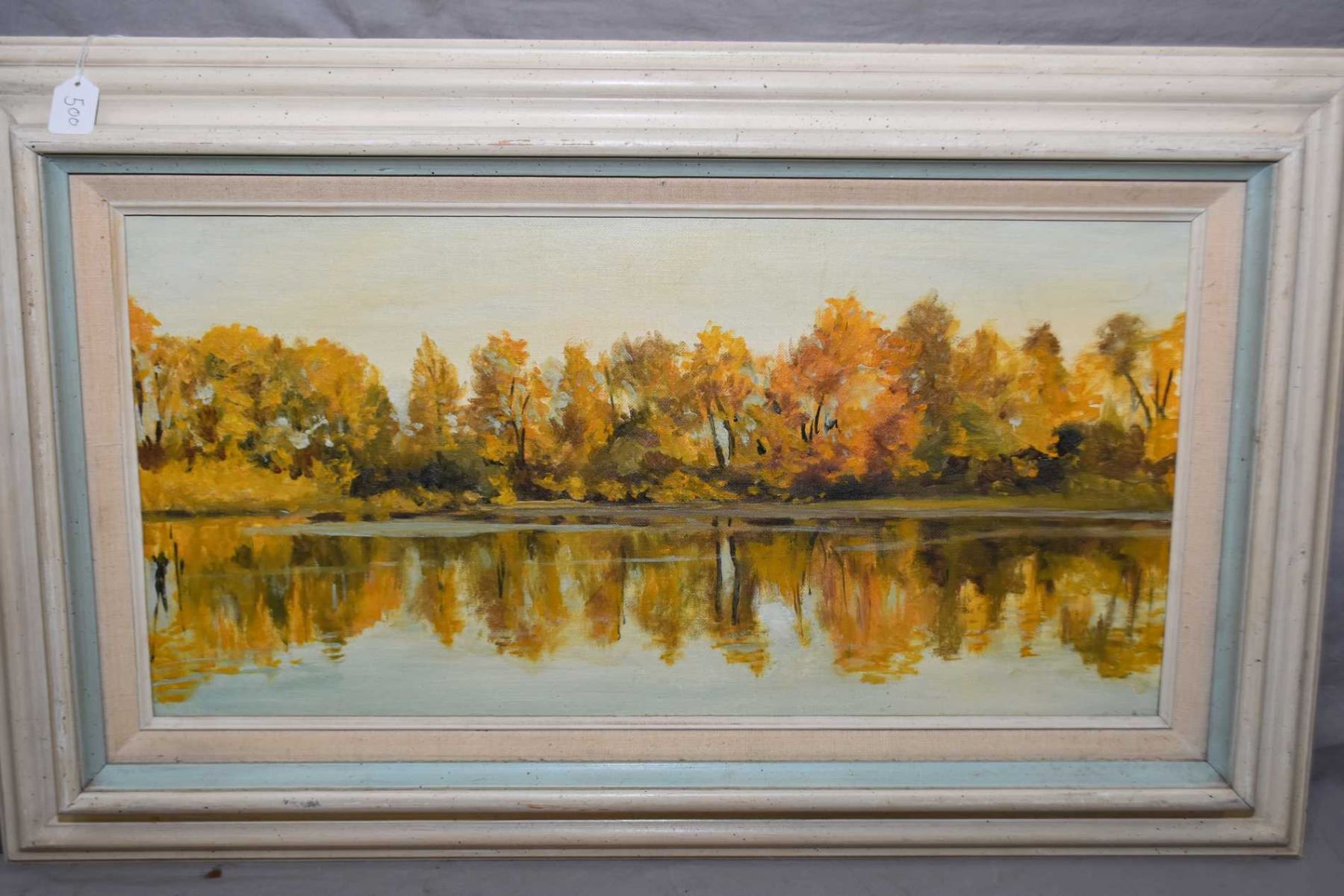 Framed oil on board painting of a Reflective Autumn scene, unsigned by Crane Thomas and consigned by