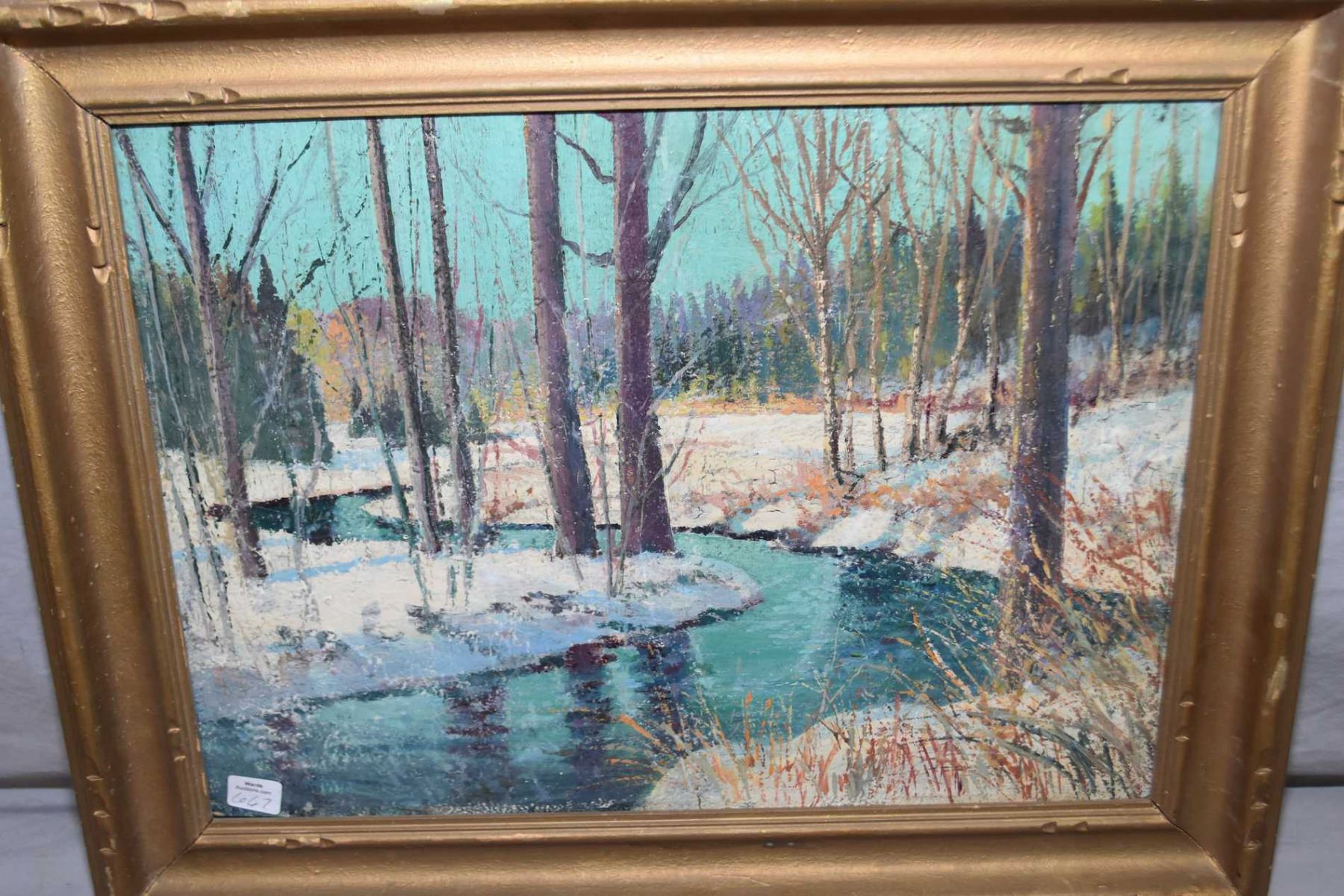 Framed oil on board painting of a wooded creek in winter, no artist signature seen 13" X 18"