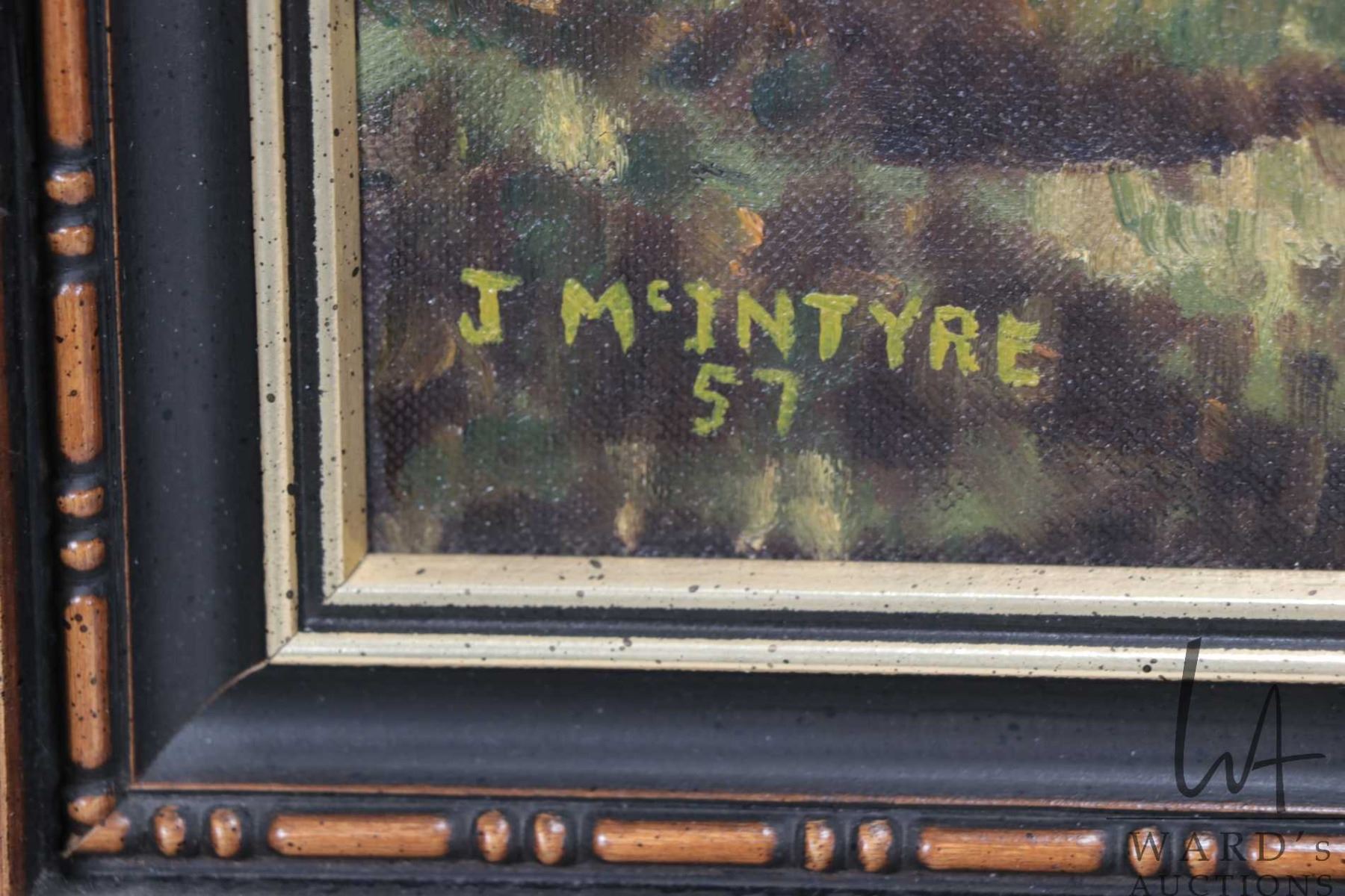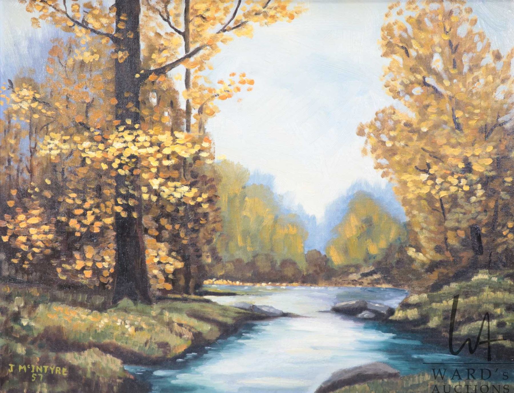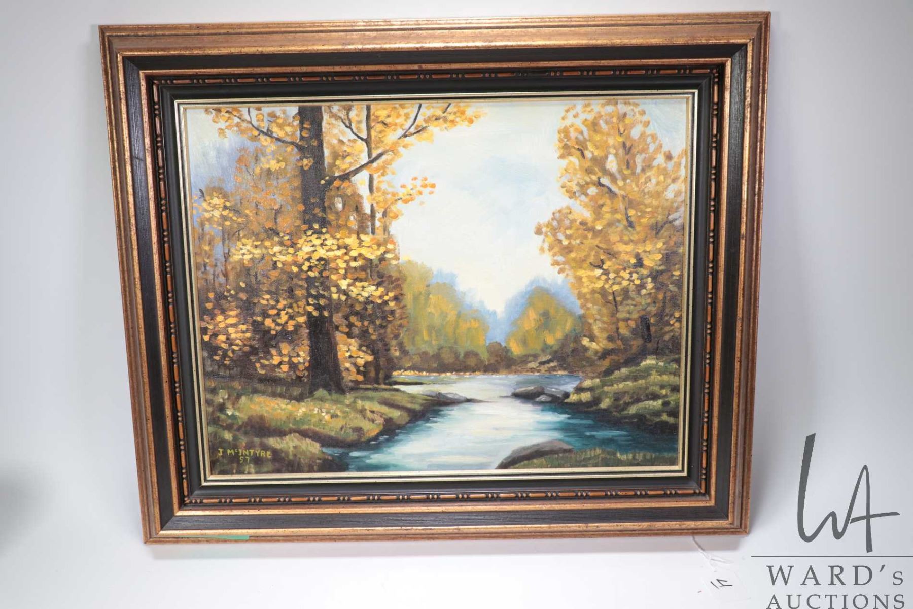 Framed oil on board painting of an autumnal creek scene, signed by artist J. McIntyre 57, 14" X 18"