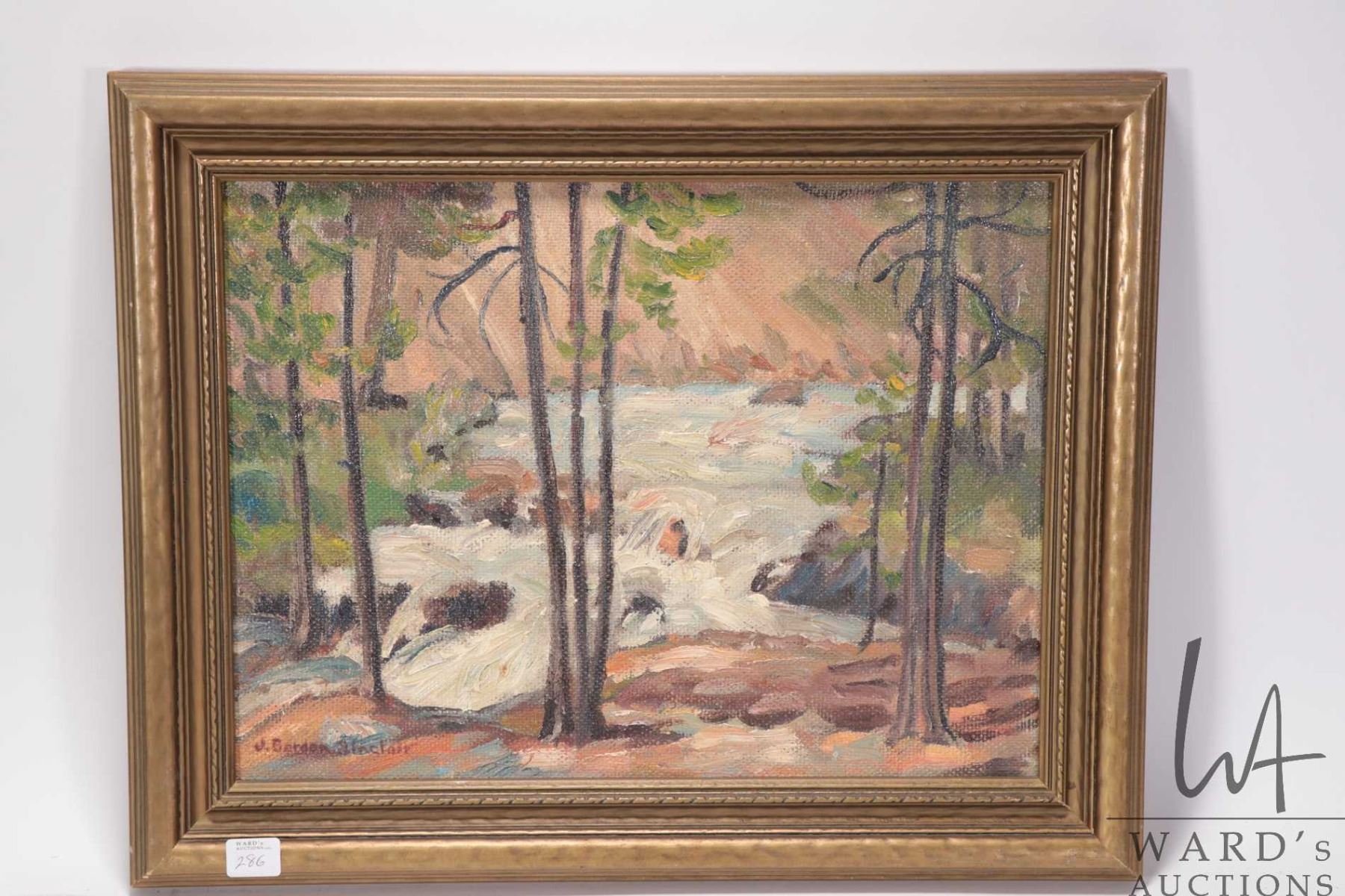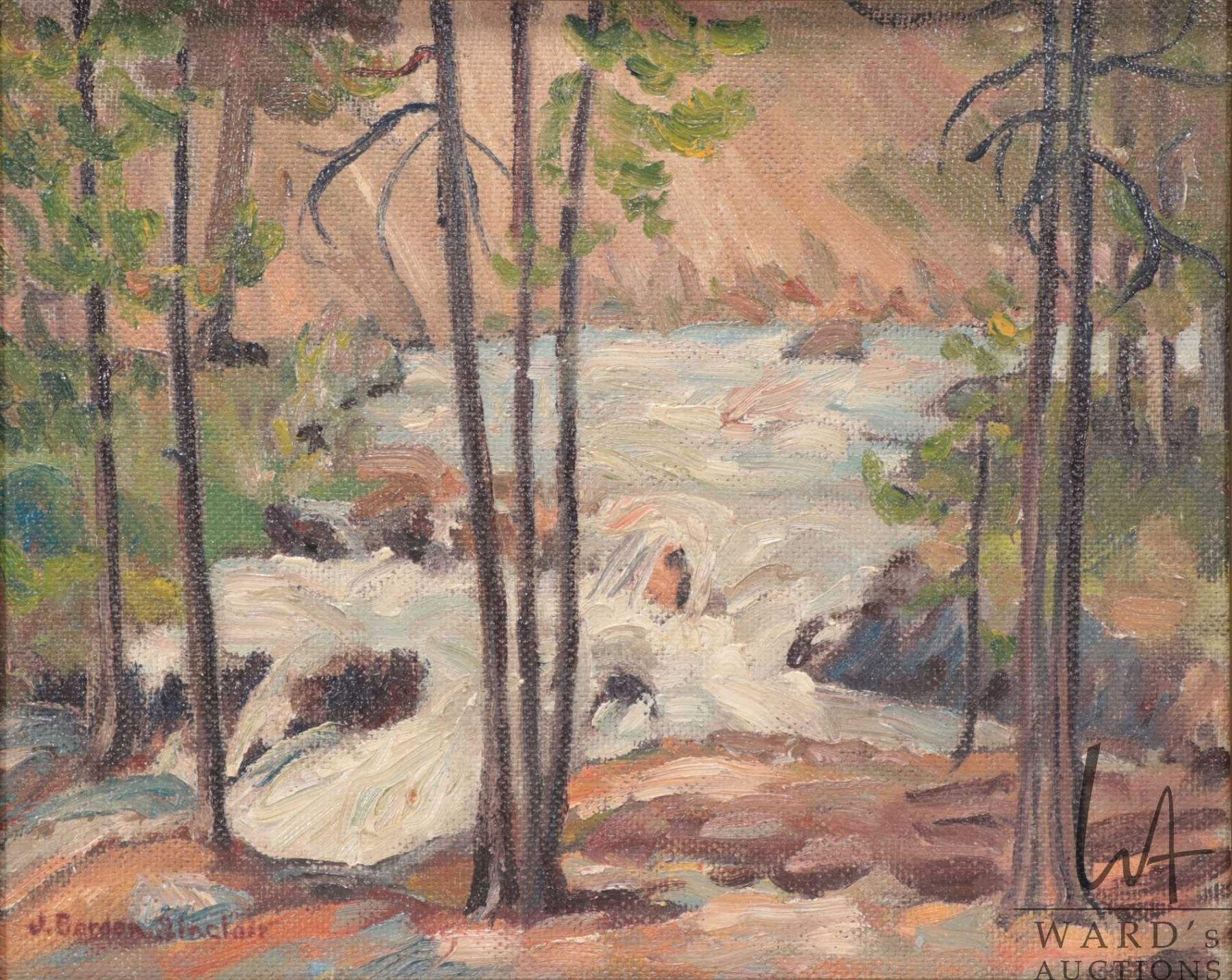 Framed oil on board painting, titled on verso "Jonas Creek Fall, Mile 50 J-B Highway" signed by artist Gordon Sinclair, 12" X 16". NOTE: This Lot Is Not Available For Shipping. Local pickup only.