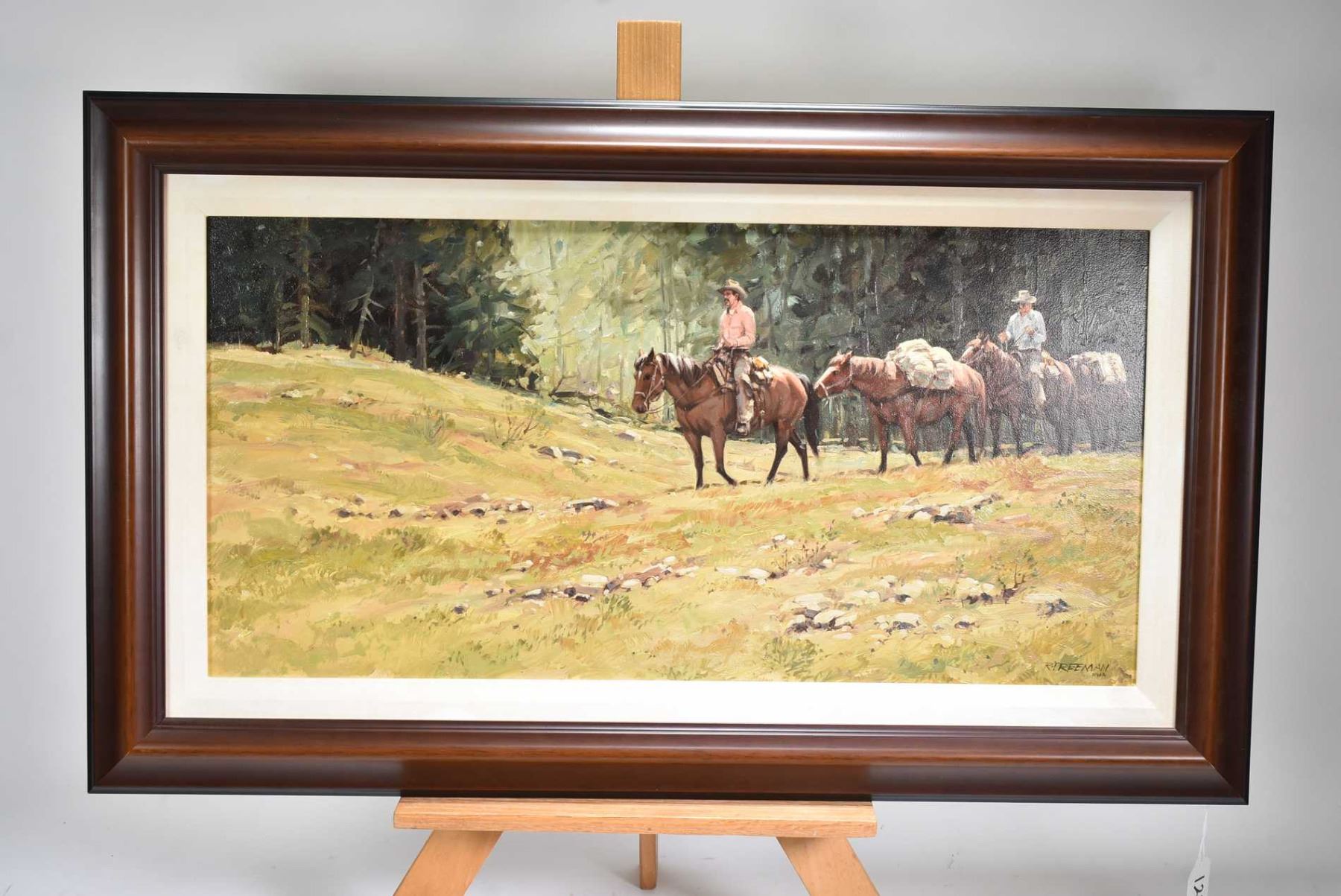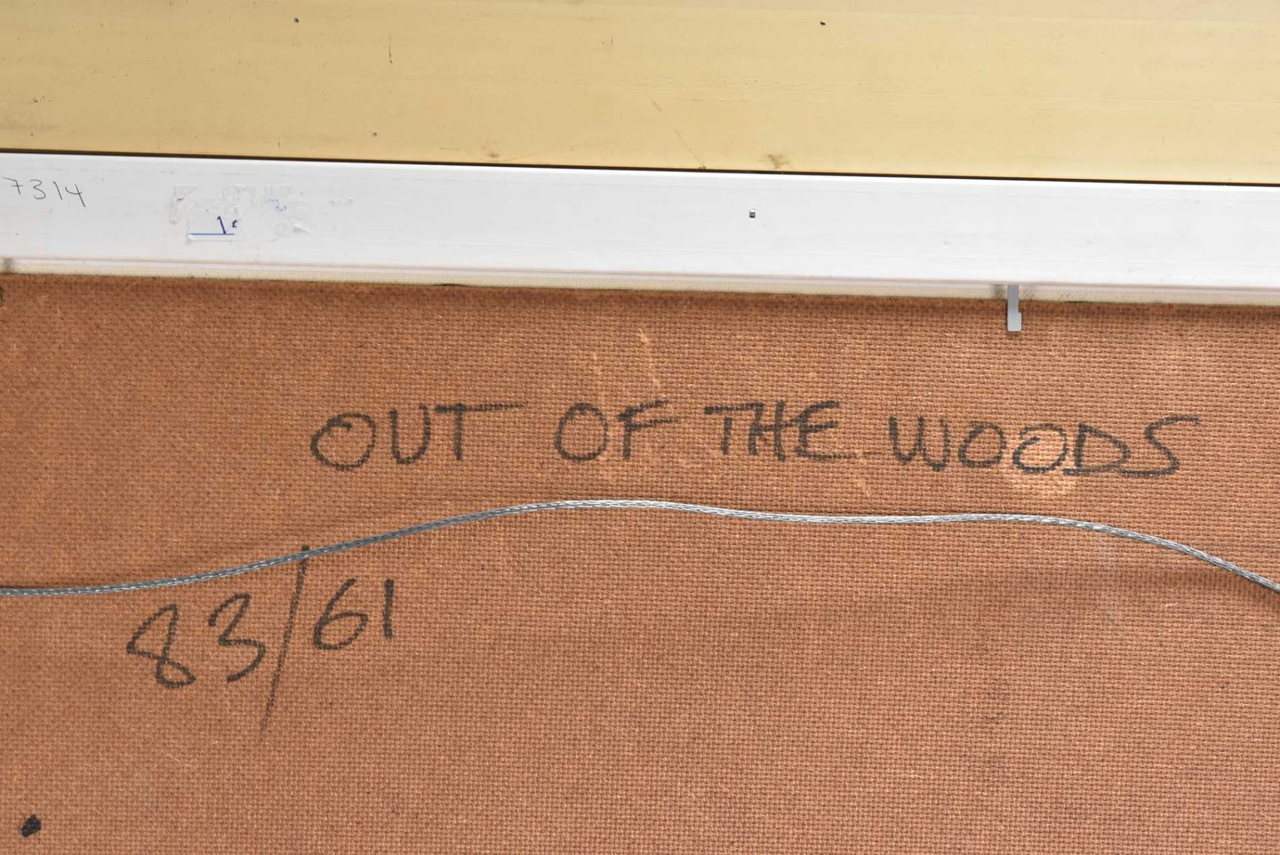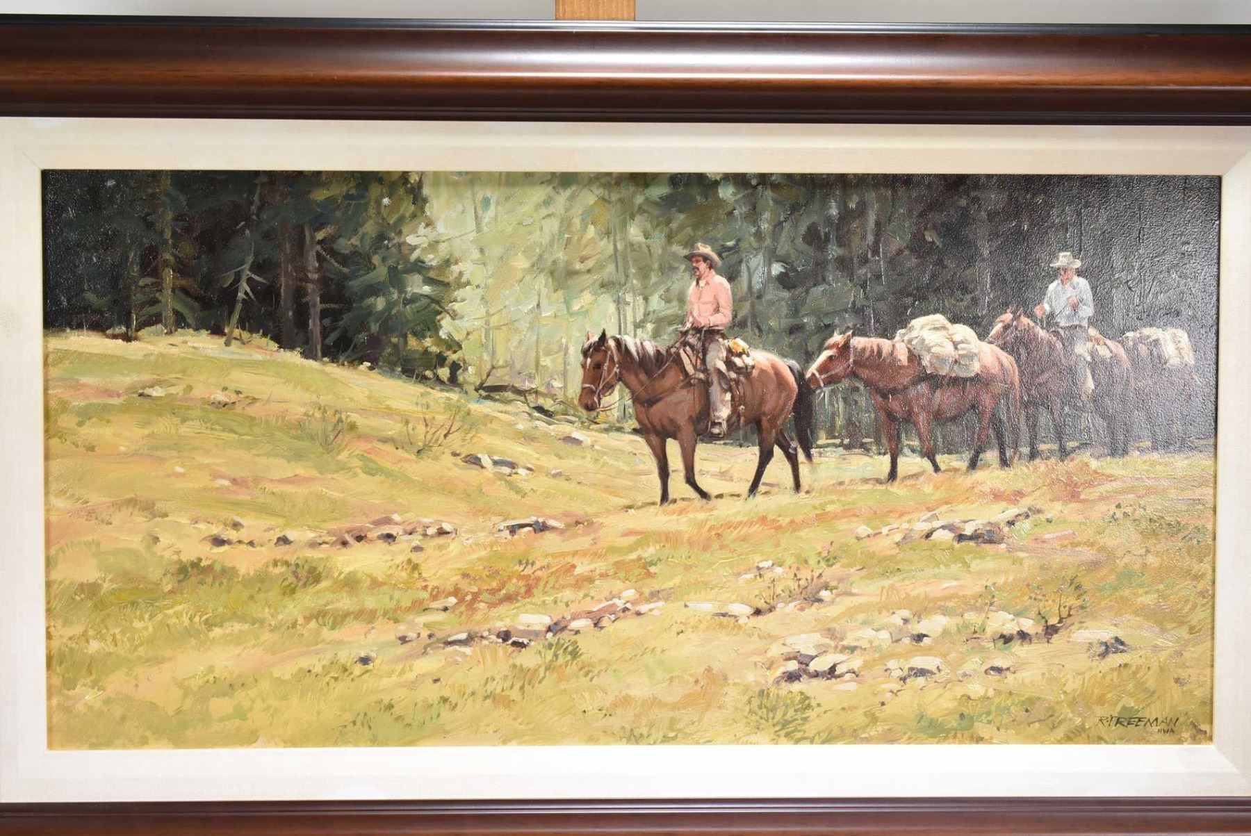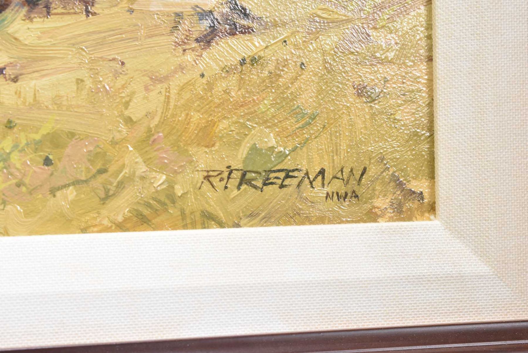 Framed oil on board painting titled on verso "Out of the Woods" by artist R. Freeman NWA ( Richard Audley Freeman) 12" X 24"