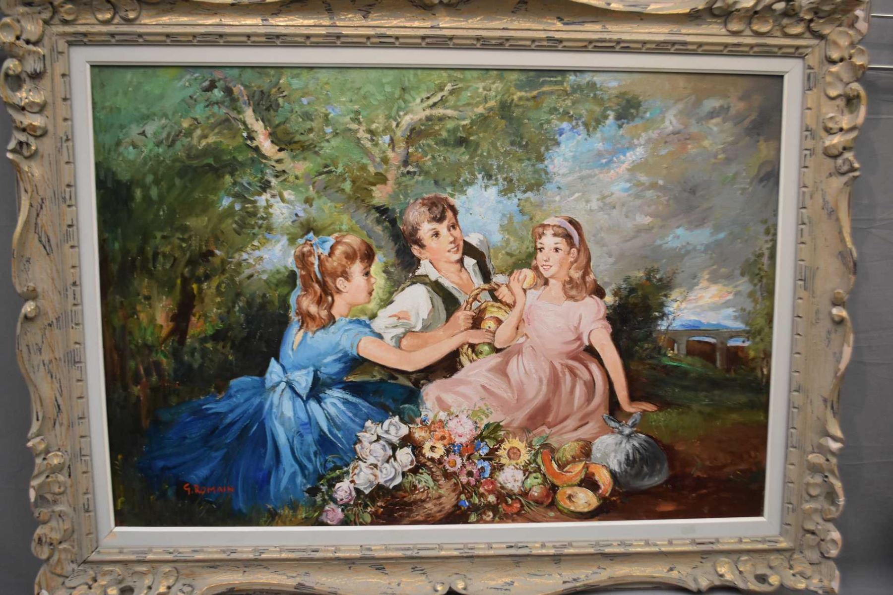 Framed oil on canvas painting featuring children at a picnic signed by artist G. Romain, 26" X 38"