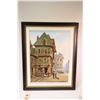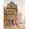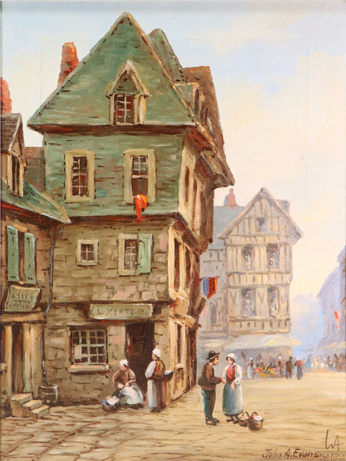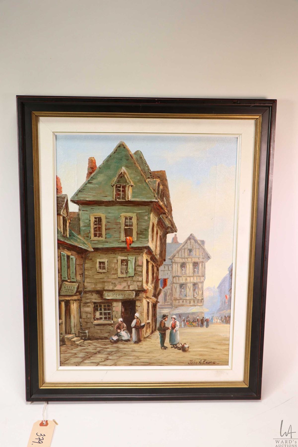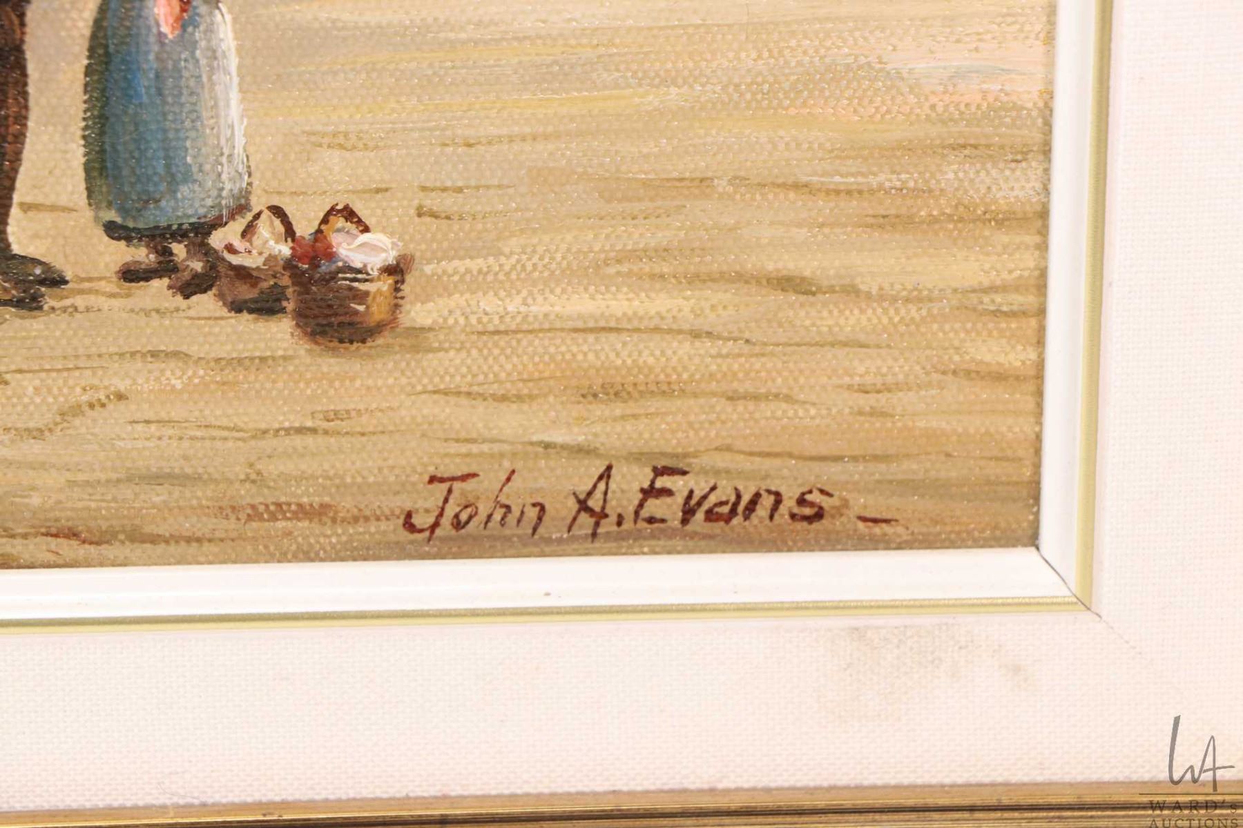 Framed oil on canvas painting of a European street scene set in the middle ages, signed by artist John A. Evans, 15 1/4" X 11 1/2"