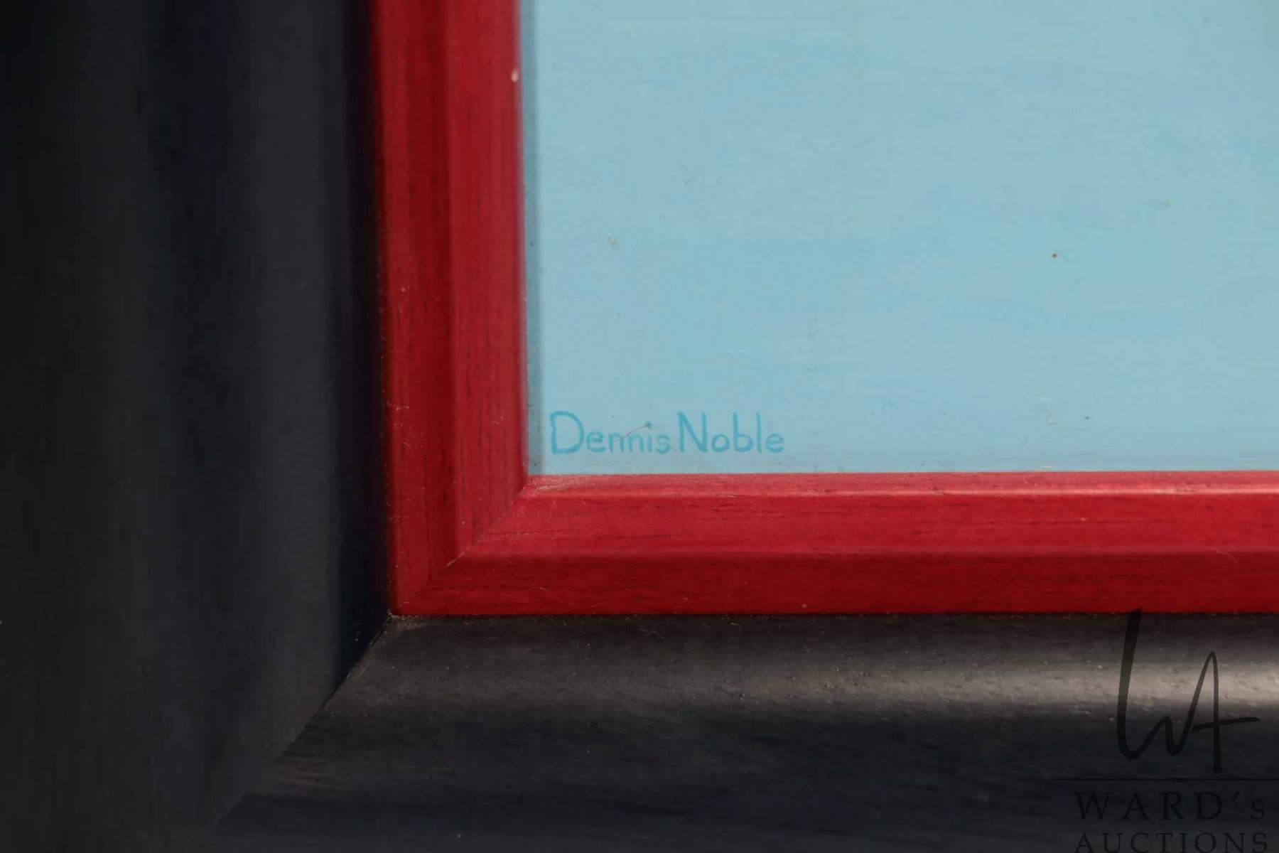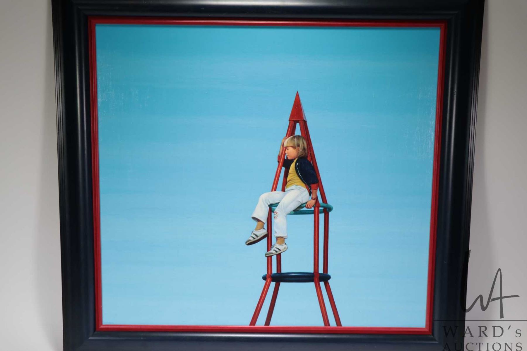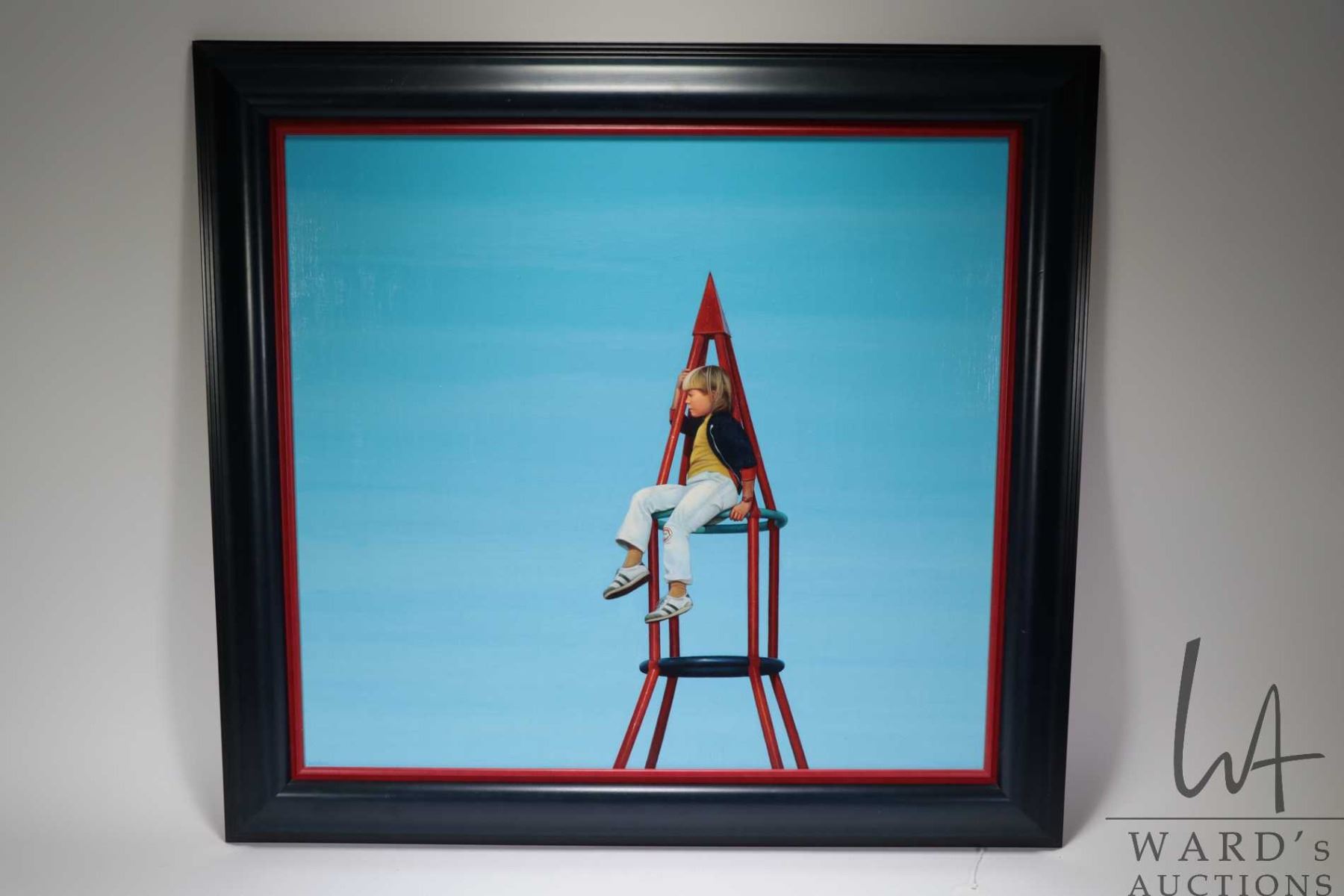 Framed oil on canvas painting of a child in the playground, signed by artist Denis Noble, 22" X 24". Note: Not available for shipping. Local pickup only