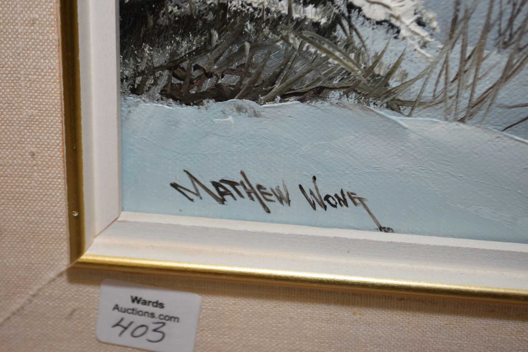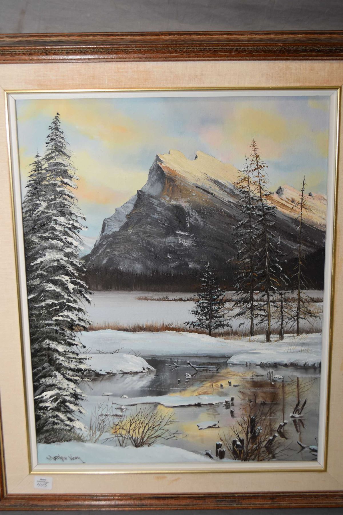 Framed oil on canvas painting of a wintry mountain scene by Alberta artist Mathew Wong, 20" X 16"