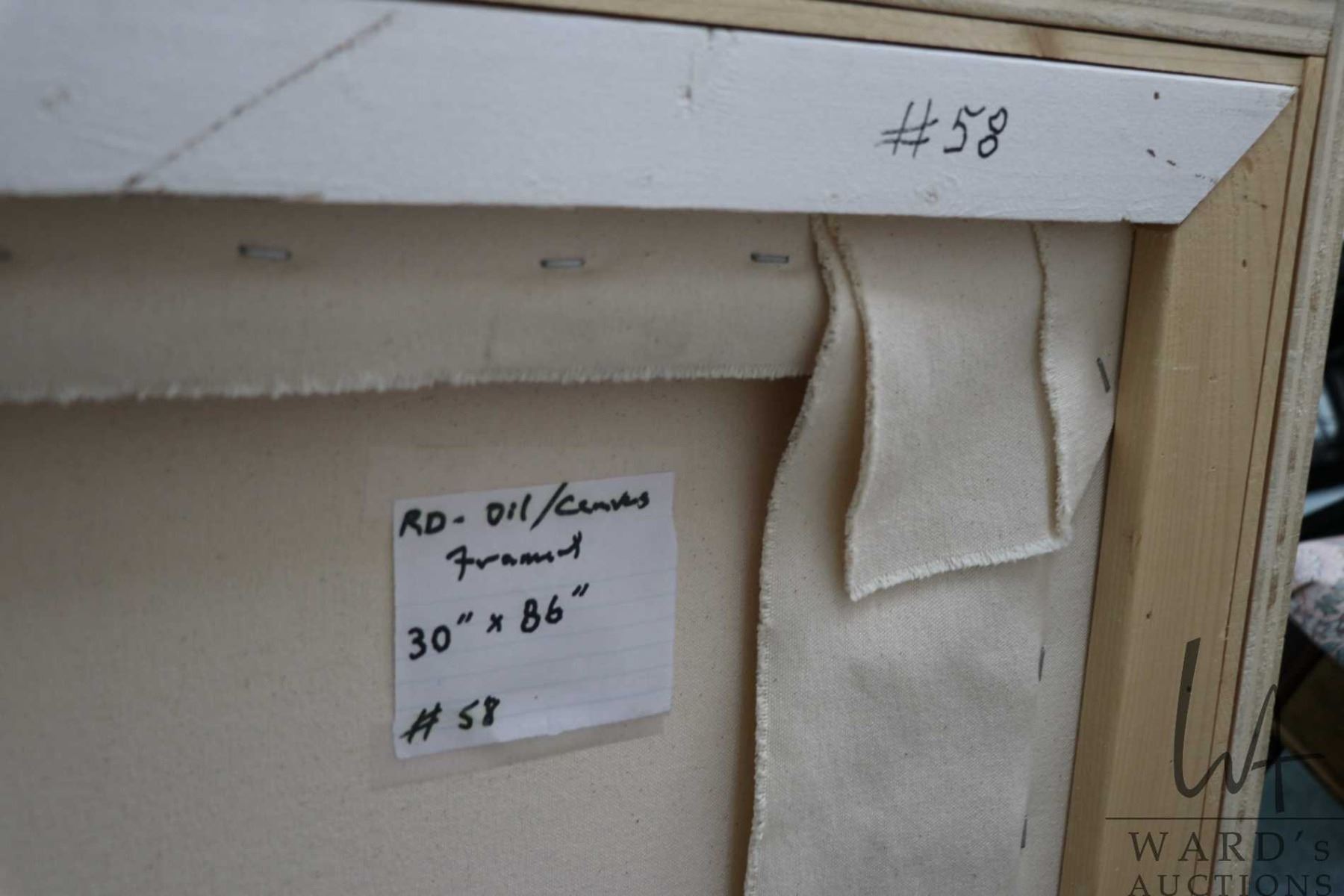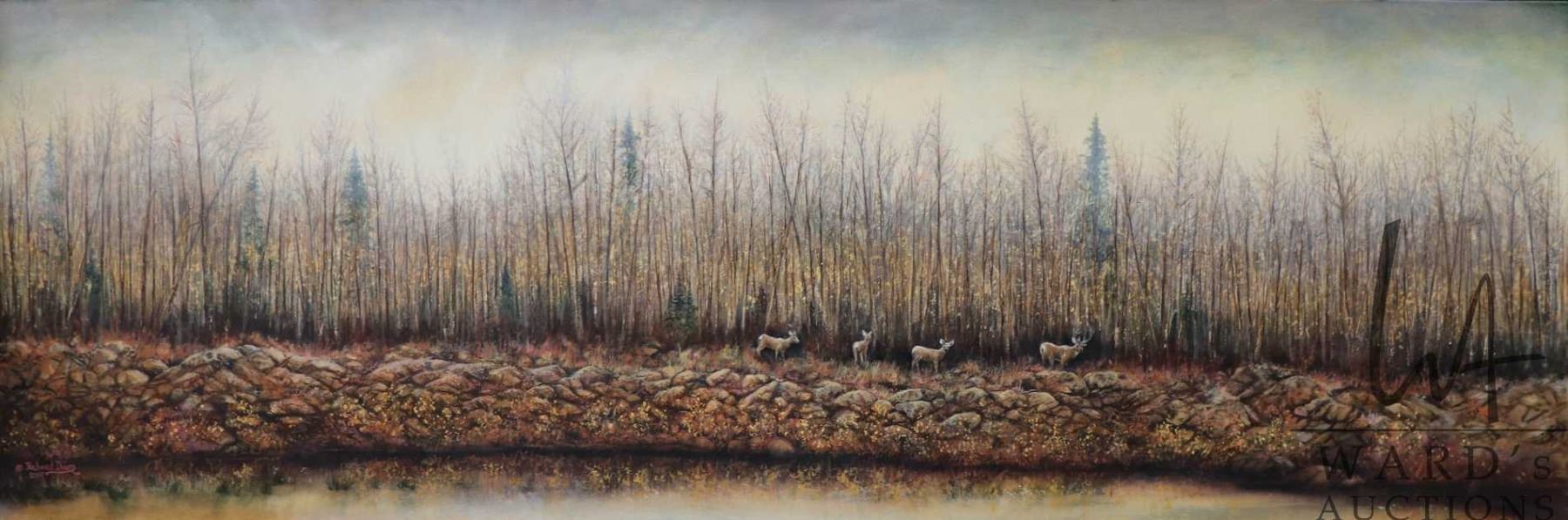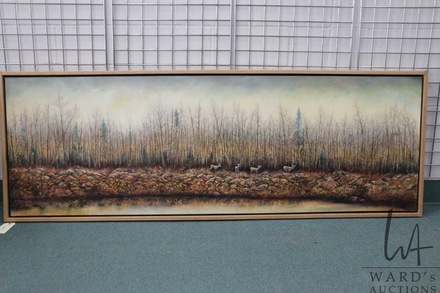 Framed oil on canvas painting of an autumnal forest scene with migrating deer, signed by artist Richard Dixon 2009, 30" X 86". NOTE: This is too large to ship through most couriers and will be expensive to ship. Artwork cannot be insured. Local pickup only. Note: Any claims that this item is currently under legal dispute are false. The consignor has provided legal documentation and Ward's has confirmed with the disputing party that there are no legal filings or court orders to supersede it. Copies are available to successful buyers upon request.