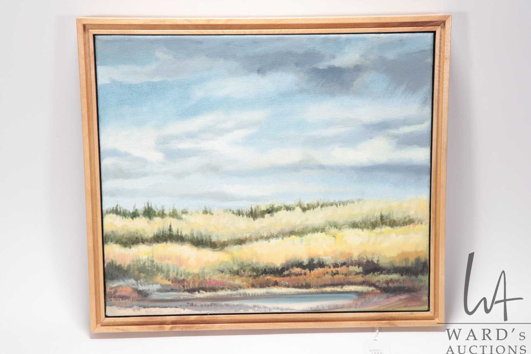 Framed oil on canvas painting titled on verso "Elk Island Trees" by Canadian artist Richard Dixon, 1
