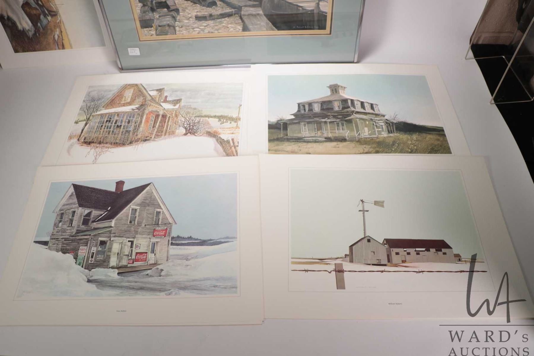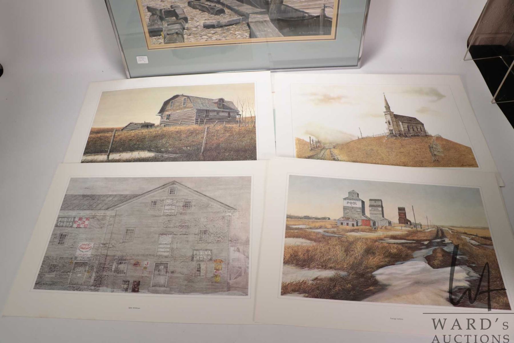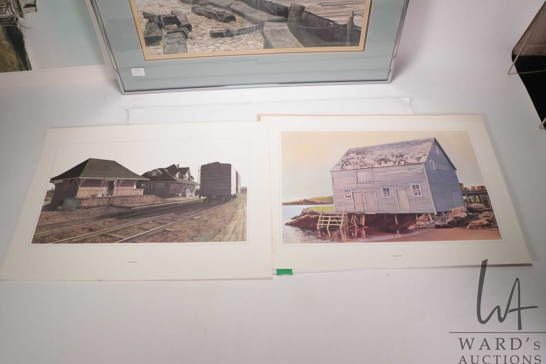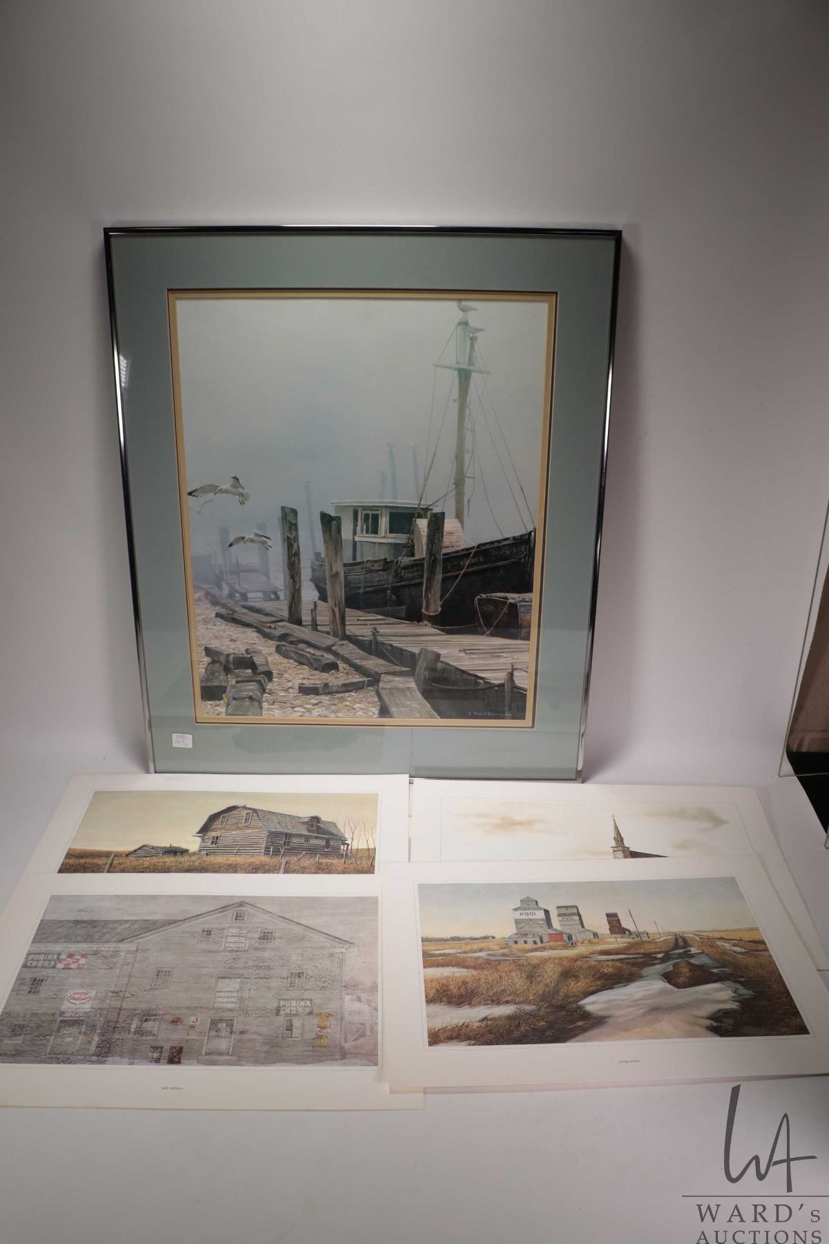 Framed open edition print of a docked boat by Robert Bateman titled " SARAH E. WITH GULLS ", overall dimensions including frame 26" X 22" plus folio of ten unframed "The Vanishing Building of Rural Canada". Note: Artwork cannot be insured and is often too large to ship. Local pickup.