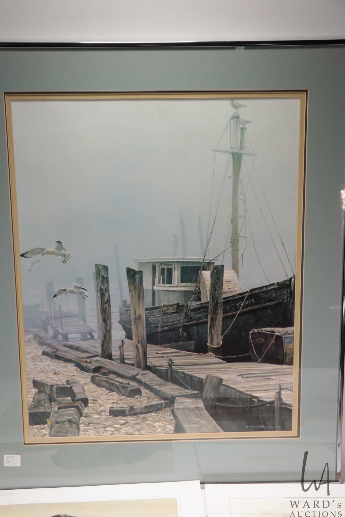 Framed open edition print of a docked boat by Robert Bateman, overall dimensions including frame 26"
