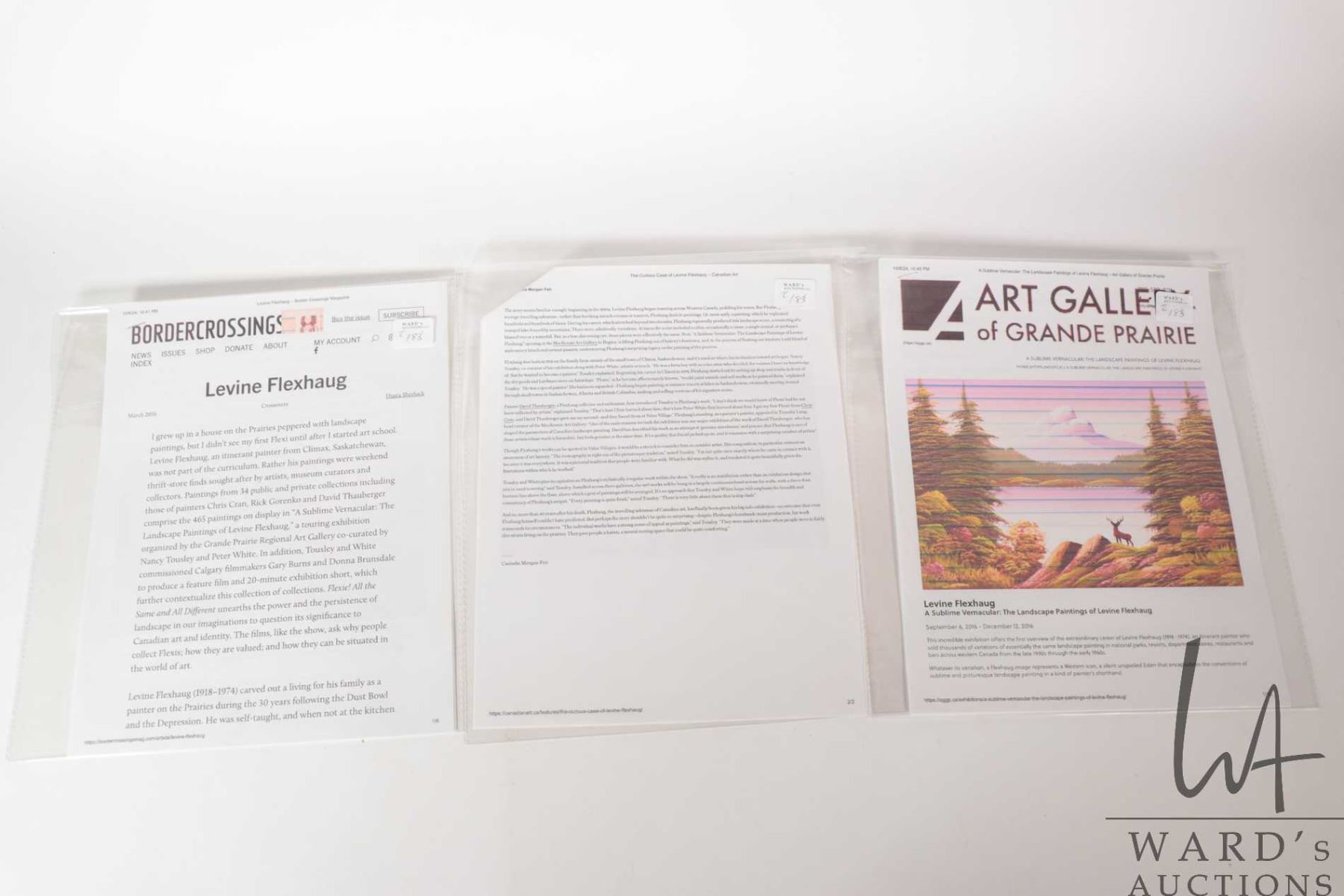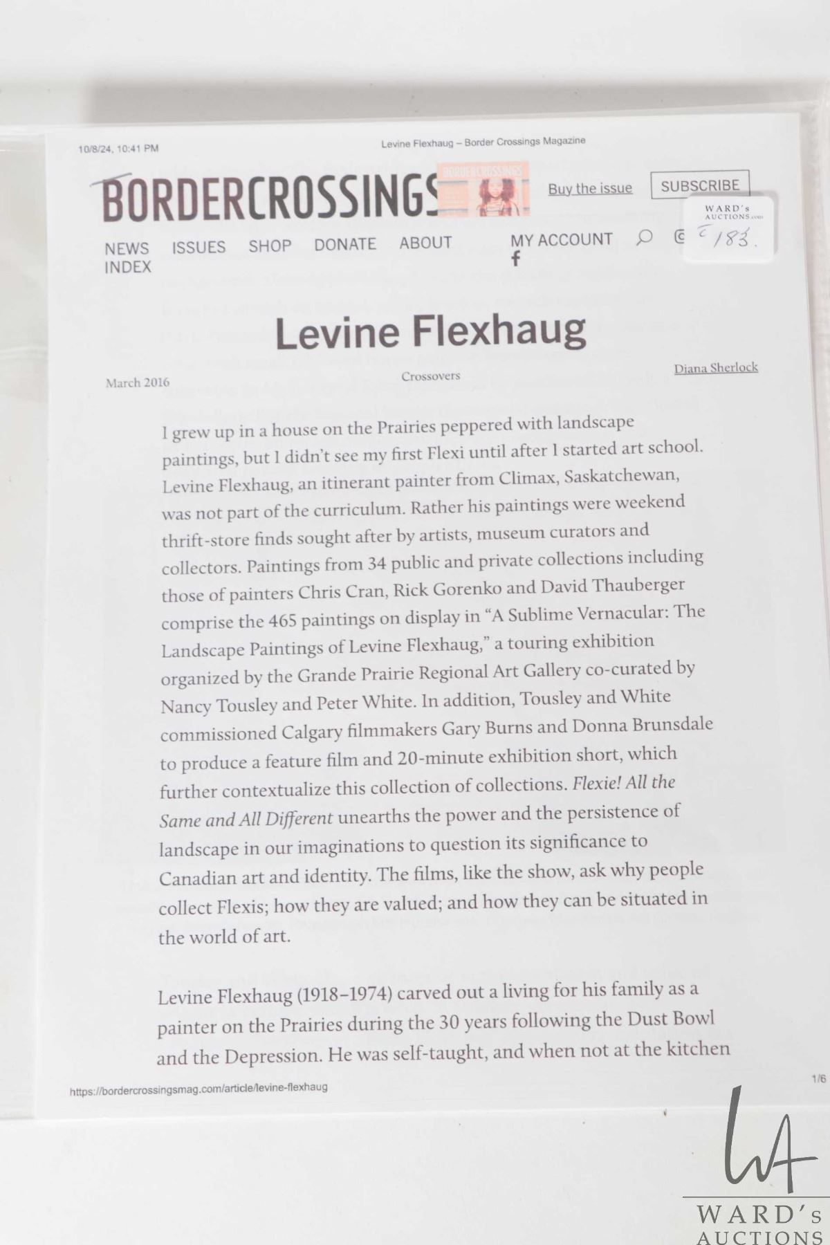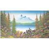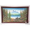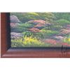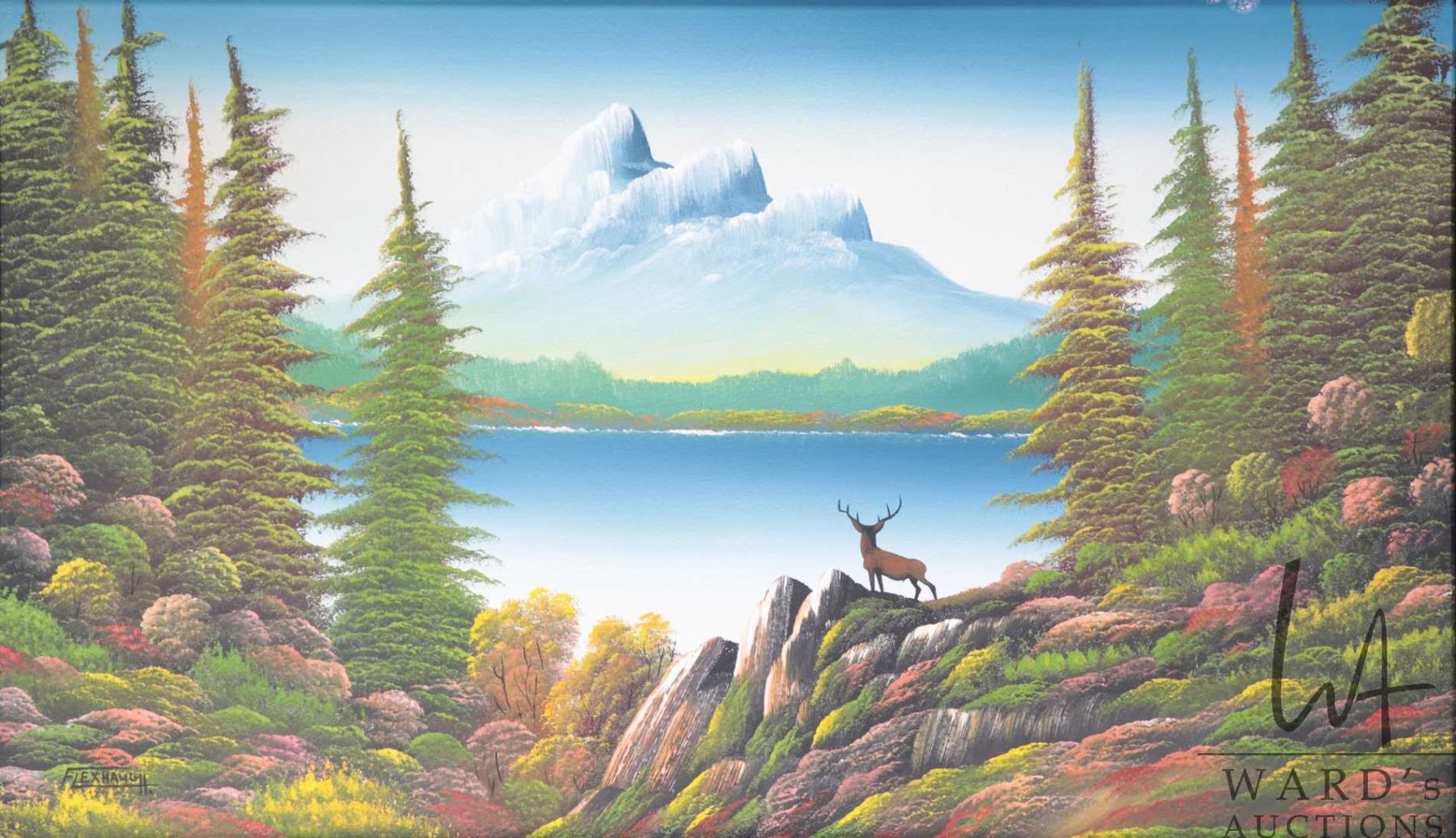 Framed original acrylic on board painted landscape with stag, signed by artist (Levine) Flexhaug, 13 3/4 X 23 1/2". Note: Artwork shipments cannot be insured. Local pickup recommended
