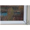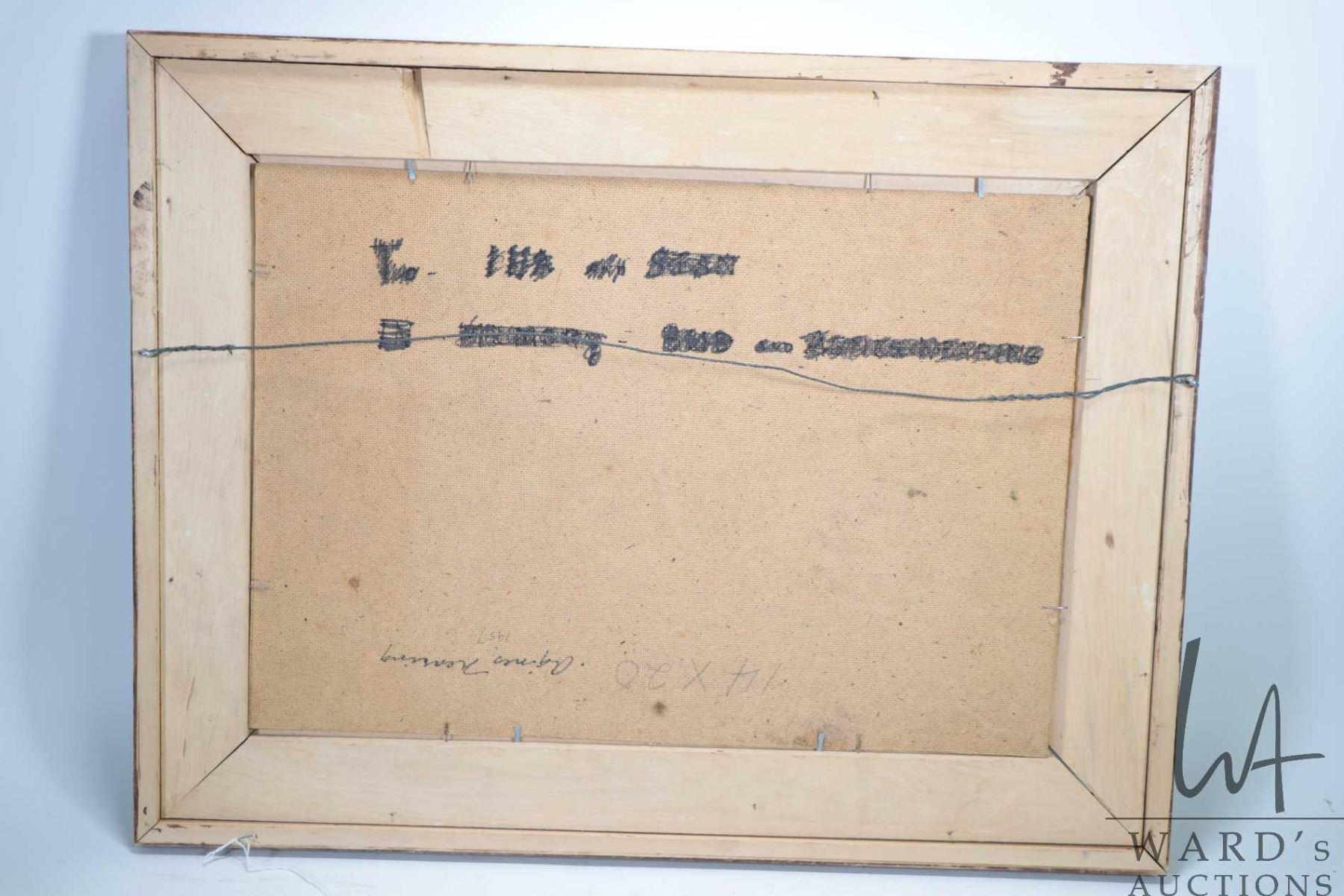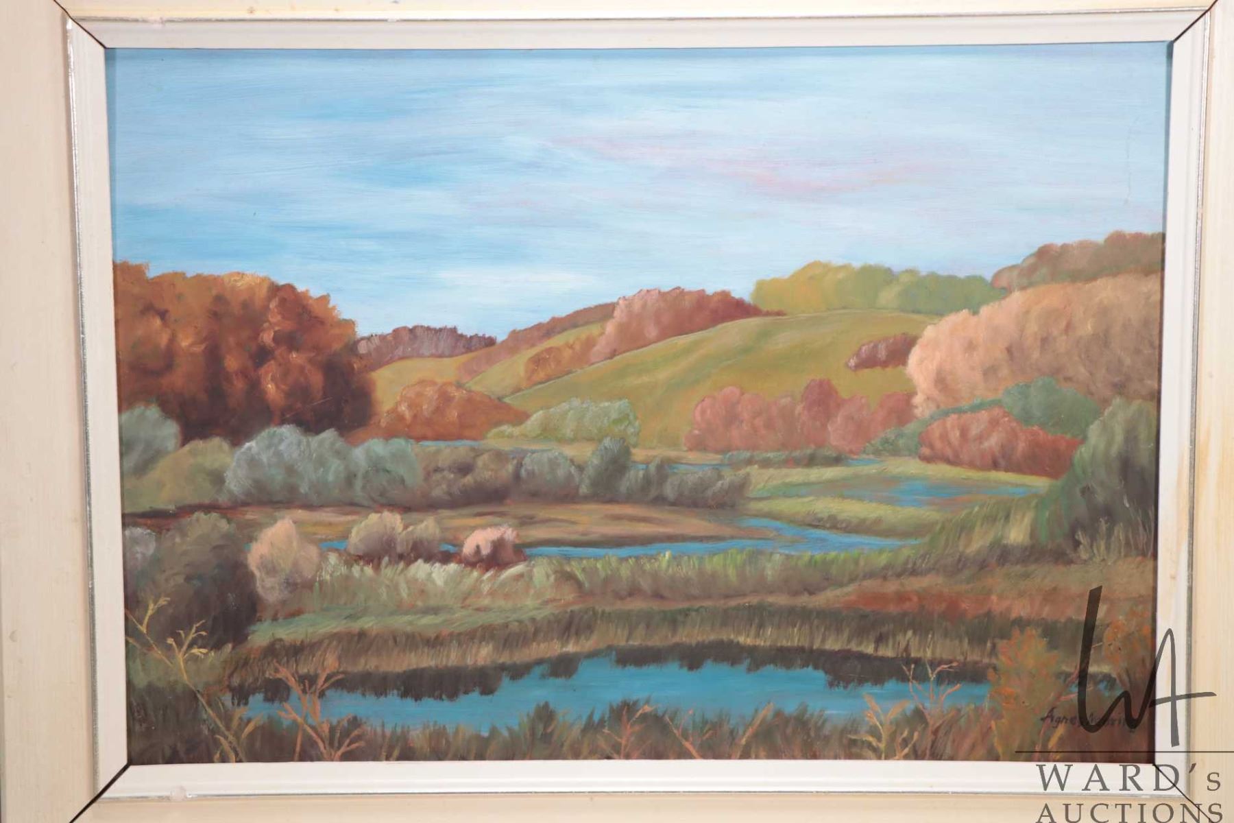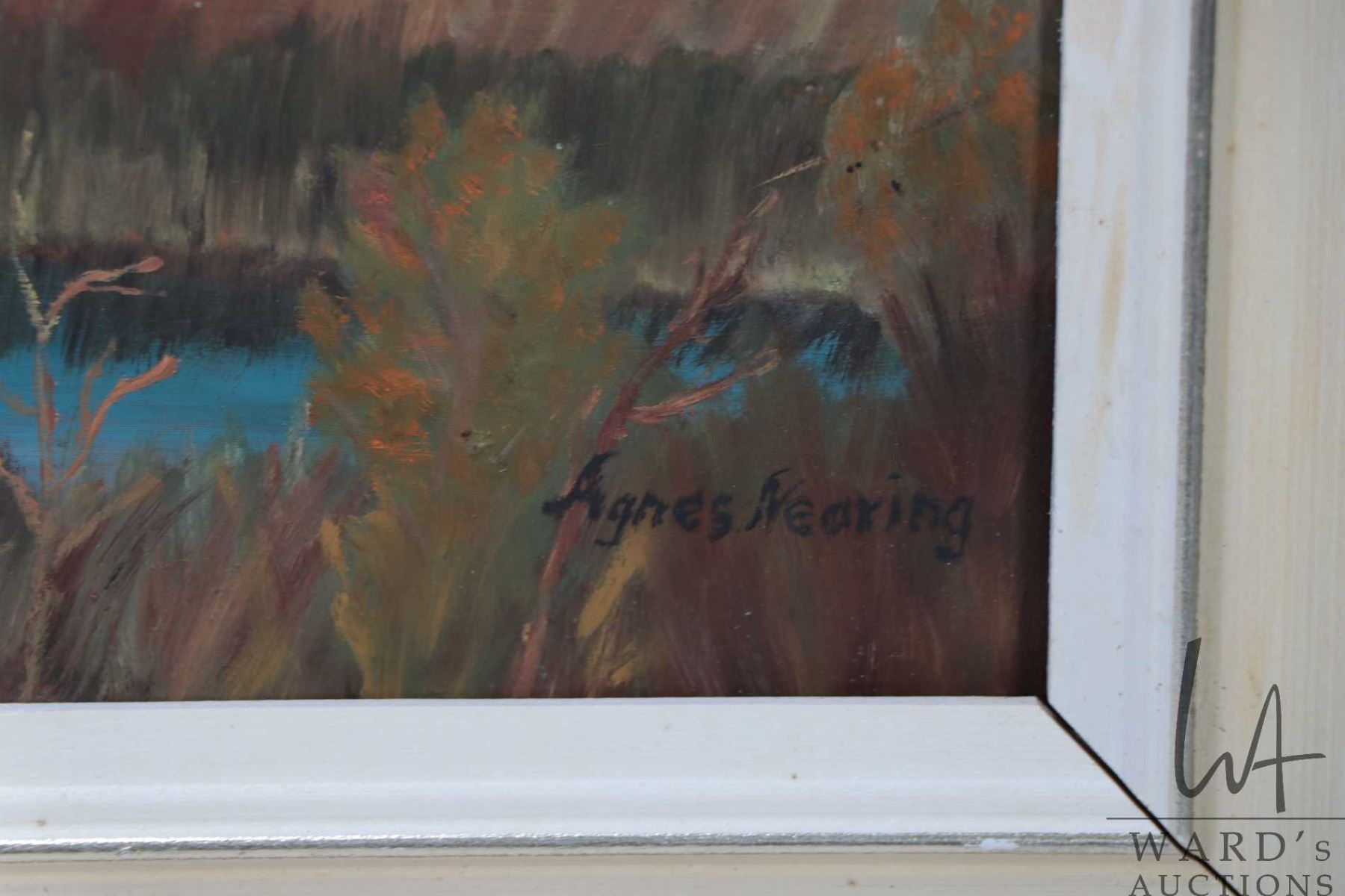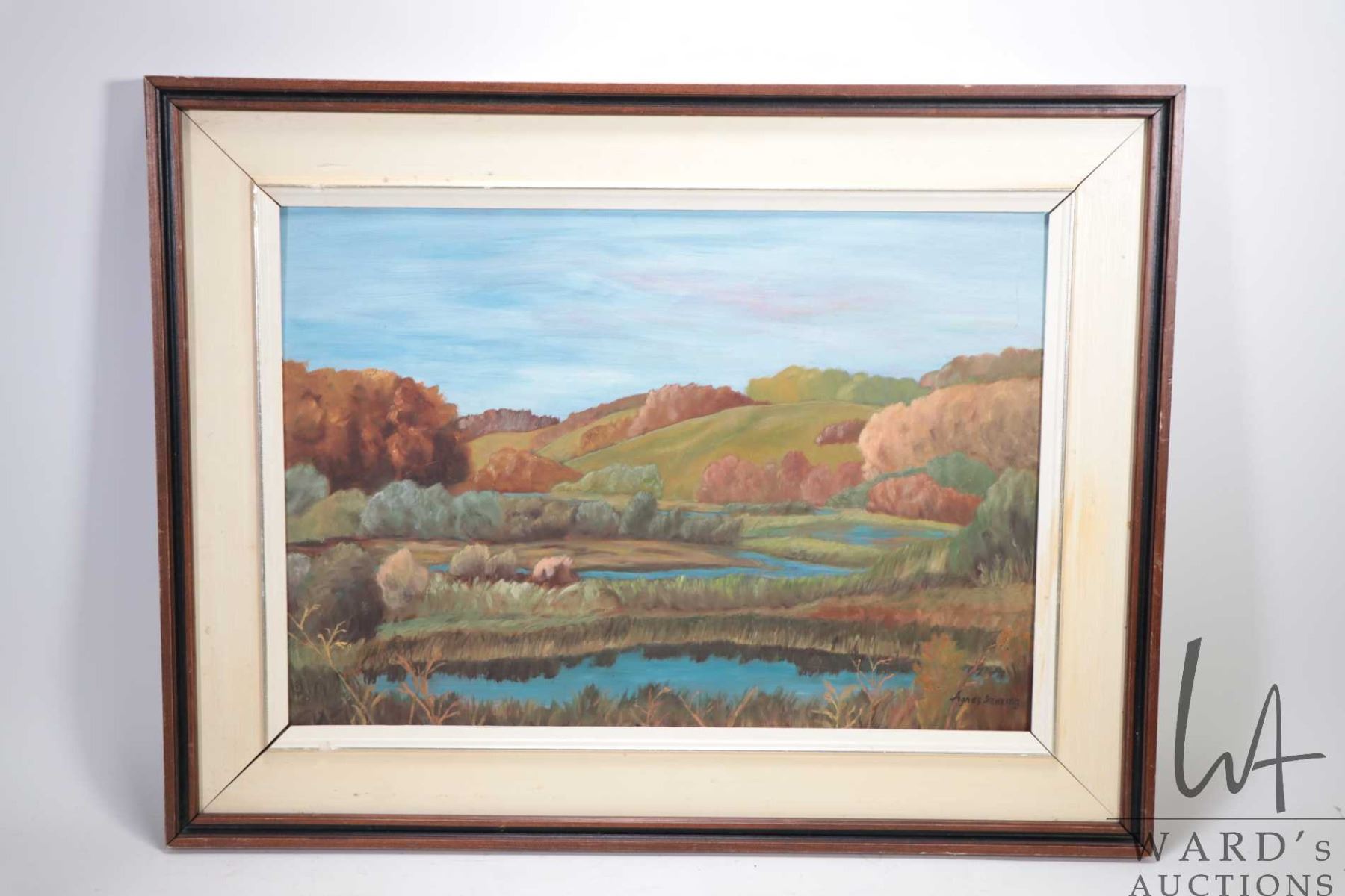 Framed original acrylic on board painting of a landscape scene with rolling hills, signed by artist Agnes Hearing and dated 1957, 13 3/4" X 19 1/4"