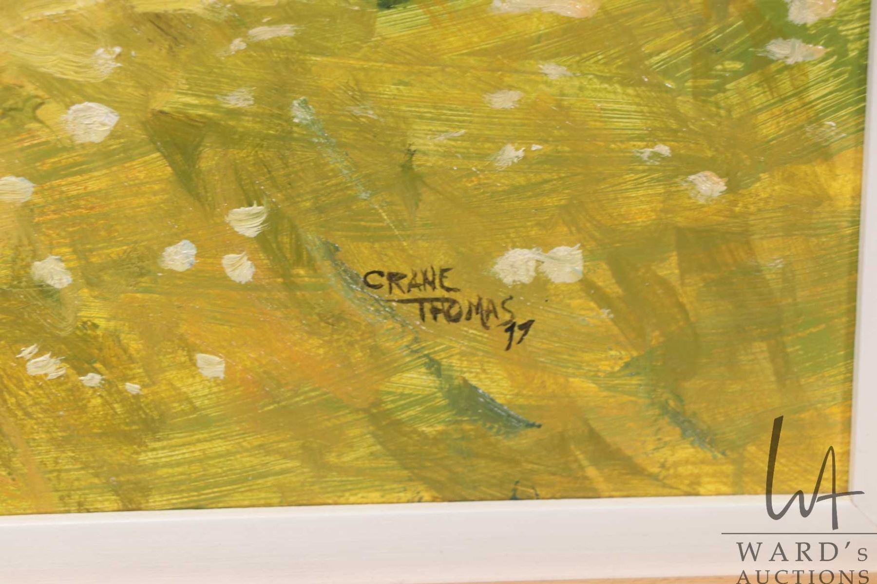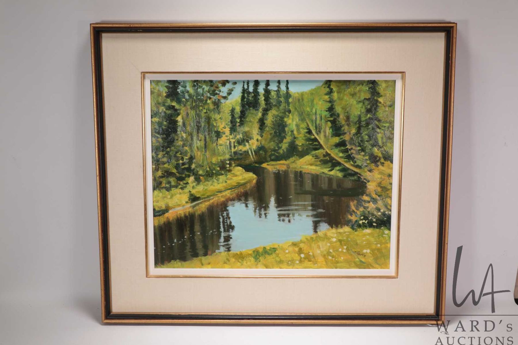 Framed original acrylic on board painting, of a wooded autumnal creek scene, signed by artist Crane Thomas '77, 17" X 21". Note: Artwork cannot be insured and is often too large to ship. Local pickup.