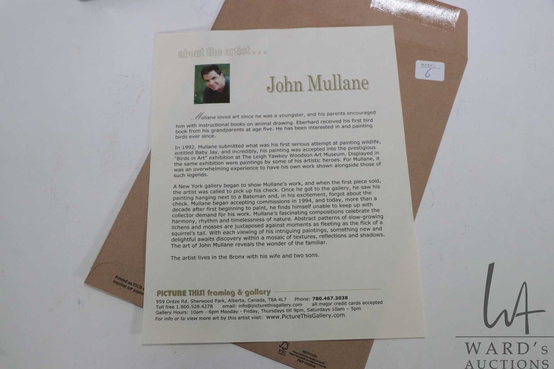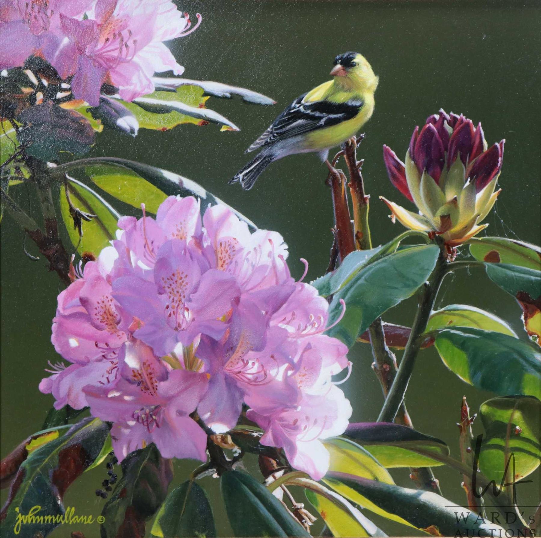 Framed original acrylic on panel painting "Gold Finch and Rhodedendrons" by artist John Mullane, 11" X 11"