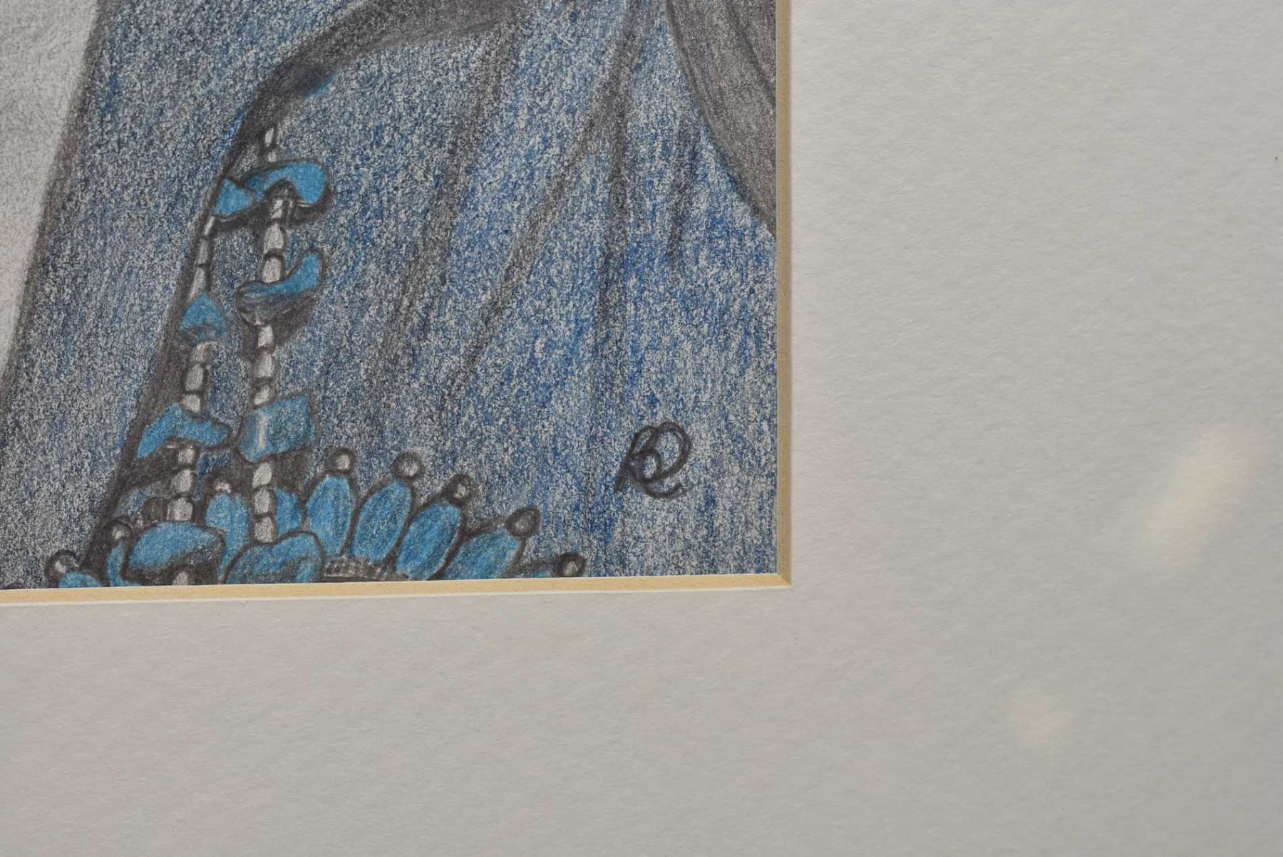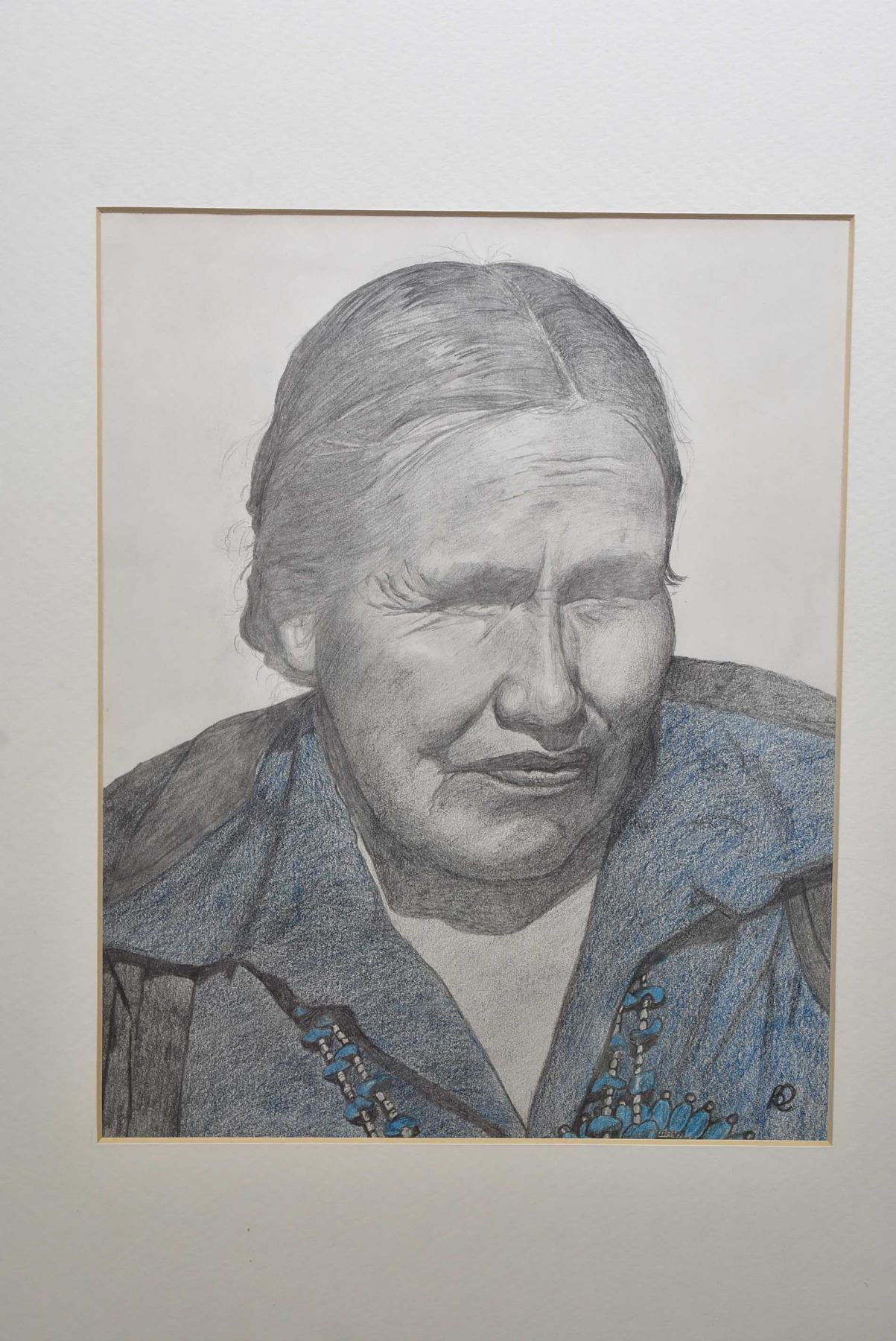 Framed original portrait pencil on paper drawing of a Southwestern native woman, inititalled by artist, 10" X 8"