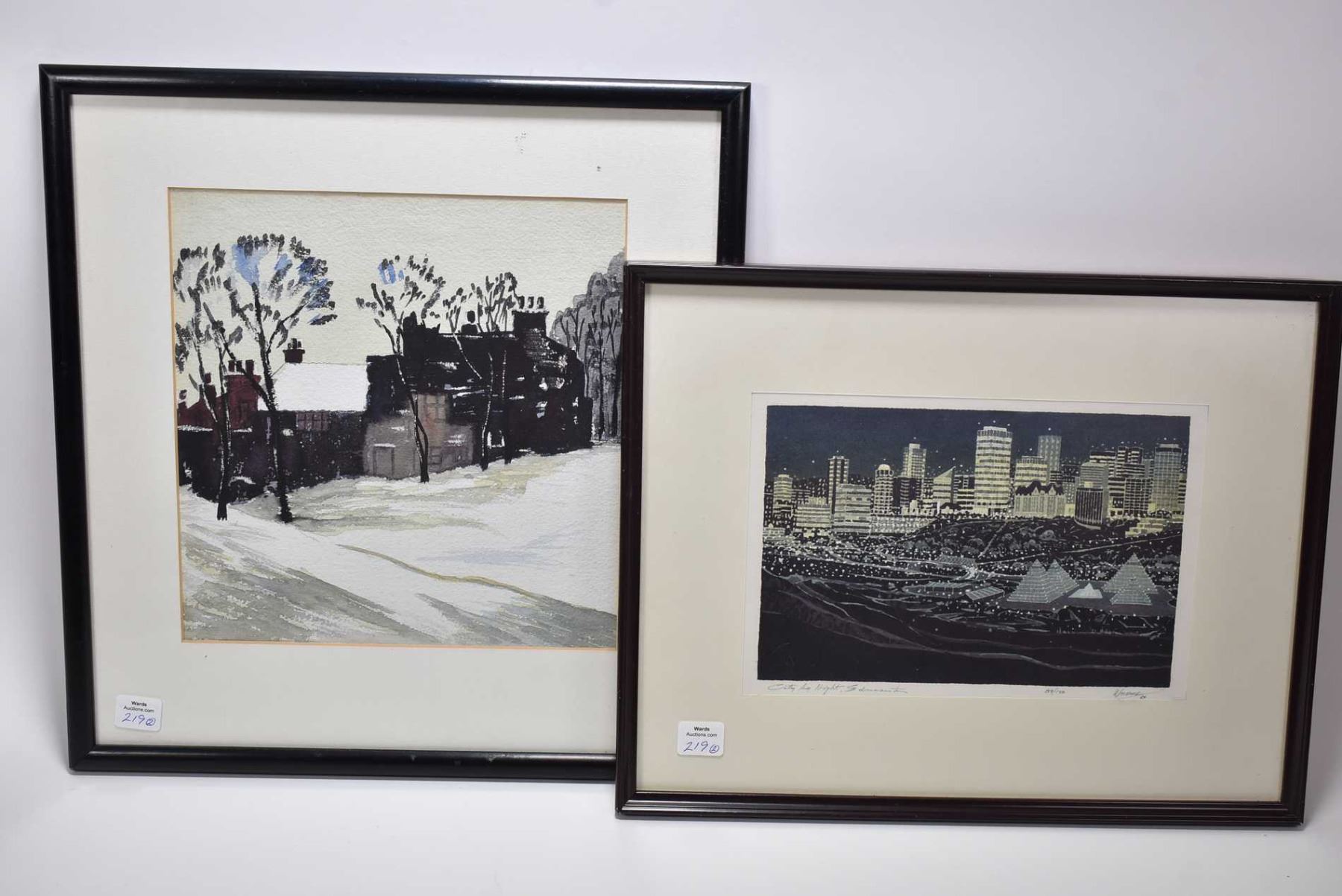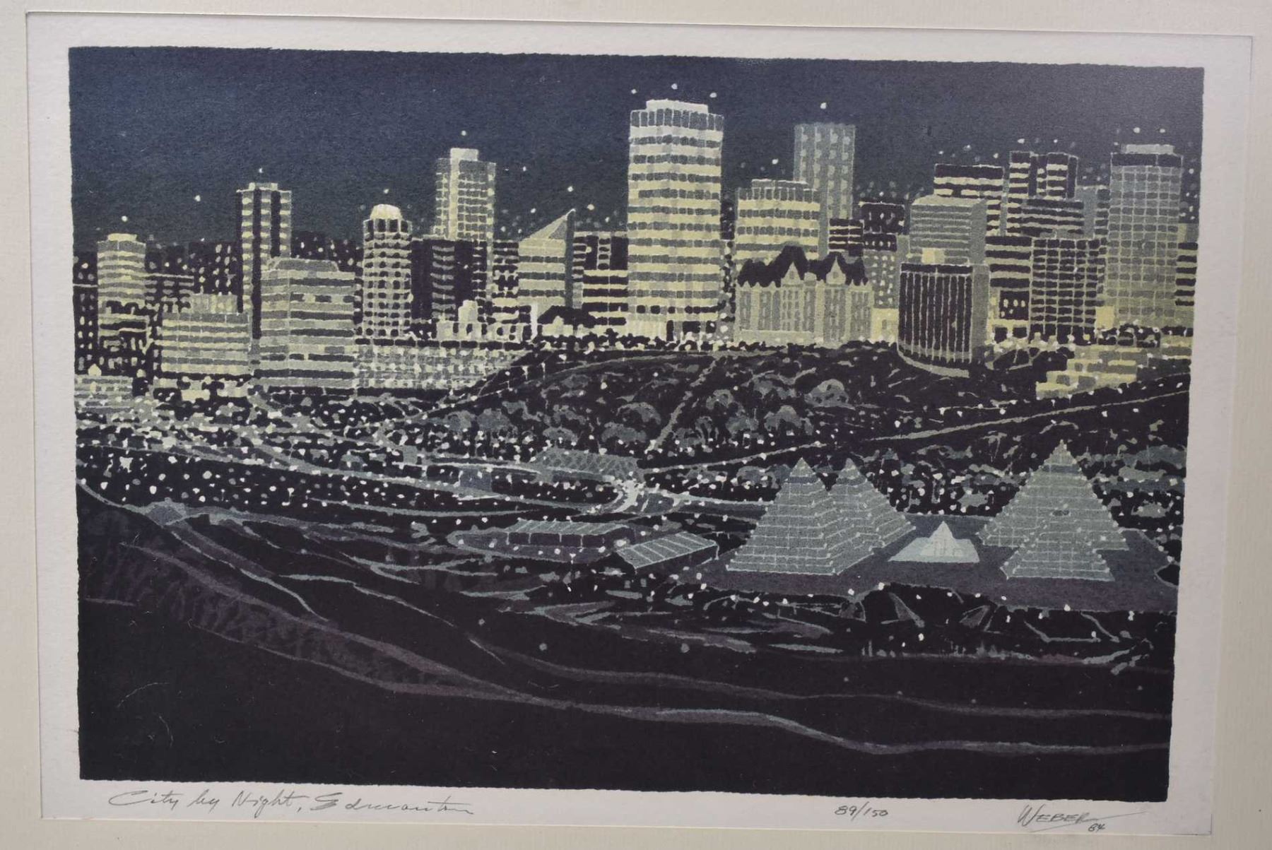 Framed original watercolour and gouache painting of a urban street scene, no artist signature seen, 10" X 10" and a framed block print "City By Night, Edmonton" pencil signed by artist Webber '84, 89/150
