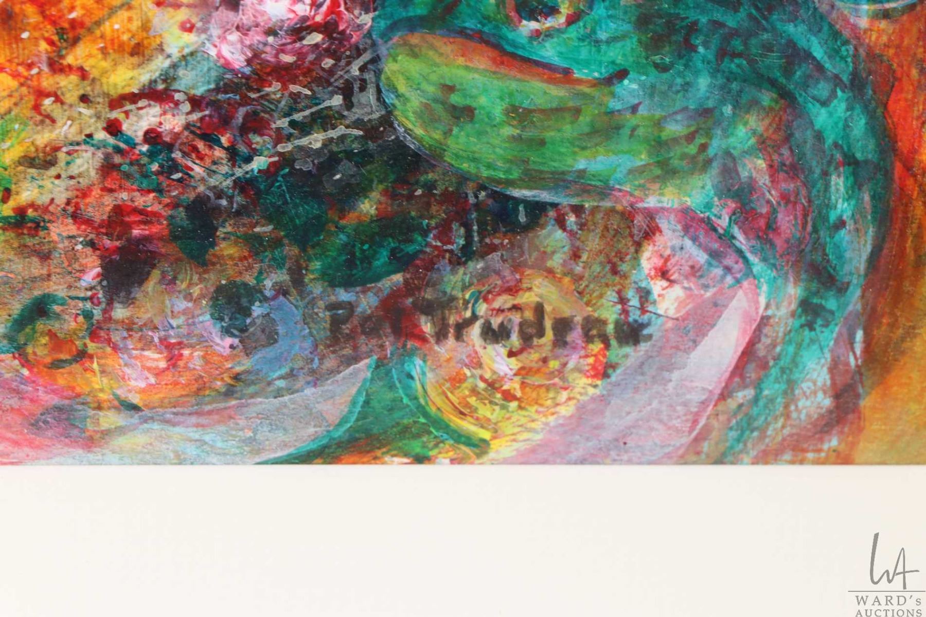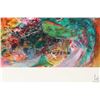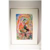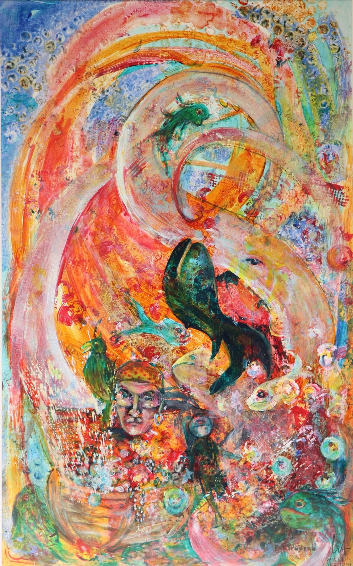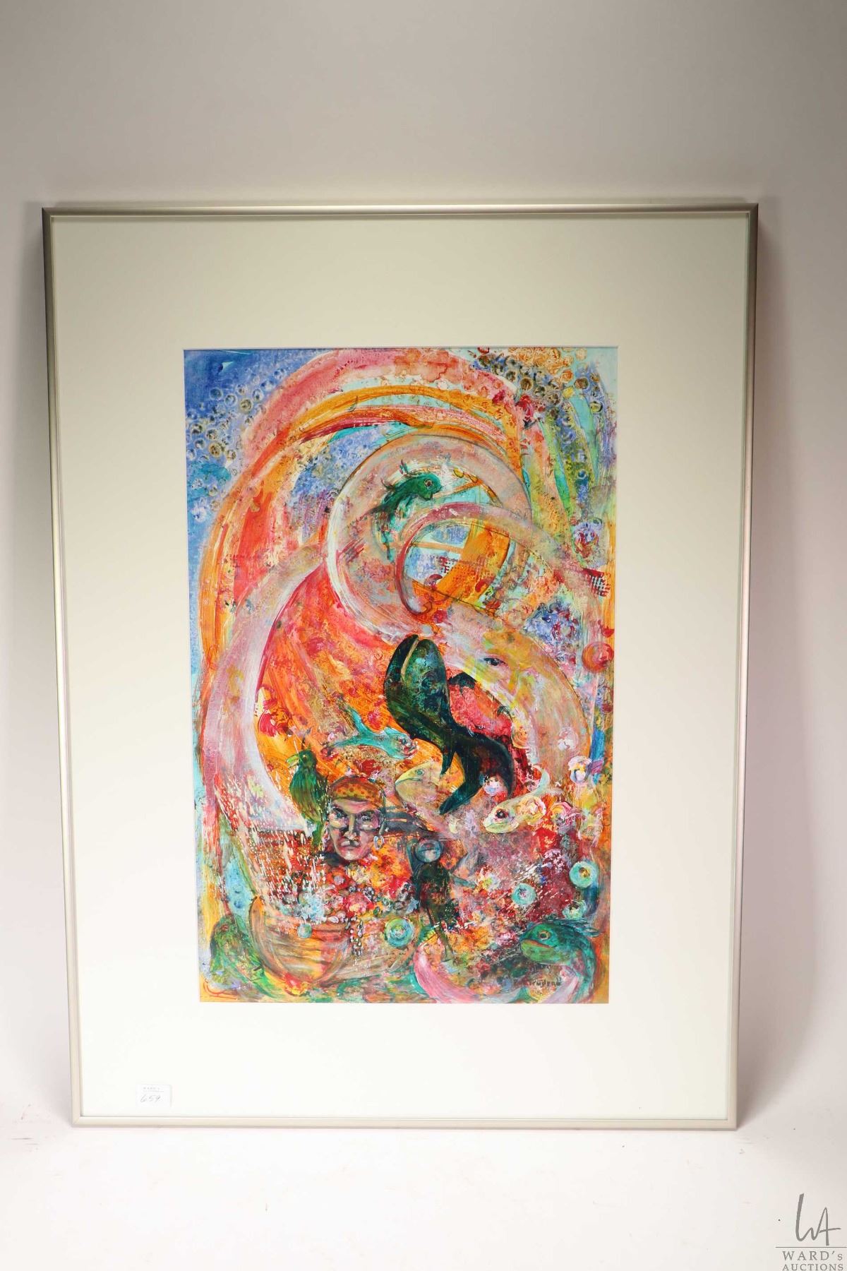 Framed original watercolour/gouache abstract painting featuring marine life, signed by artist Pat (Patricia) Trudeau 12 1/2" X 19"