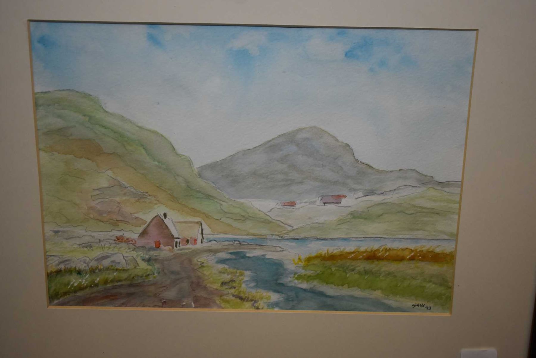 Framed original watercolour painting of a mountainscape with cottage initialled by artist S.A.M., 8" X 11"