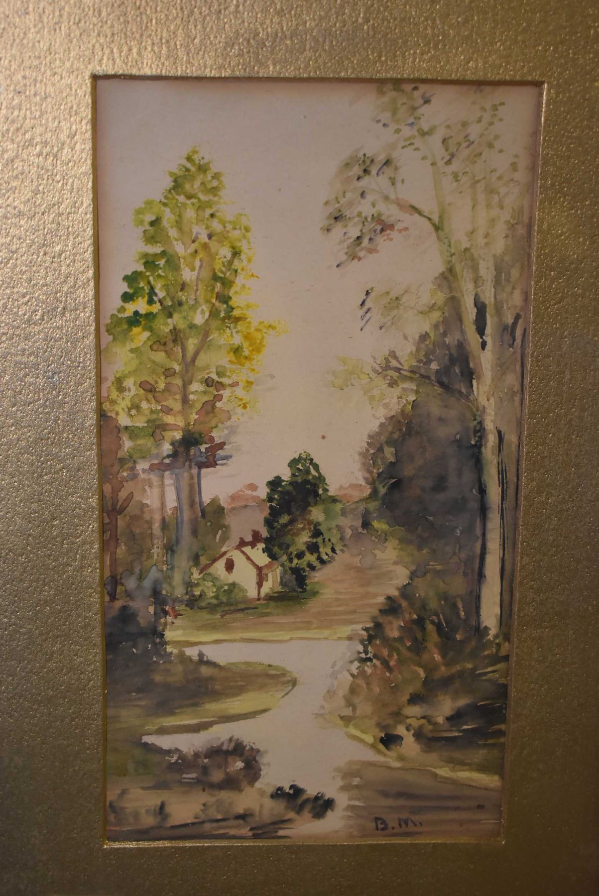 Framed original watercolour painting of a wooden clearing and cottage, initialled by artist B.M, 9" X 5"